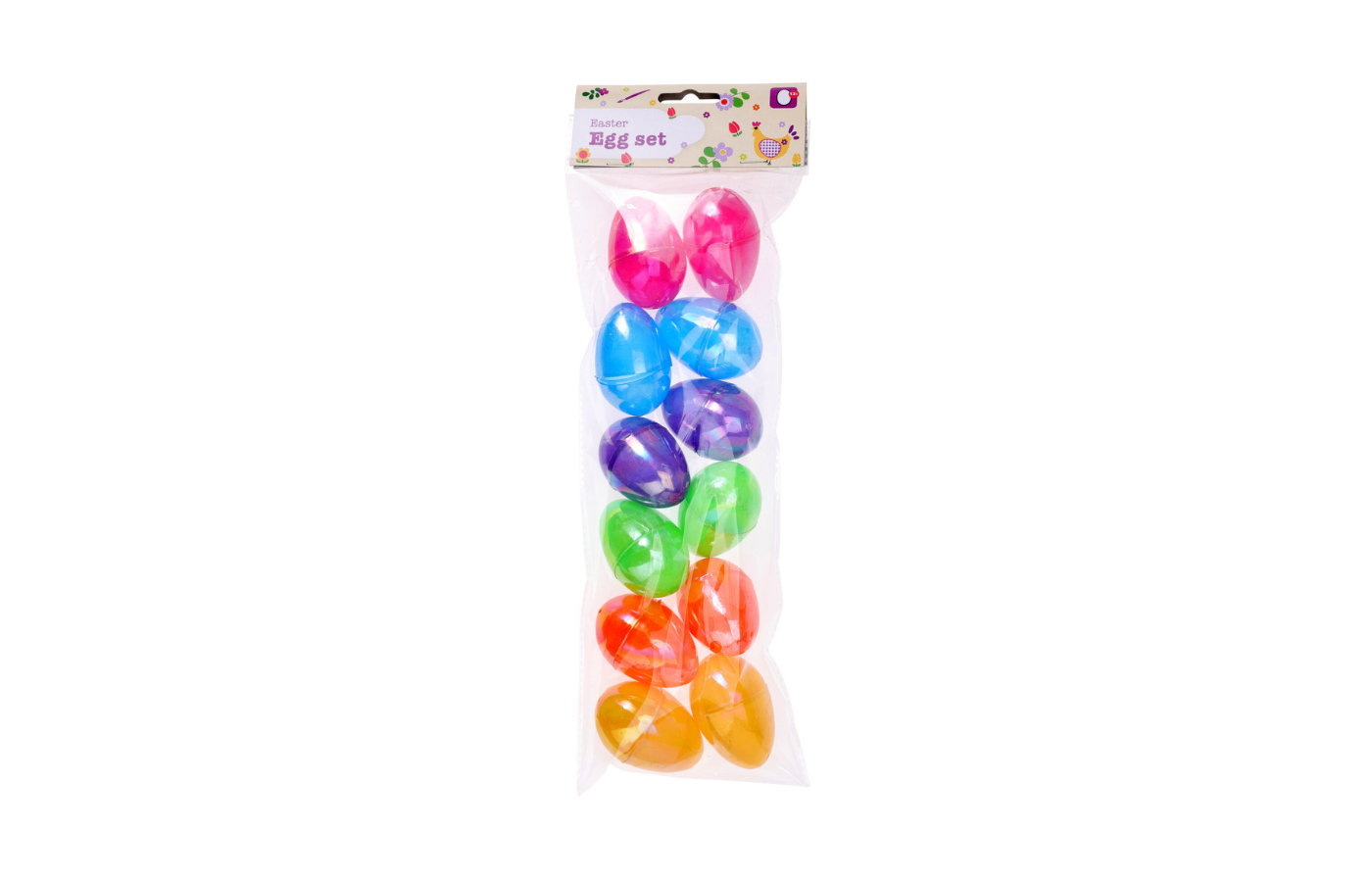 Ensemble de 12 œufs en plastique métallique de Pâques en 6 couleurs, qui peuvent être ouverts et remplis de petits objets. Amusant comme décoration ou à utiliser pour différents jeux.
