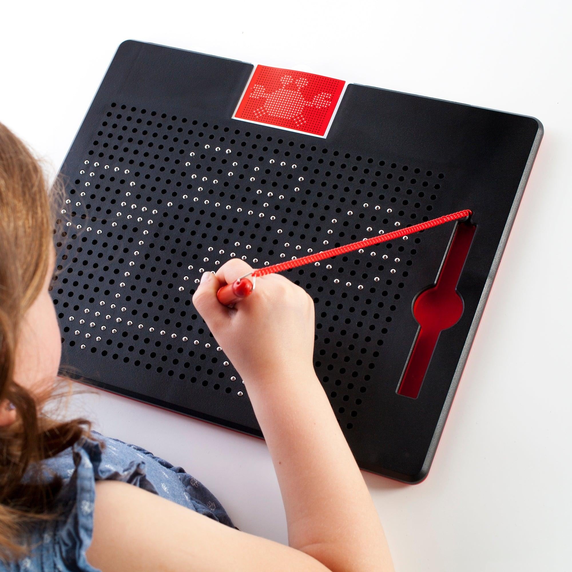 Les enfants créent une jolie création à l'aide du stylo magnétique en tirant les petites billes magnétiques vers la surface de la grille. Des formes géométriques, des animaux, des lettres, des véhicules et plus encore peuvent être créés. Excellente exercice pour la motricité fine en préparation à l'écriture.