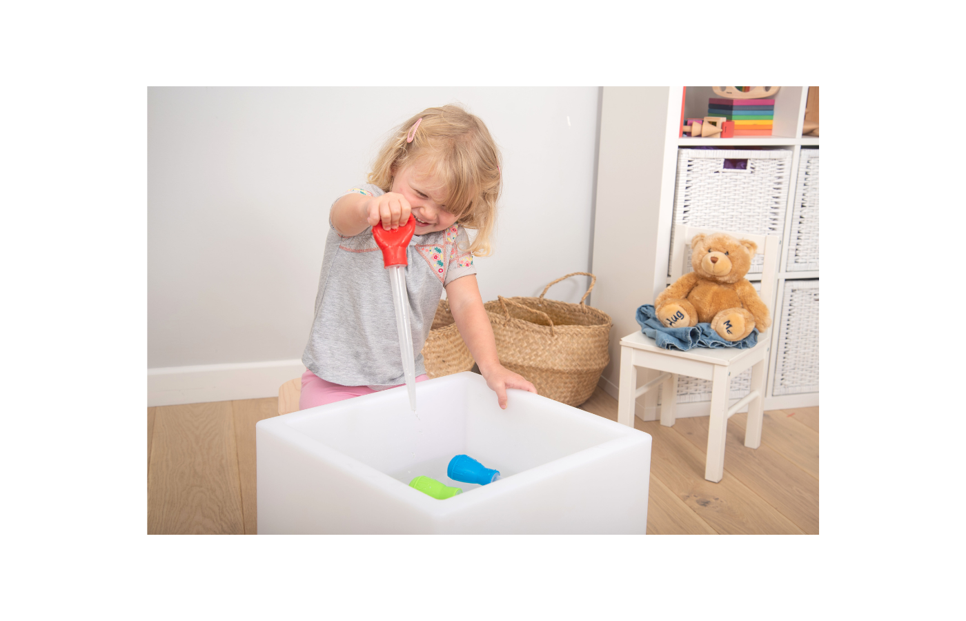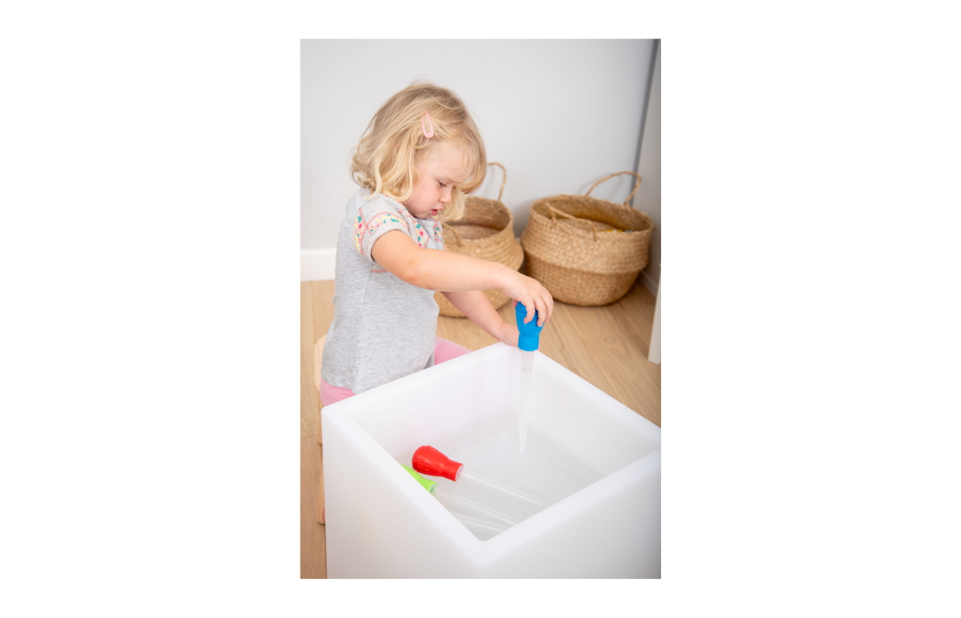 En saisissant un compte-gouttes et en le pressant dans la boule, les jeunes enfants peuvent développer la force de la main nécessaire pour d'autres actions, comme tenir un crayon pour écrire.