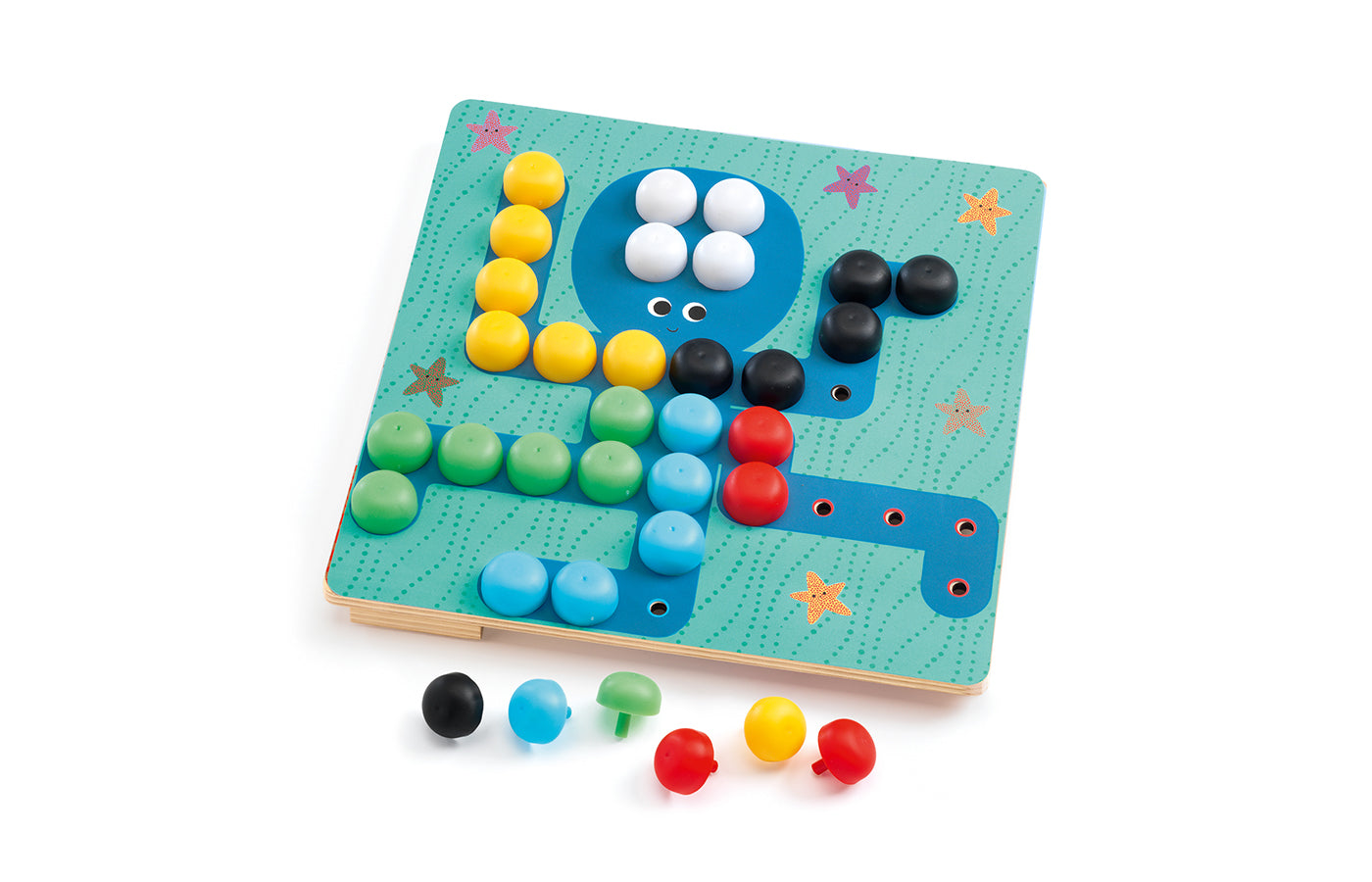 Les enfants peuvent trier les couleurs sur le tableau, reproduire les cartes modèles ou simplement faire leurs propres dessins avec ces perles colorées.