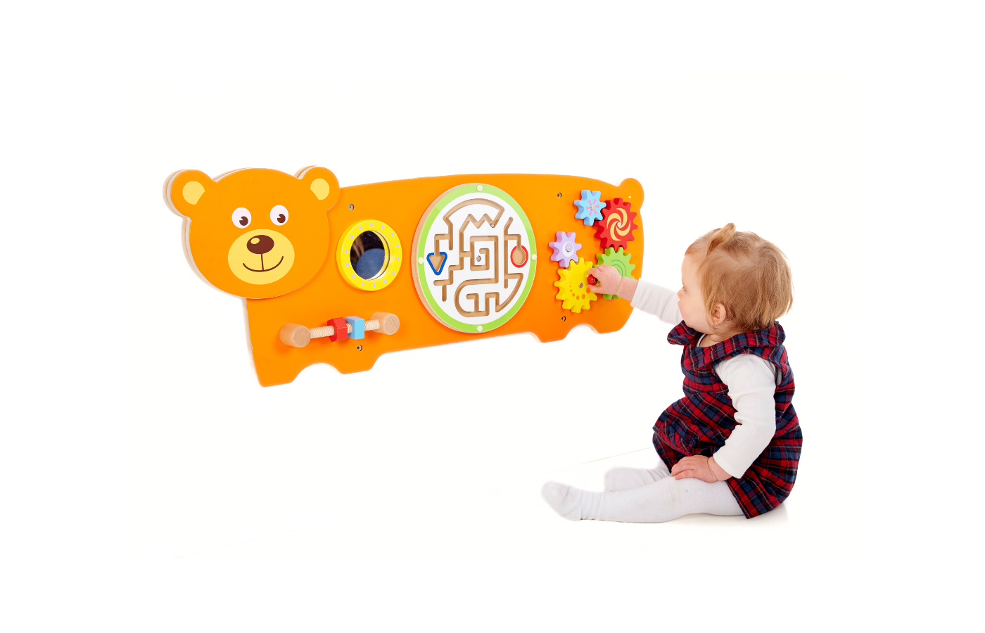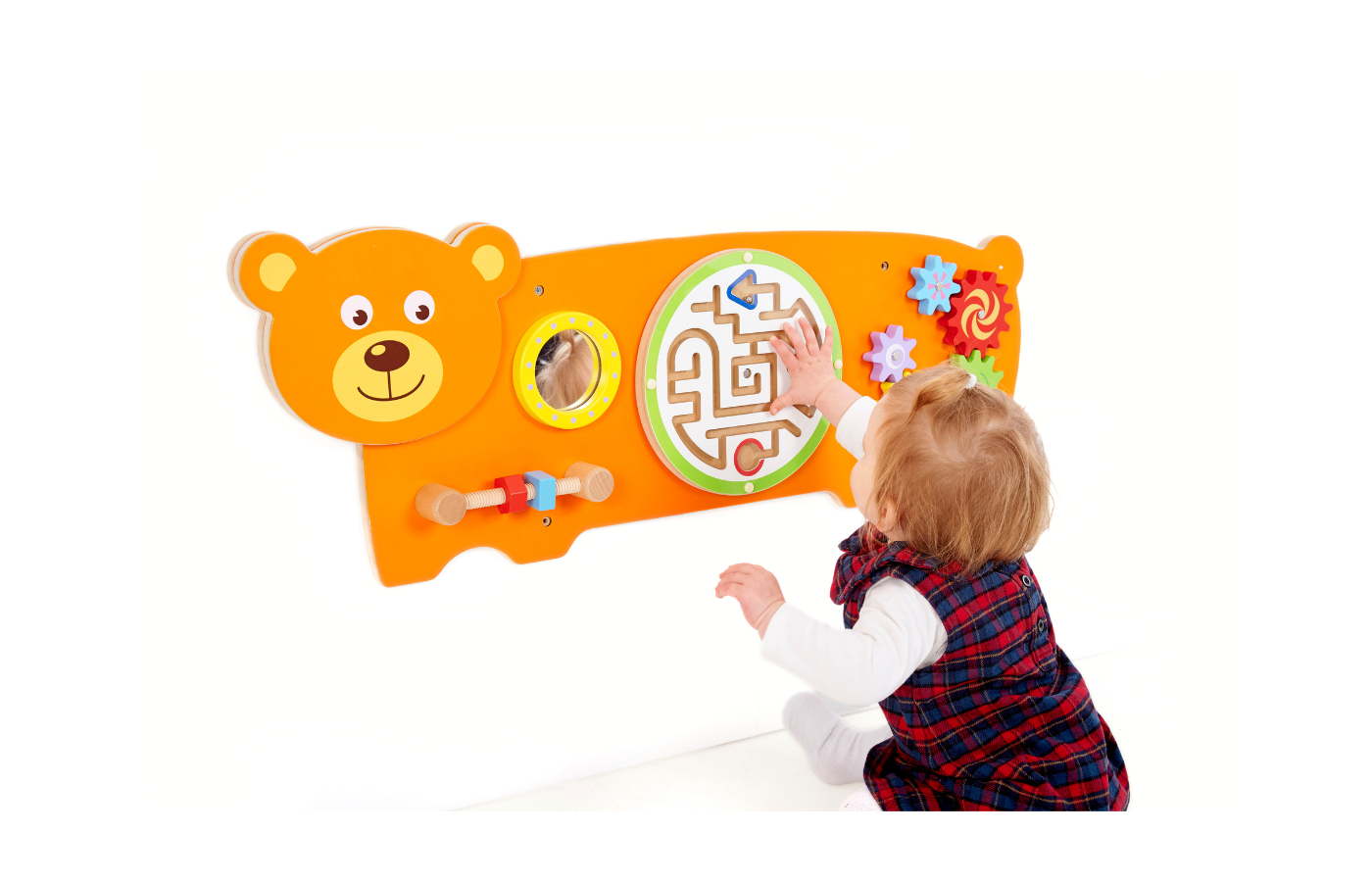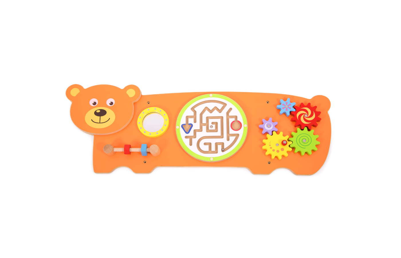 Panneau d'activité en bois en forme d'ours. Le panneau a différentes activités manipulatives pour stimuler la coordination main-œil et la motricité fine.