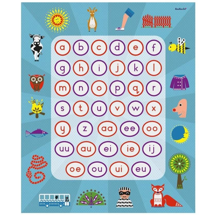 Apprendre les lettres et pratiquer des mots de manière ludique et active. Sur le bord du tapis de jeu des lettres, il y a des images de mots courts et phonétiquement corrects. Un enfant désigne une image et l'autre enfant forme le mot en se tenant sur les bonnes lettres ou combinaisons de lettres avec ses mains et ses pieds. Parvient-il à épeler le mot correctement ?