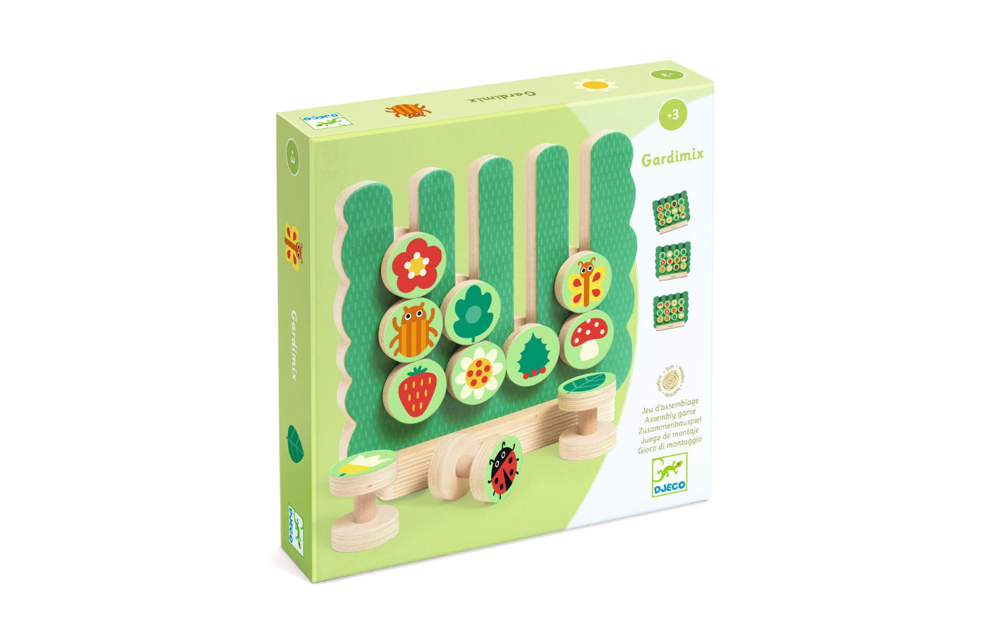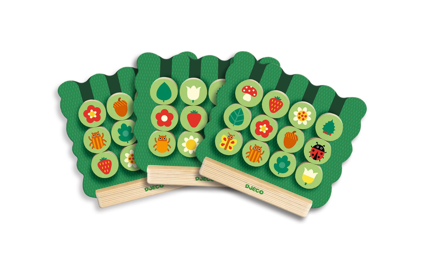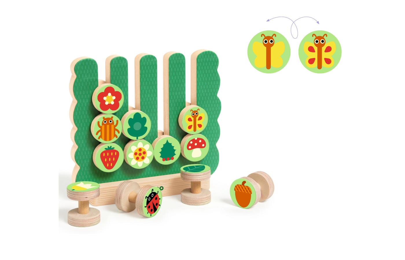 L'enfant choisit une carte de tâche, sélectionne les bons jetons en bois et les fait glisser dans le support pour reproduire parfaitement le modèle sur la carte.