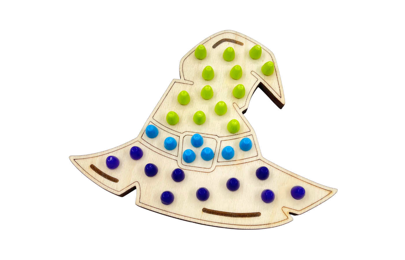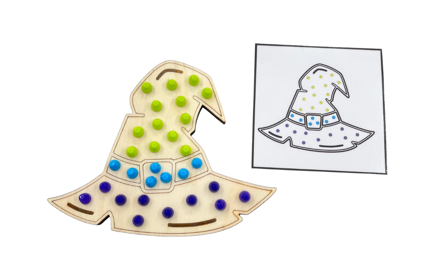 Geef de heksenhoed zijn mooie kleuren terug! Spel met betrekking tot ruimtelijke oriëntatie en fijne motoriek. De kinderen ordenen de gekleurde parels op de heksenhoed op basis van opdrachtkaarten. In de 20 opdrachtkaarten is er differentiatie verwerkt. (zelf afdrukken en lamineren). Een vrije creatie maken is natuurlijk ook mogelijk.