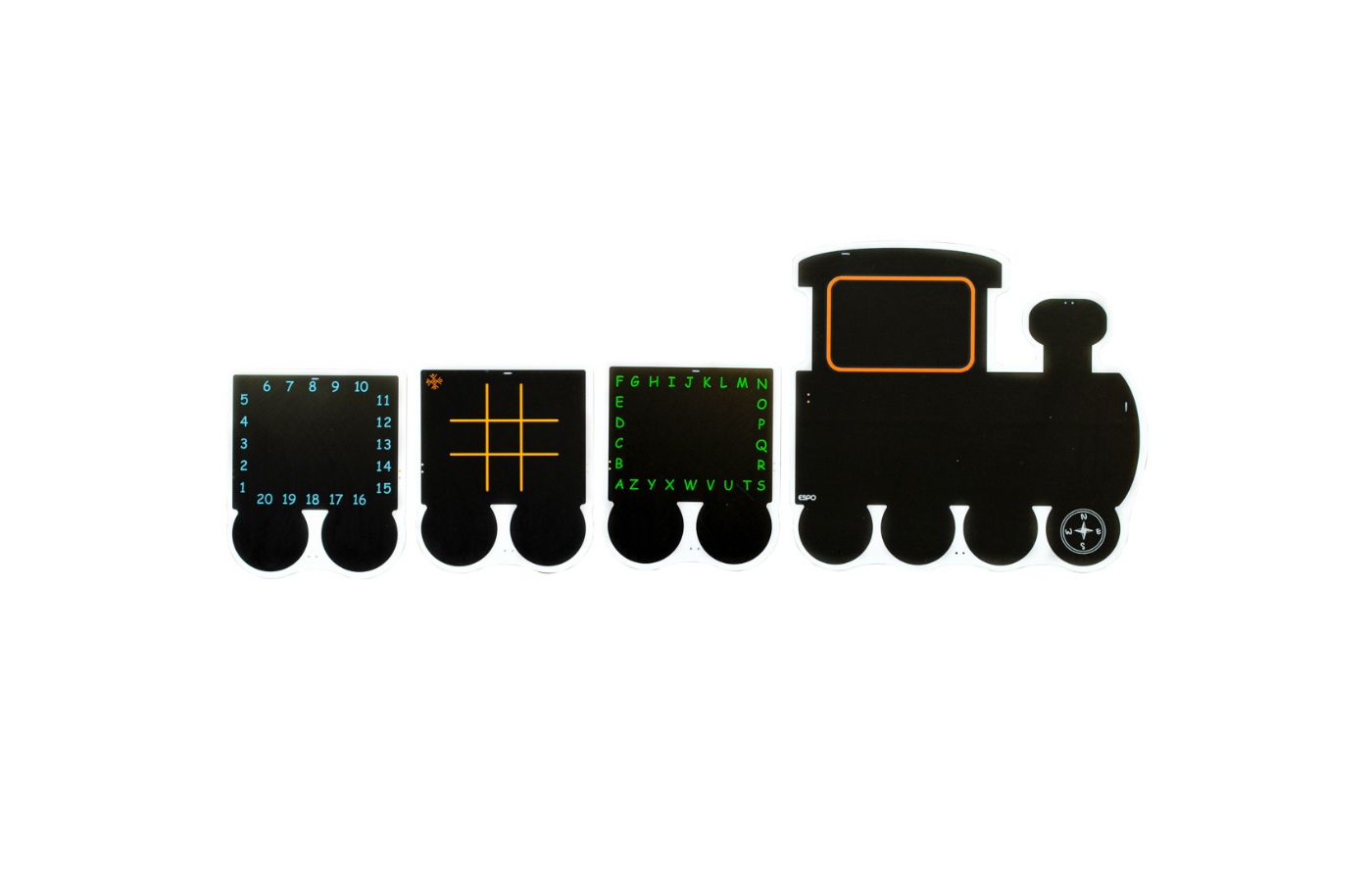Sur ces tableaux noirs colorés en forme de train, composé d'une locomotive et de 3 wagons, il est encore plus amusant de réaliser des dessins imaginatifs. Les 3 wagons offrent différentes possibilités. Un wagon contient des lettres, un autre des chiffres jusqu'à 20 et un troisième un plateau de jeu OXO.