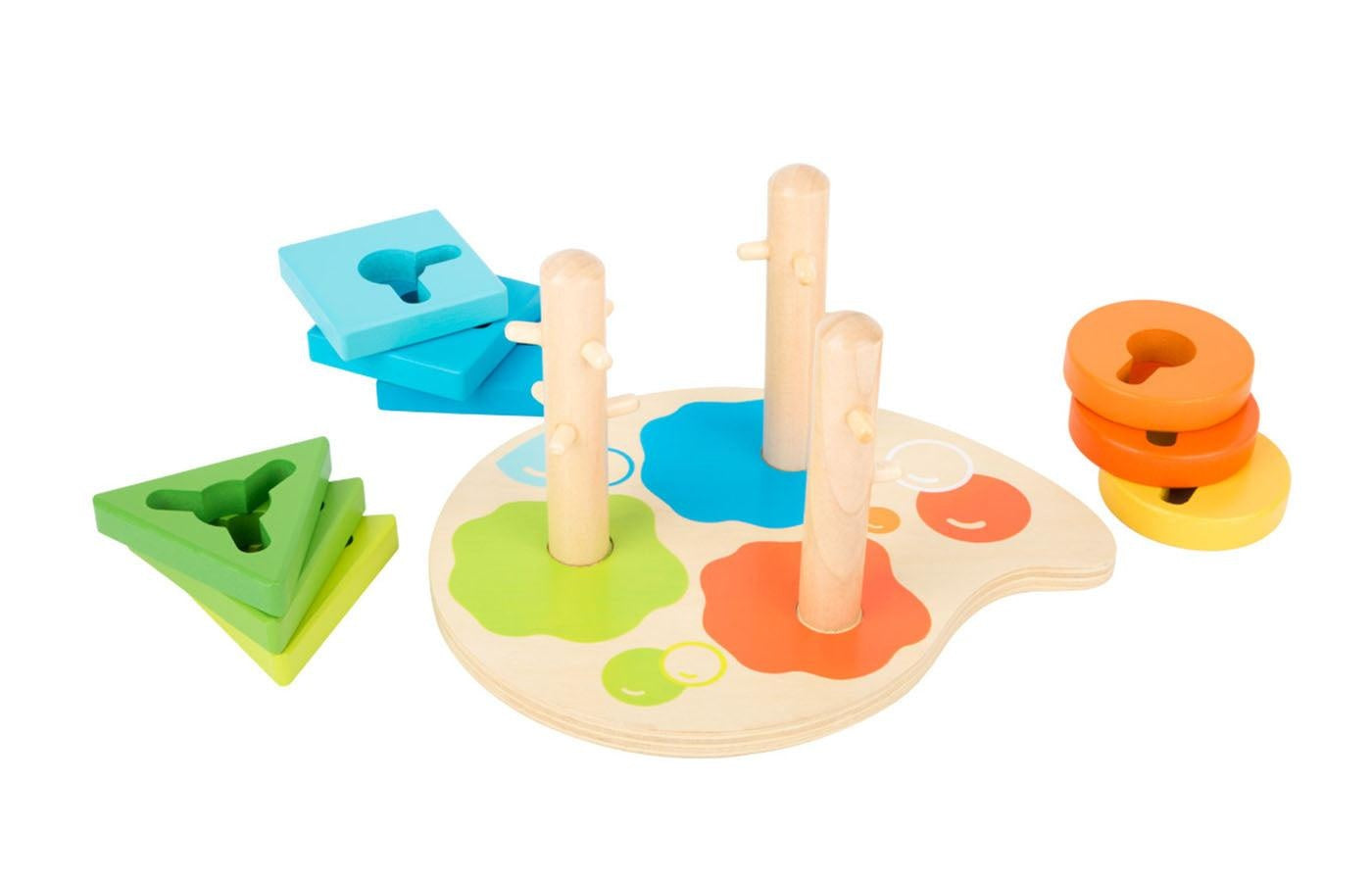 Un jeu motorisé aux couleurs vives ! De jeunes artistes essaient de trier les formes géométriques en bois (cercle, carré et triangle) sur la bonne tache de peinture sur la palette du peintre. Les formes doivent être placées de manière à éviter les obstacles sur les poteaux en bois mobiles. Qui relèvera ce défi ?