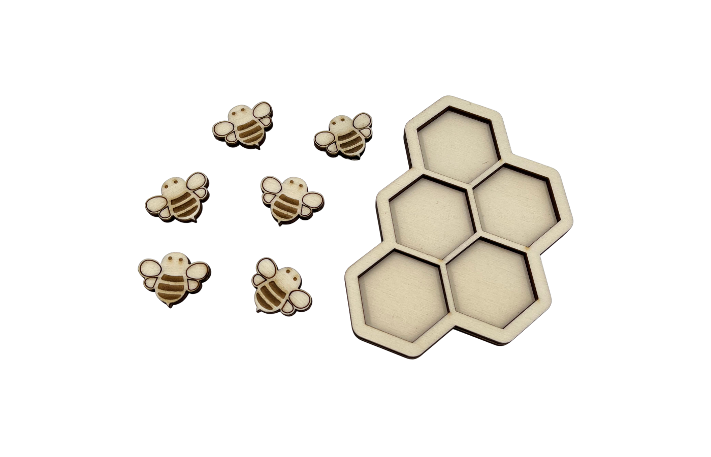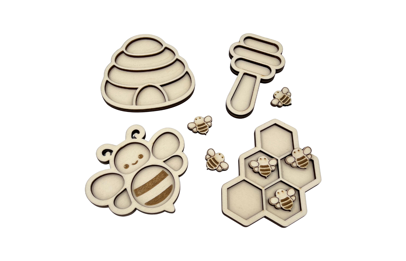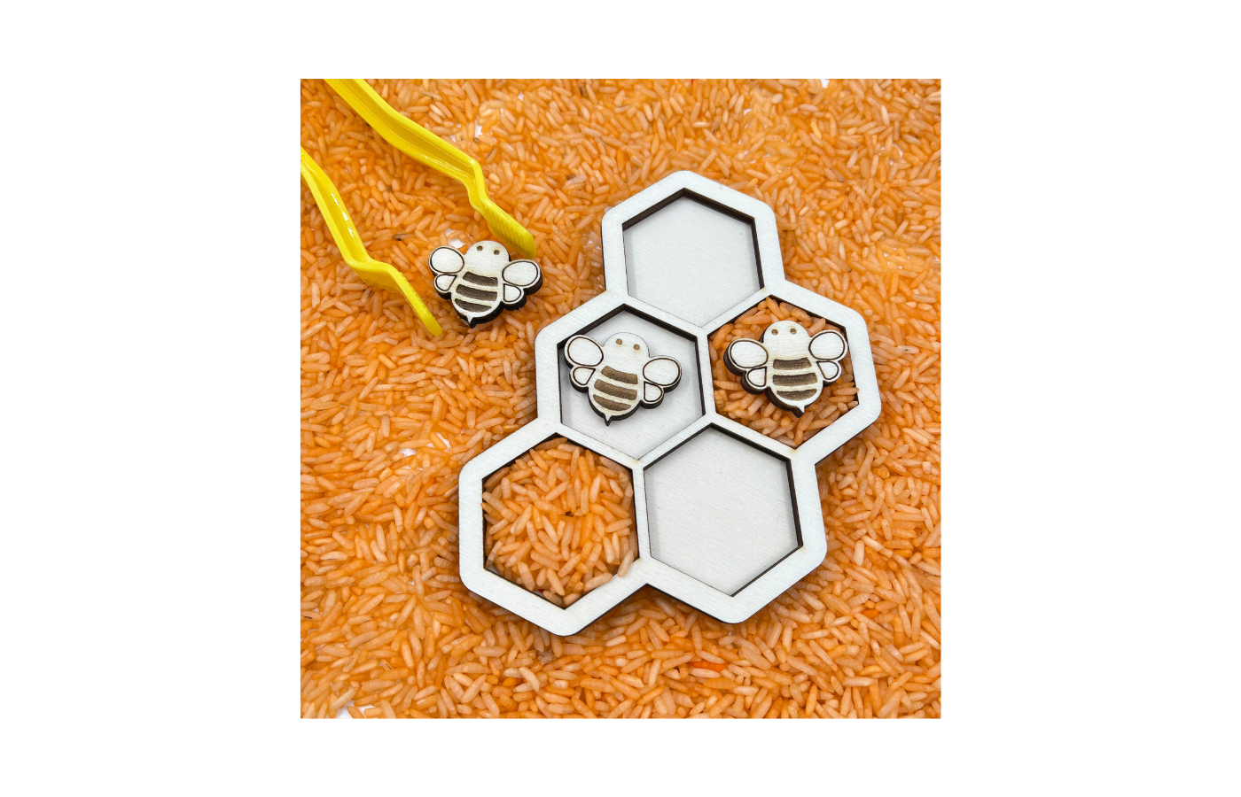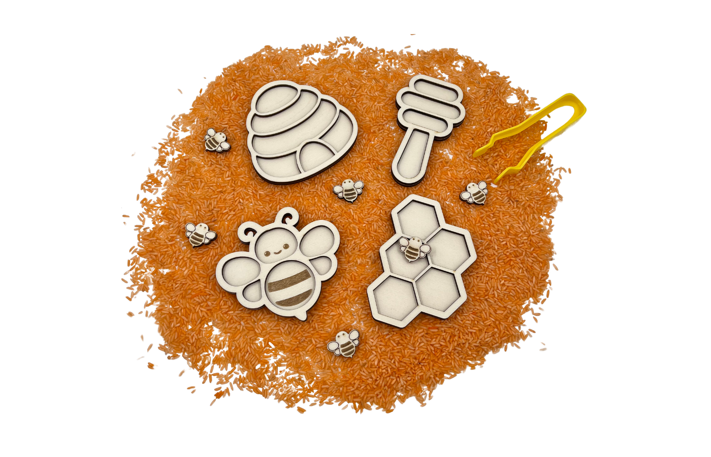 Formes de jeu ou plateaux de jeu sur le thème des abeilles (une abeille, une cuillère à miel, une ruche et une ruche). Parfait à remplir avec des matériaux secs tels que du riz à jouer, des pois chiches, du sable fin,... dans un format mignon.