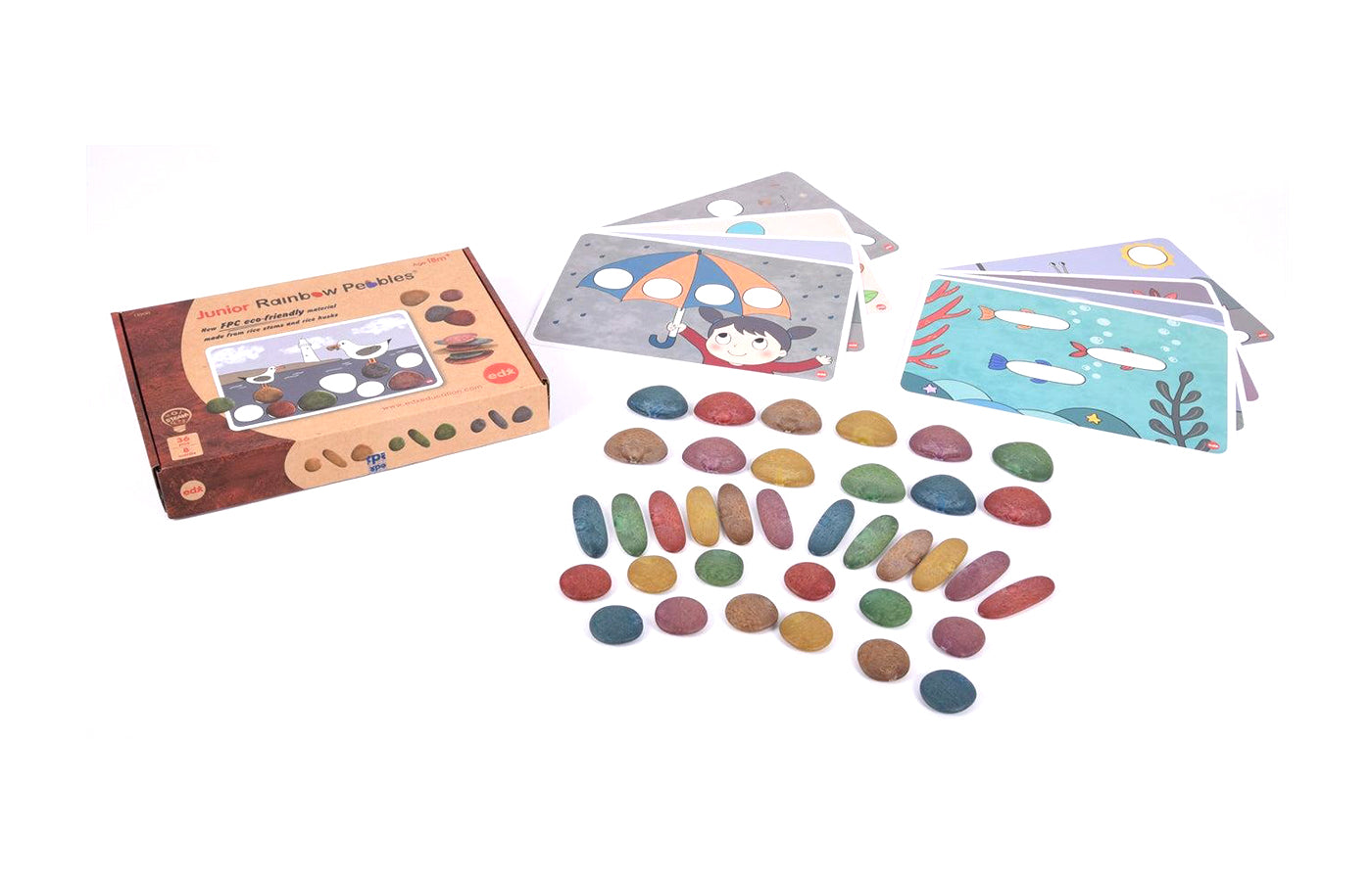 The eco rainbow stones are made of natural materials (FPC). An agricultural waste product of rice stalks and rice husks. Each pebble has its own unique natural grain and the double-sided assignment cards are designed in natural color tones to match the pebbles. Ideal for developing fine motor skills, counting and sorting and creative design.