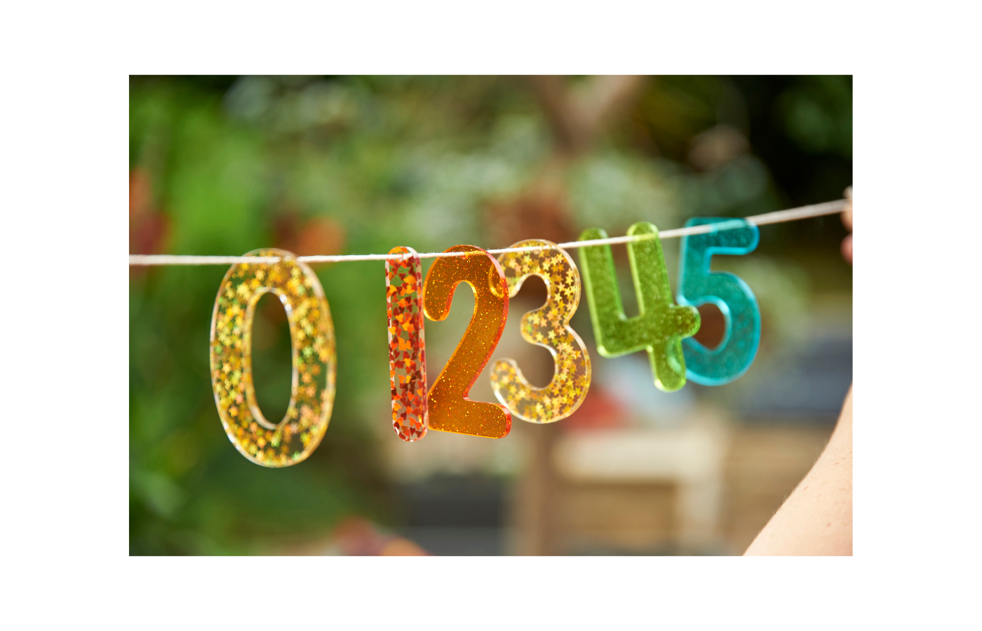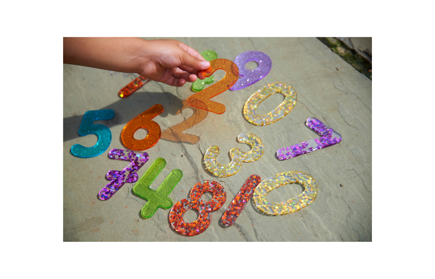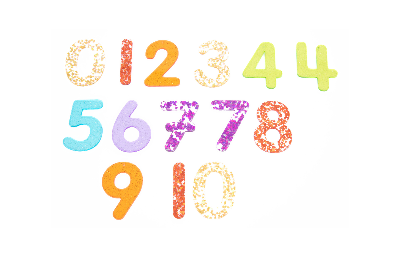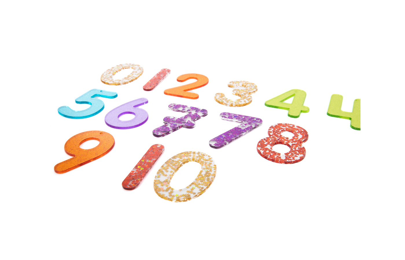 A set of 14 sparkling glitter numbers made from colorful, translucent acrylic. The set contains two variants of the numbers 4 and 7. An extra number 0 and 1 has also been added so that the number 10 can also be made. They are ideal for use on a light panel to promote number recognition. They feature a 2.5mm hole at the top balance point, so they can be hung against a window or outside to create fascinating color glitter shadows.