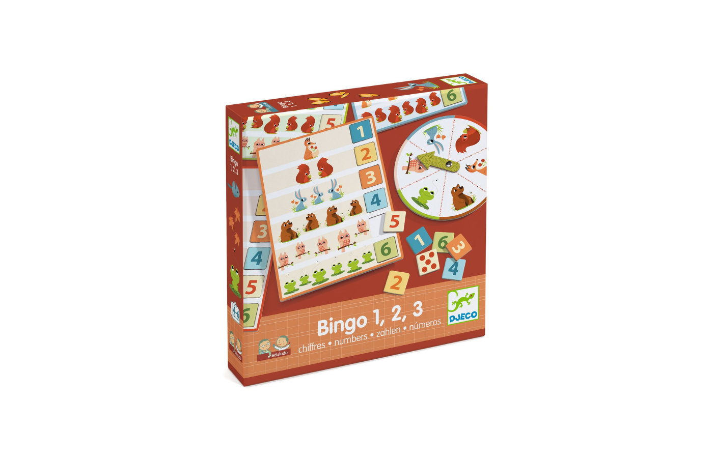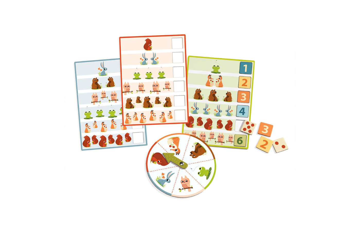 Bingo is a combination and collection game with the theme of numbers and forest animals. Each player chooses a board and places it in front of him. The chips and the wheel are placed in the center of the table. The youngest player starts and spins the wheel. He/she takes the token indicated by the wheel and places it on his/her board. Then it is the next player's turn and so the game continues. The player who fills his board first wins the game.