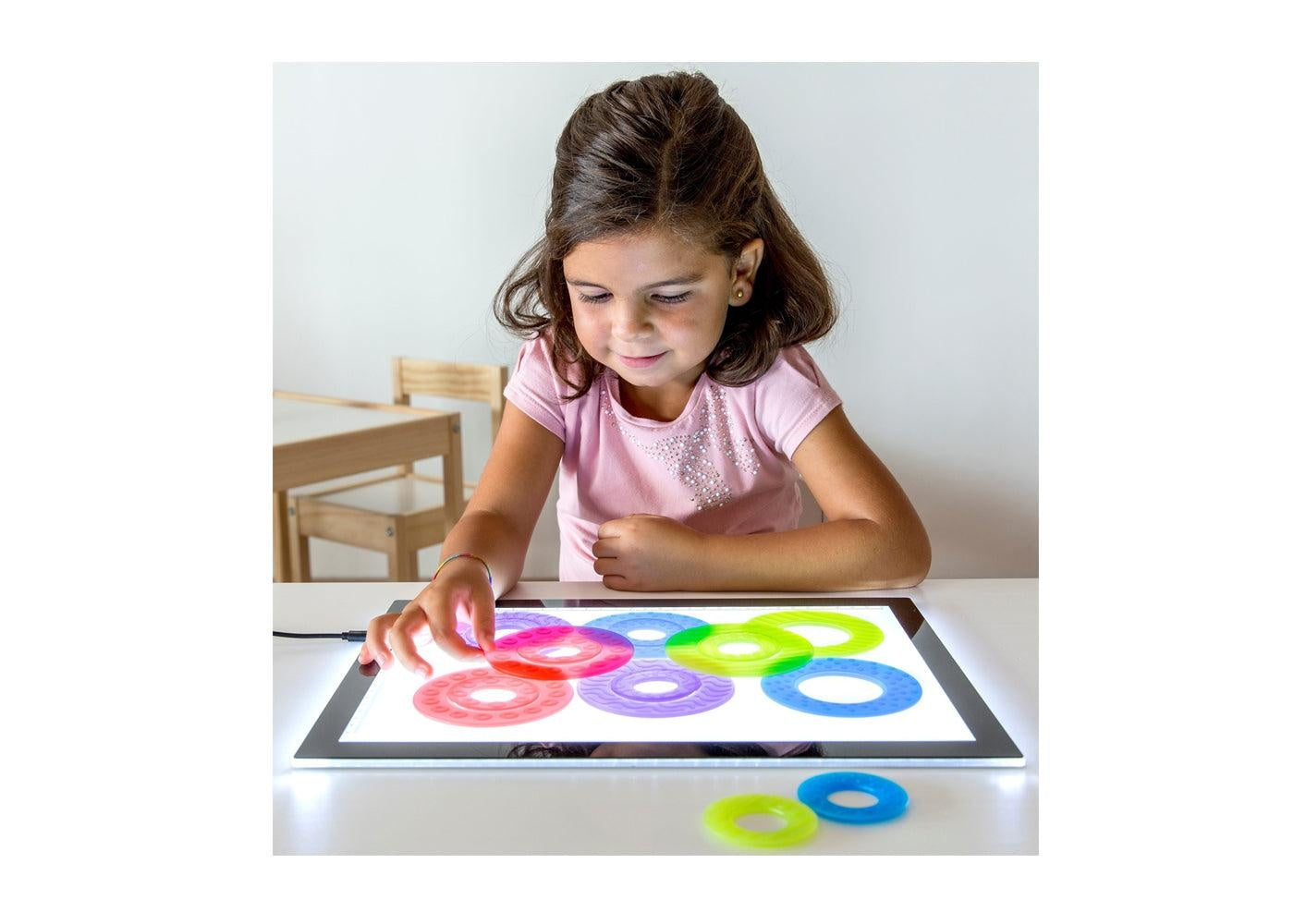 Clear colored rings. A set of 16 clear rings and 12 task cards. The assignment cards are structured in different themes and different levels of difficulty. The rings come in 4 different colors and 2 sizes. This item is very suitable for use on the light table.