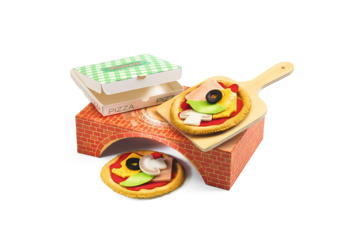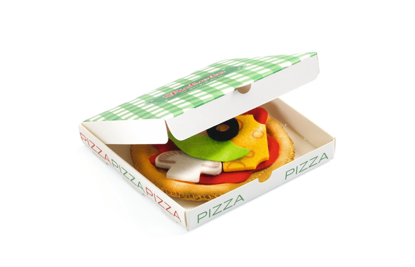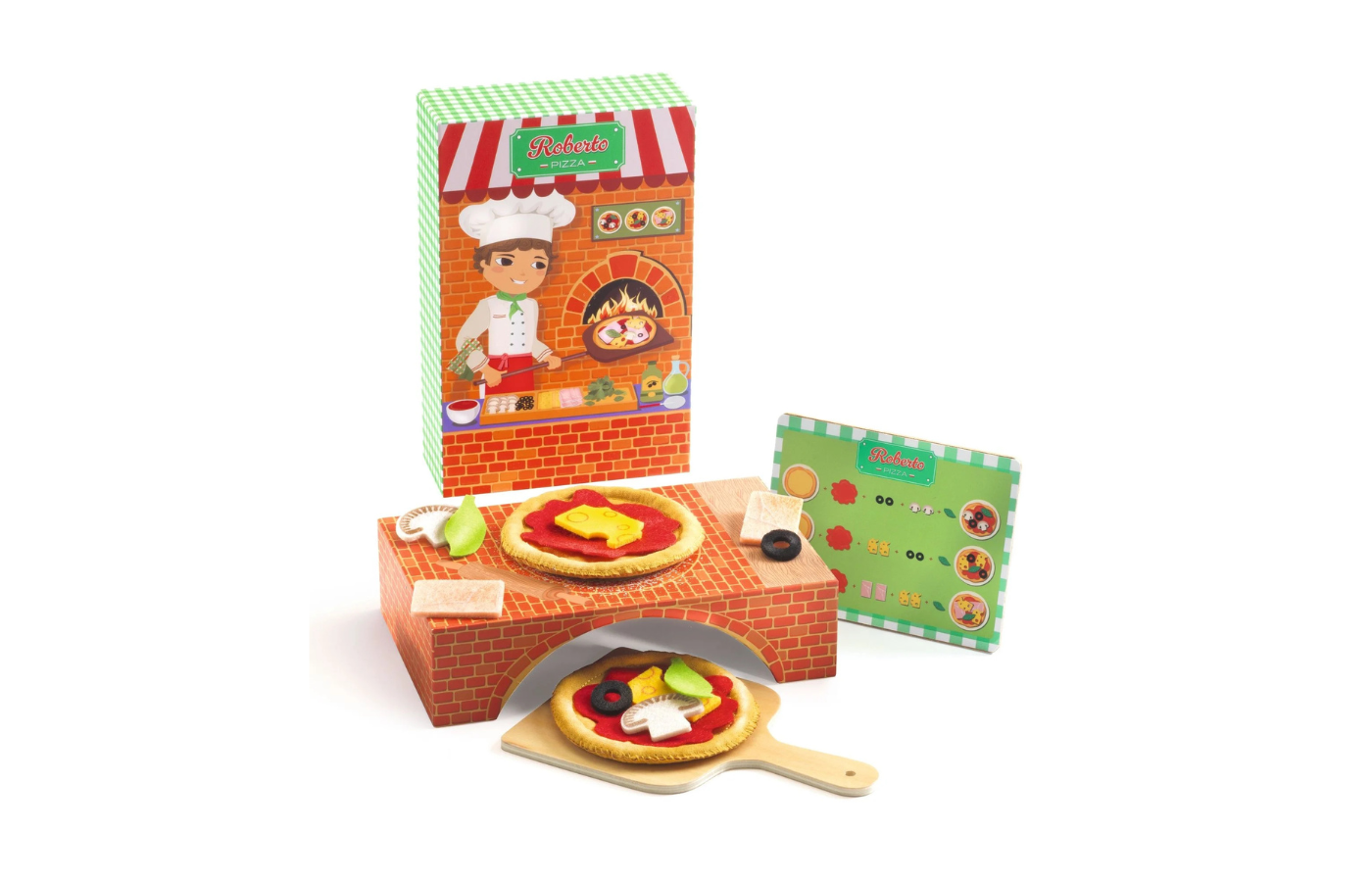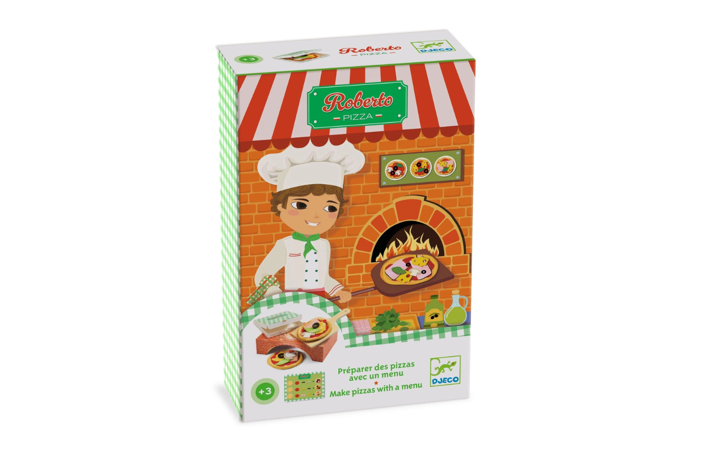 With the help of a menu, children can choose their own toppings for the pizza. Use the spatula to place them in the oven. The wooden storage box can be used as an oven.