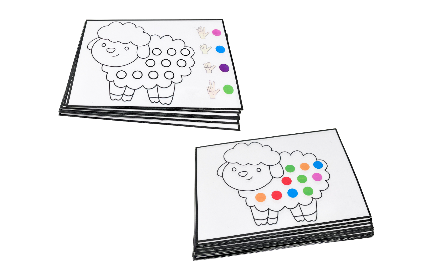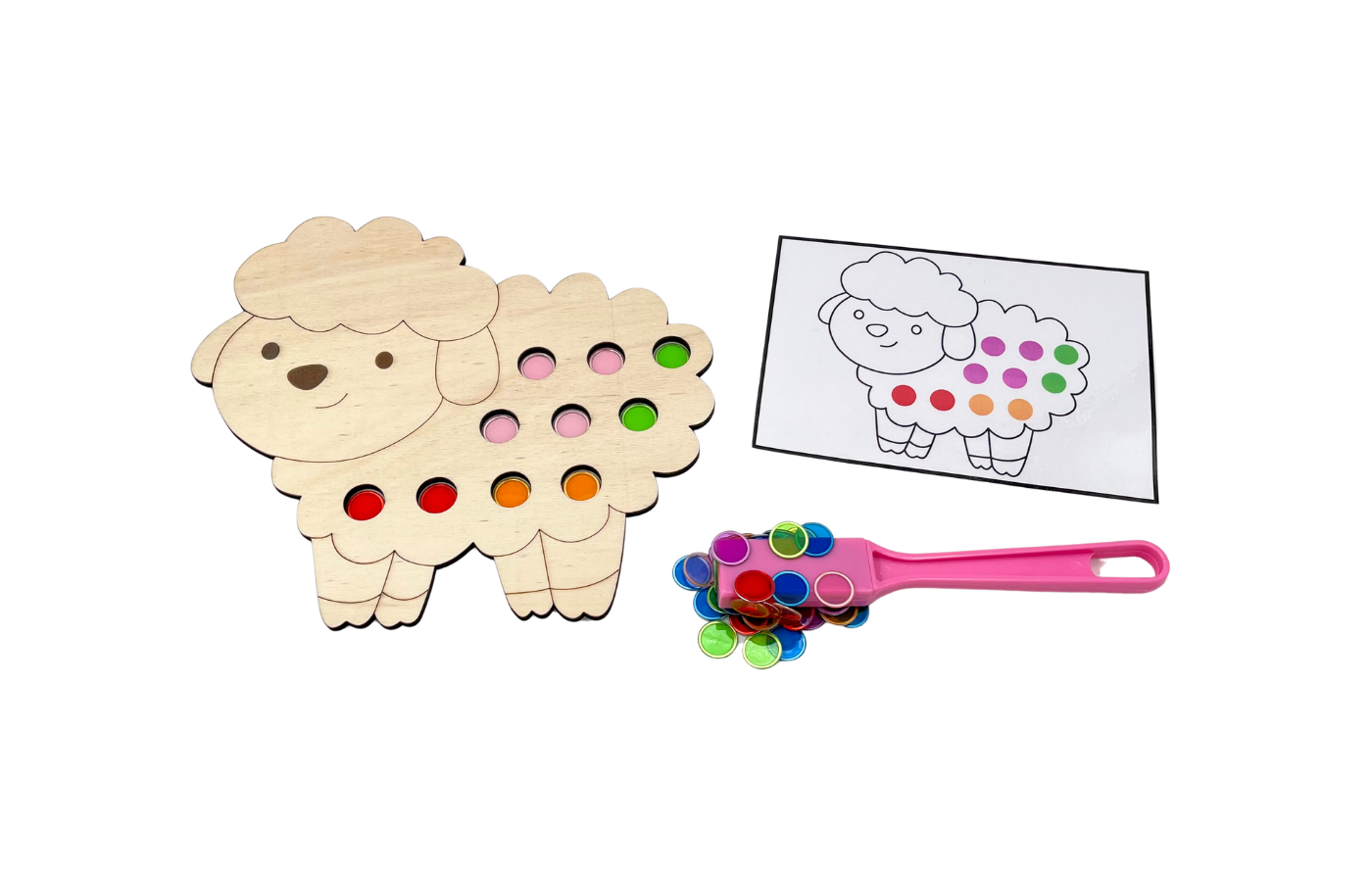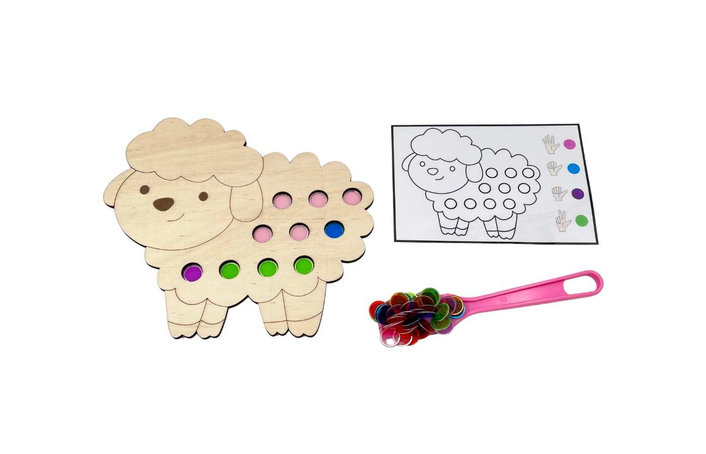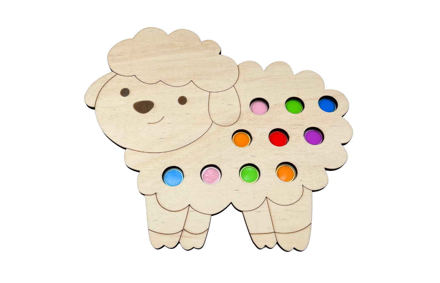 Fine motor skills game related to spatial orientation and math. Children place magnetic tokens in the holes of the sheep based on a task card. Using the magnetic stick, children can funnily remove the tokens from the game board.