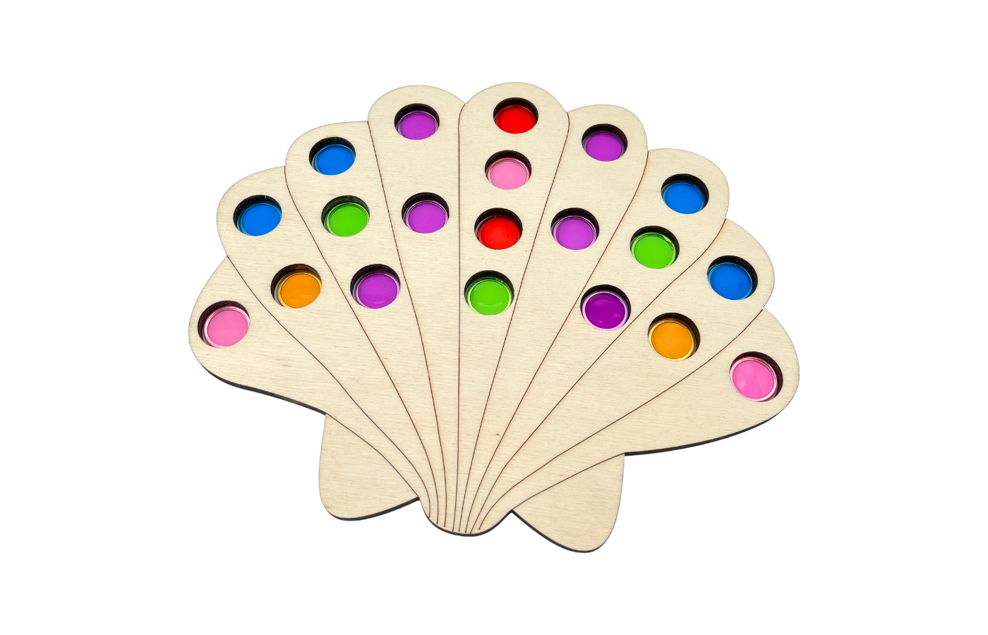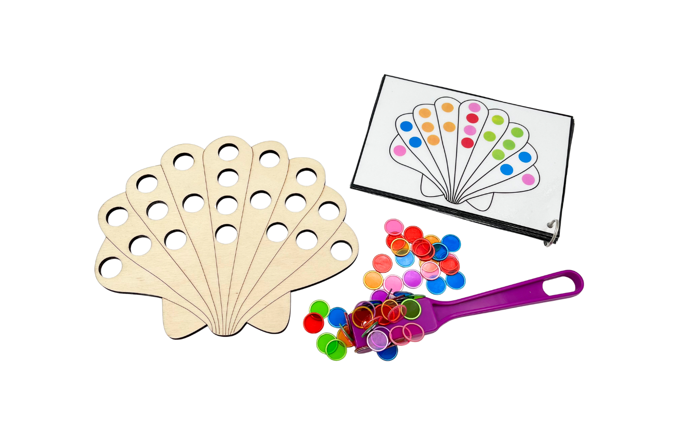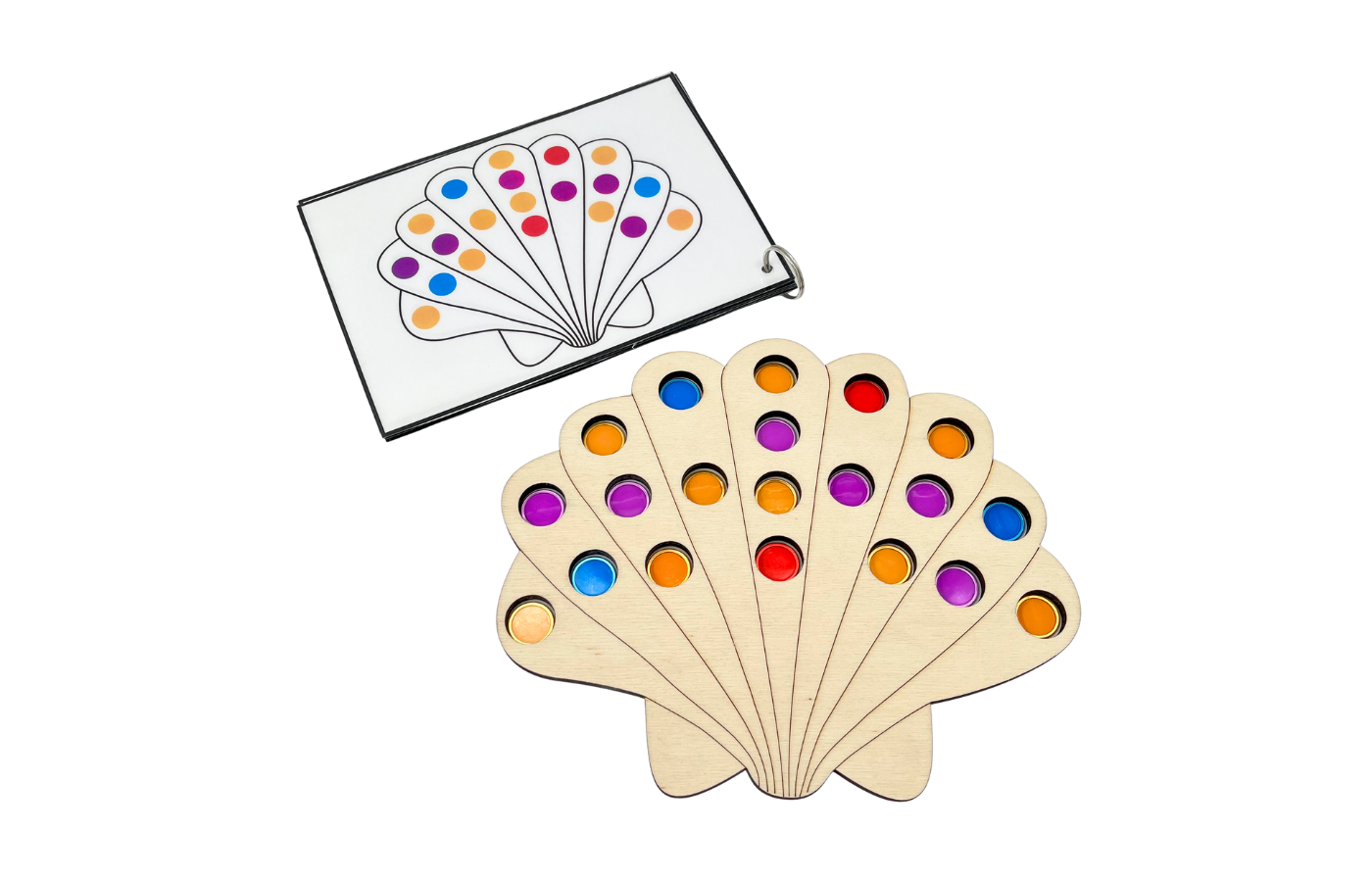 Fine motor play related to spatial orientation and math. Children place magnetic tokens in the holes of the shell, following a task card. Using the magnetic stick, children can funnily remove the tokens from the game board.