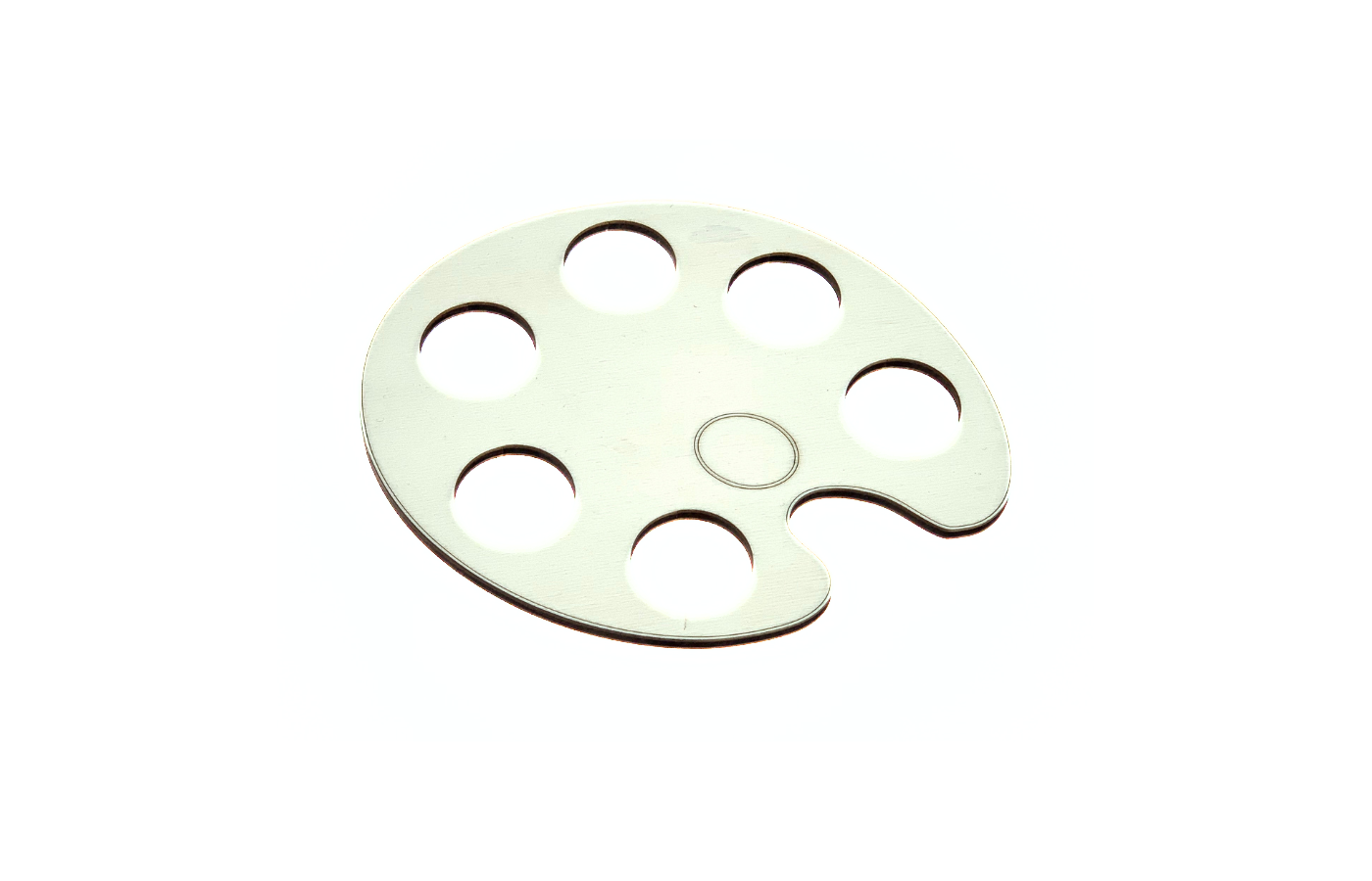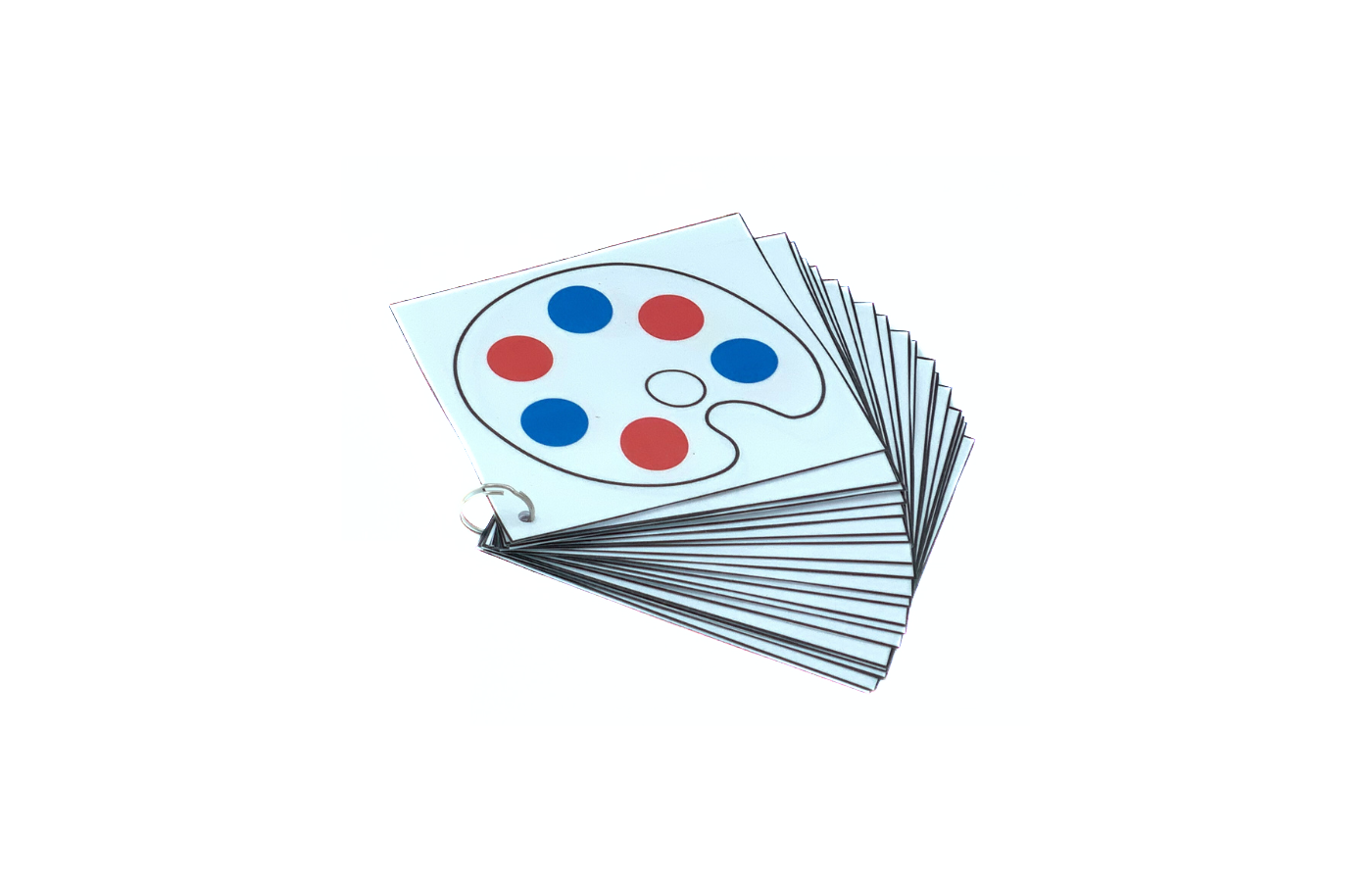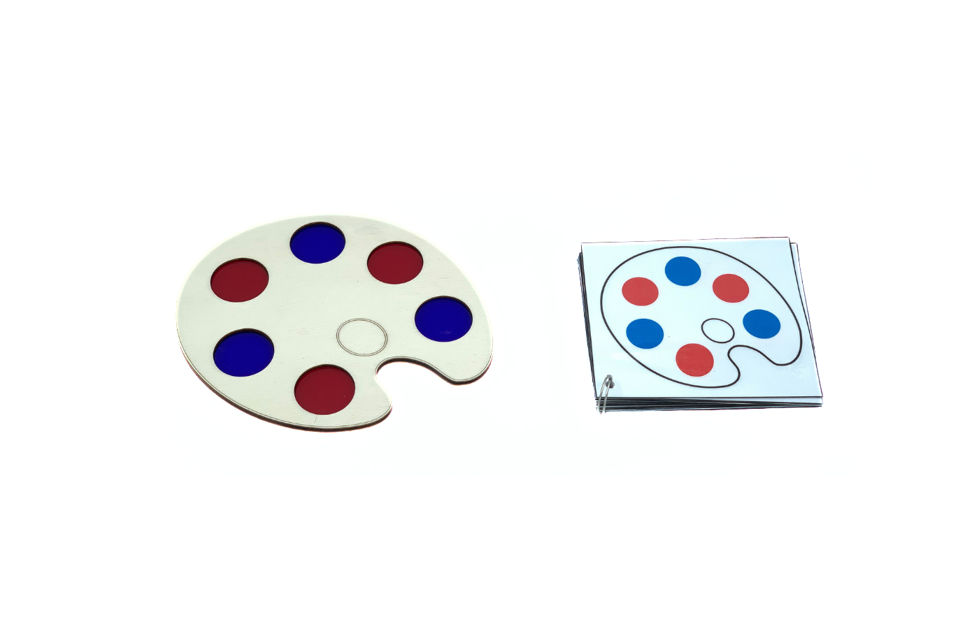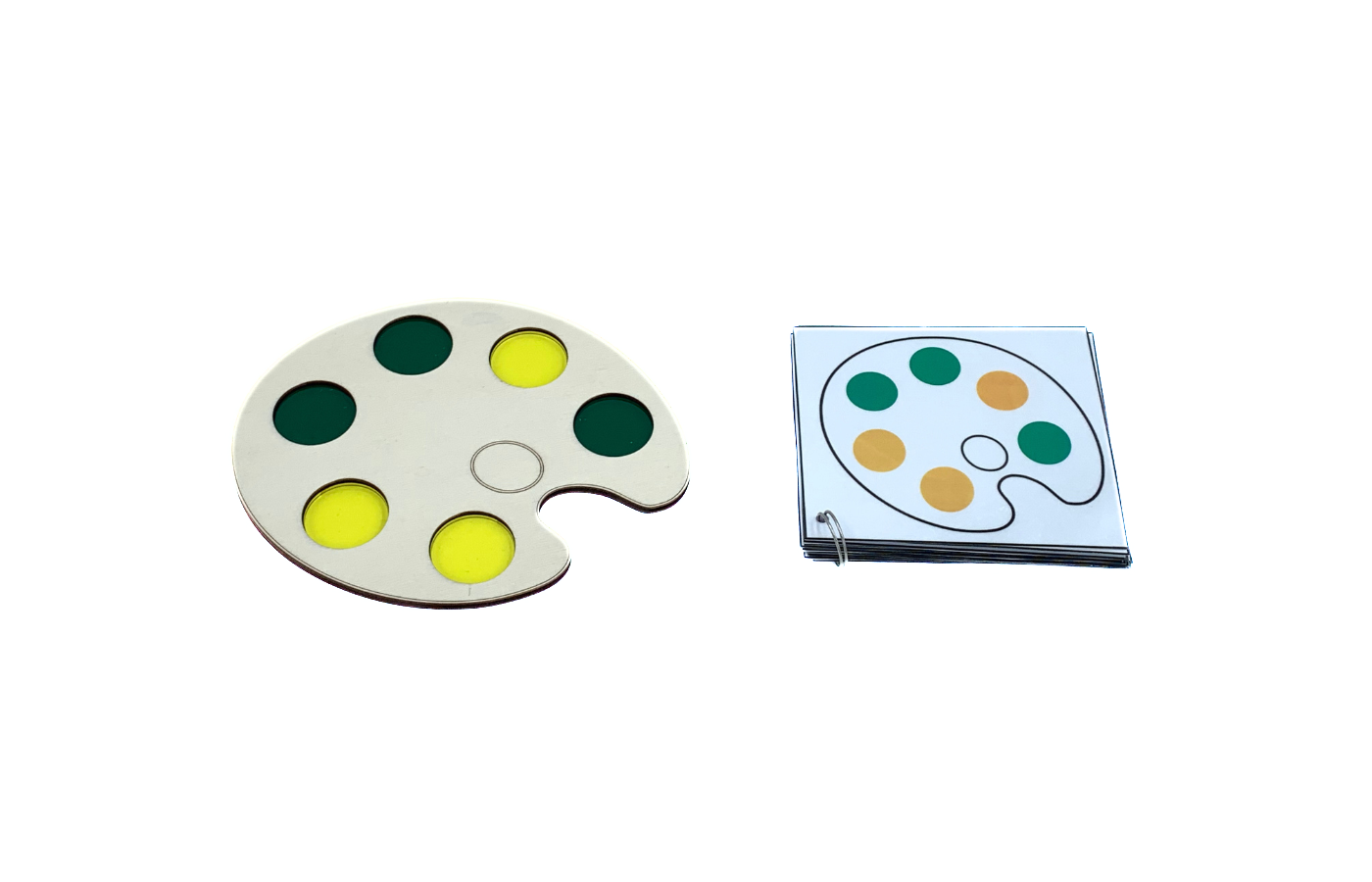 Fine motor play related to spatial orientation. What paint does the painter have on his palette? Give the painter the right colors (acrylic shapes) so he can get started.