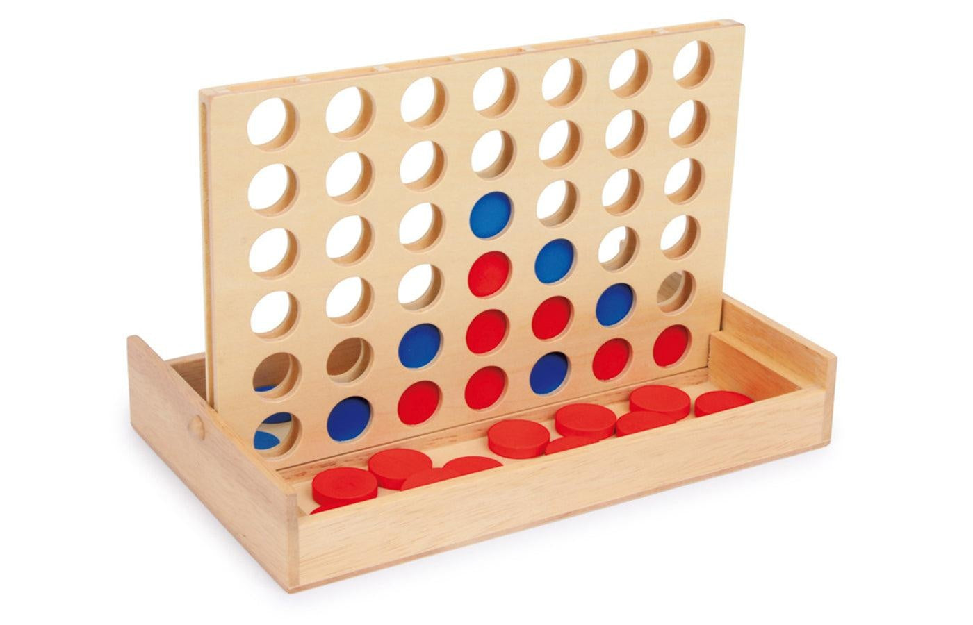 Classic 'four-in-a-row' game. This well-known game in compact format provides a lot of fun for both children and adults. By thinking logically and concentration you try to get 4 discs of the same color in a row. This can be done horizontally, vertically or obliquely. The detachable play area can be used to securely close the wooden box. The game board measures 24 x 25 x 16 cm.