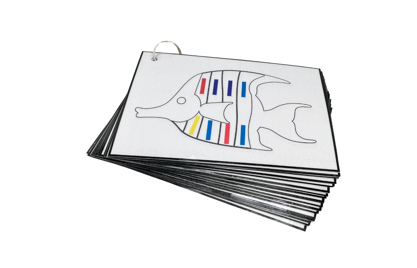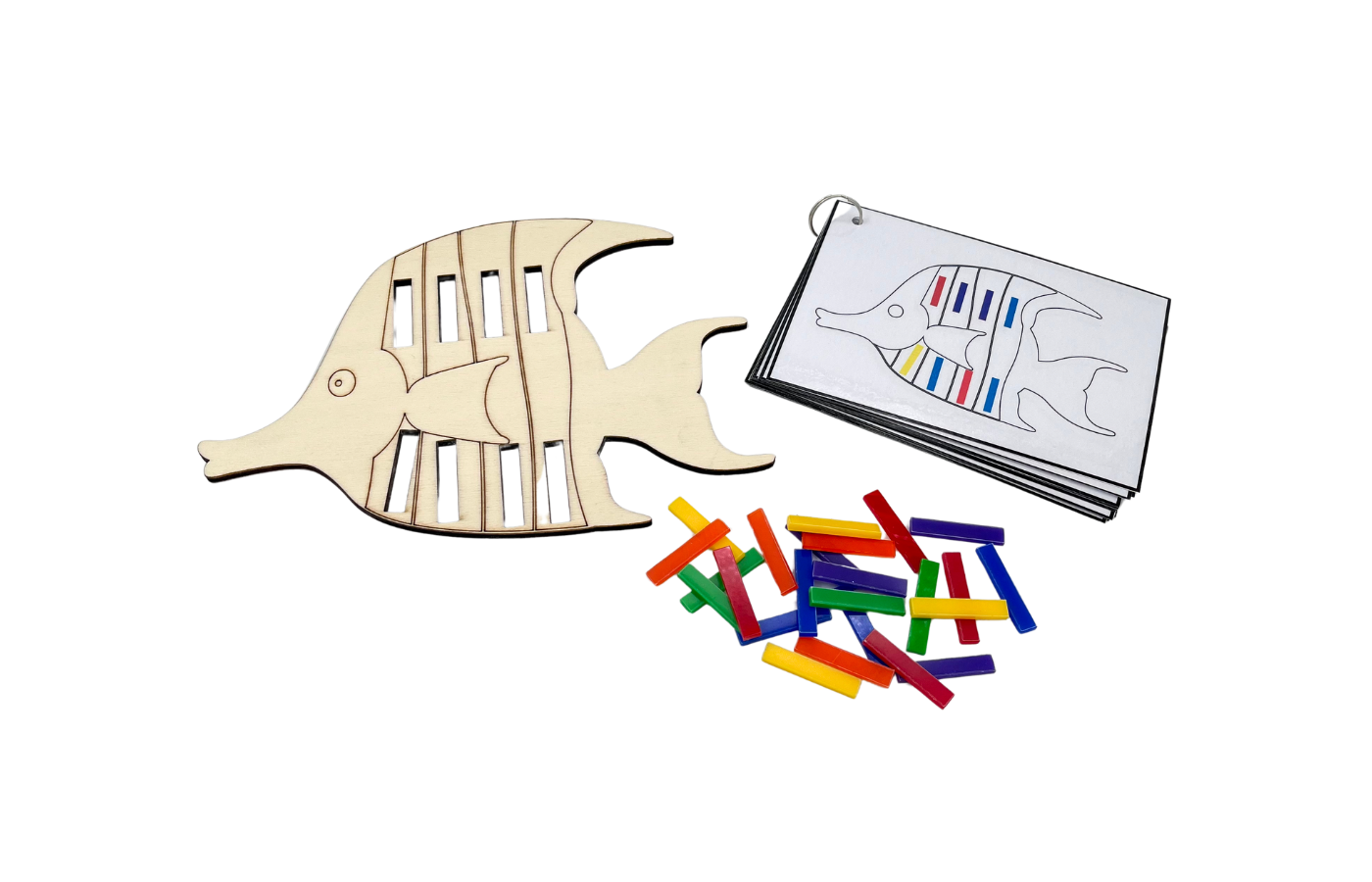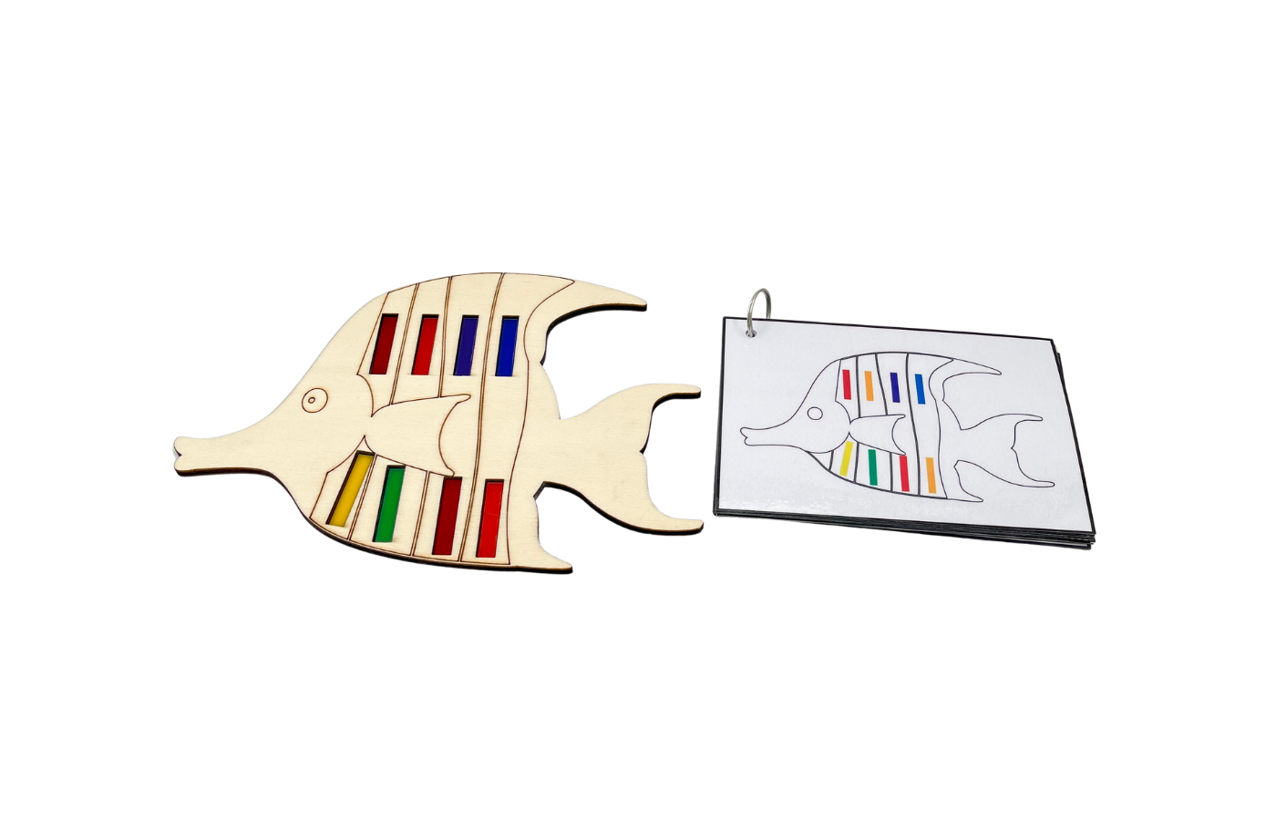 Fine motor game related to spatial orientation. The children place the acrylic shapes in the openings (scales) of the fish based on an assignment card. Very nice to use on the light panel .