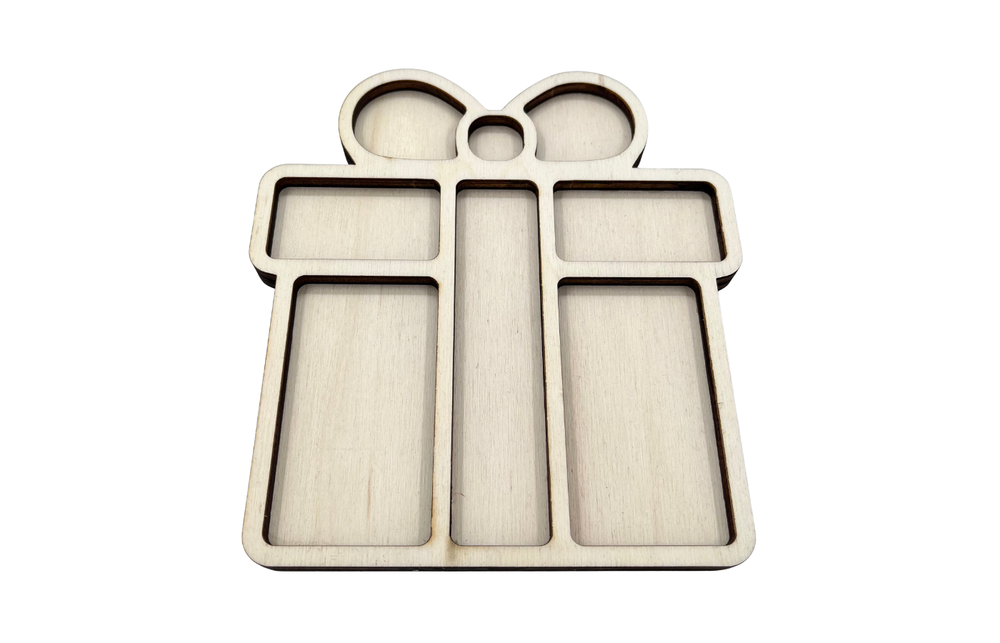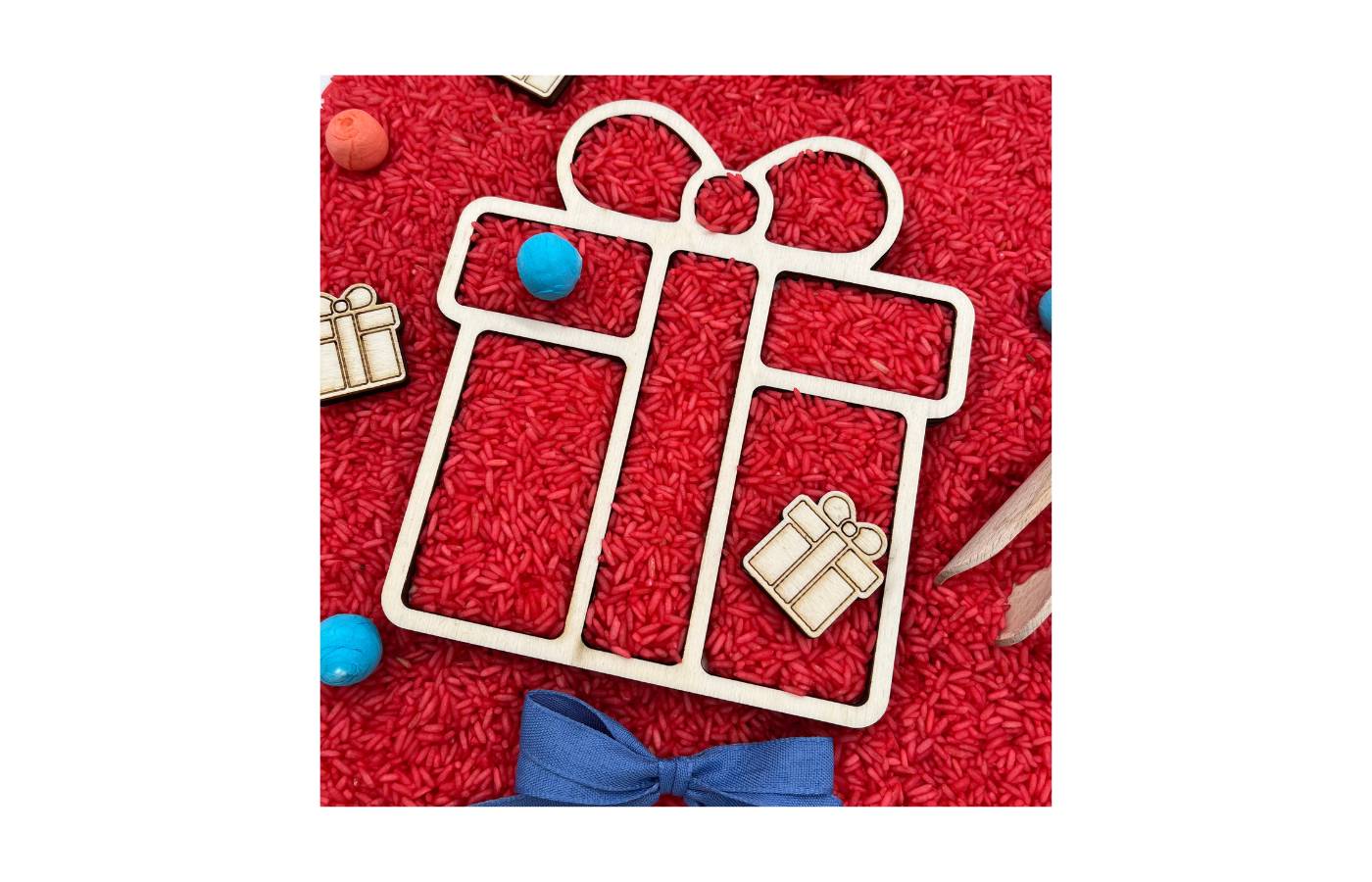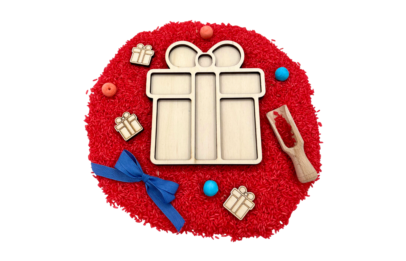 A play tray or play tray shaped like a gift or package. Perfect for filling with dry materials such as play rice, chickpeas, fine sand, etc.