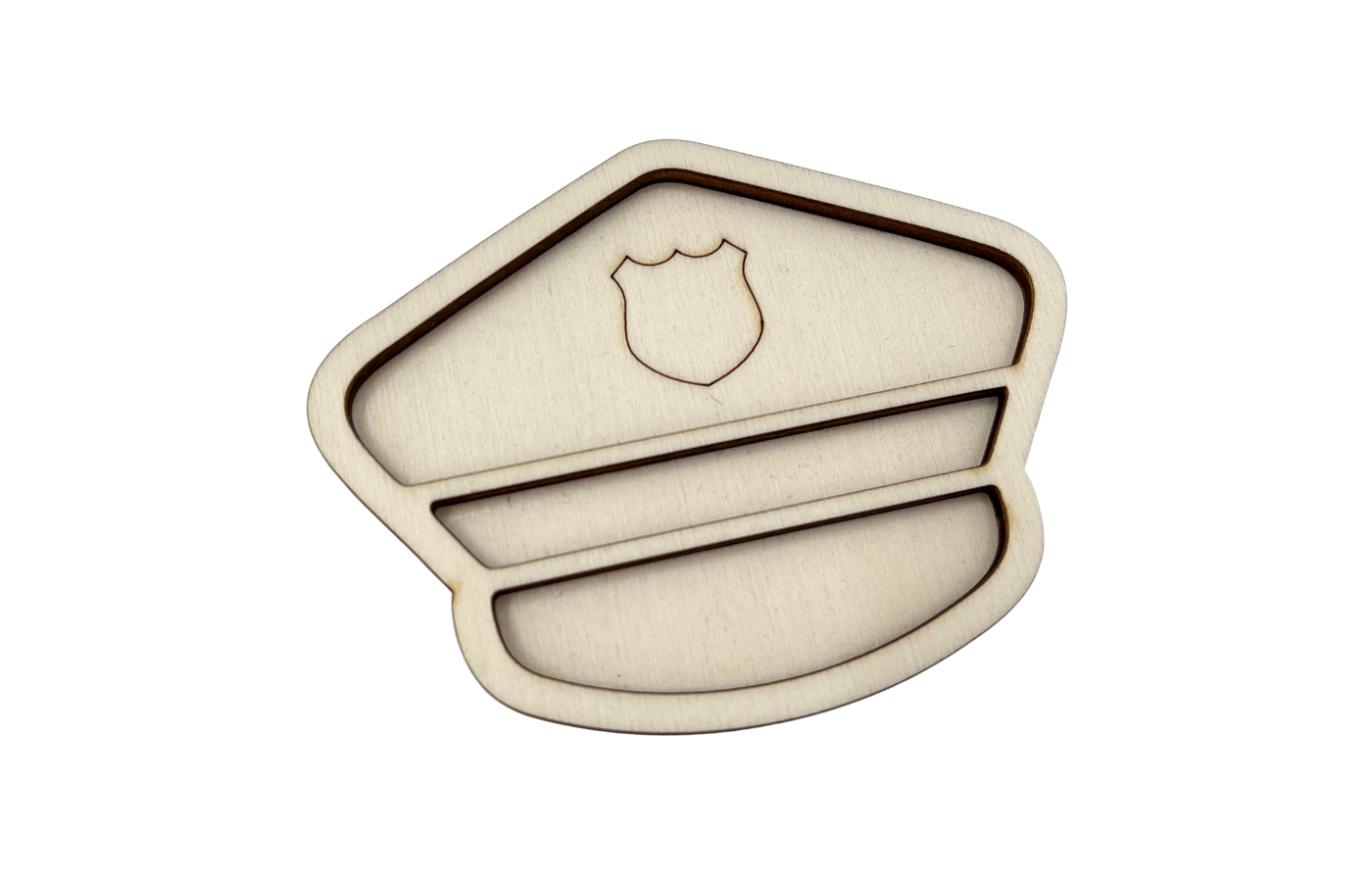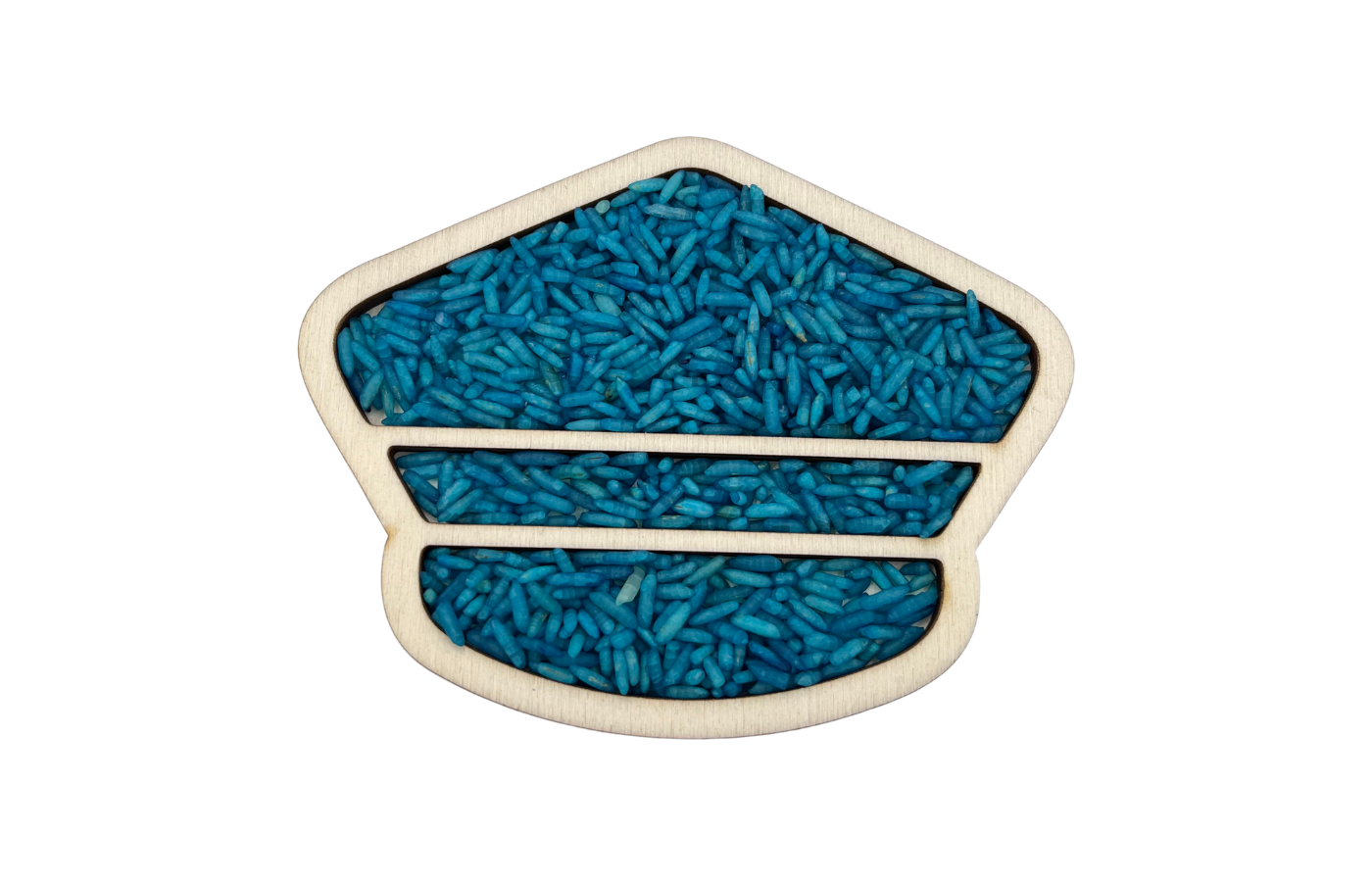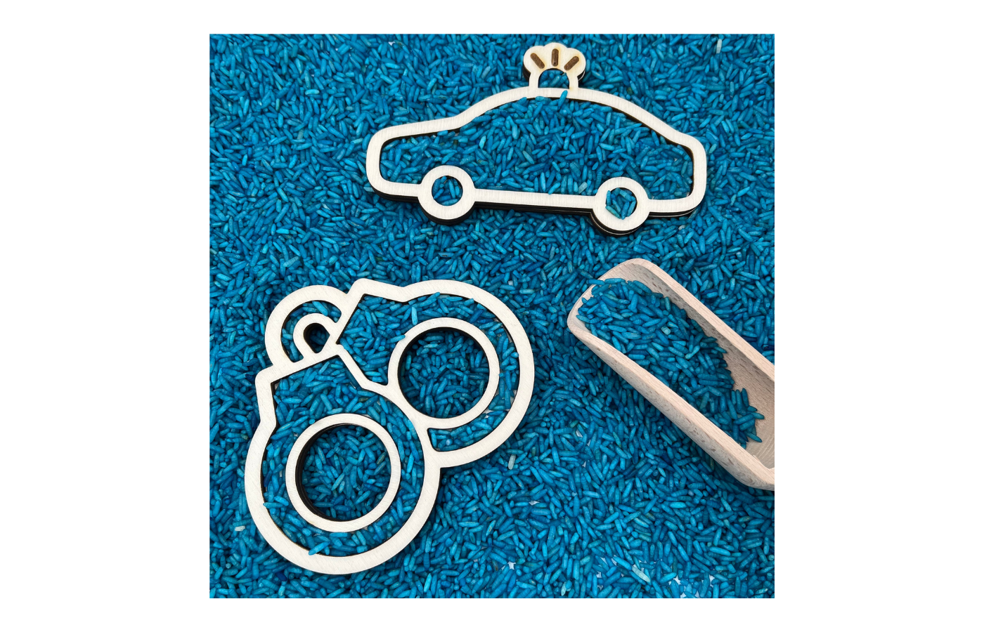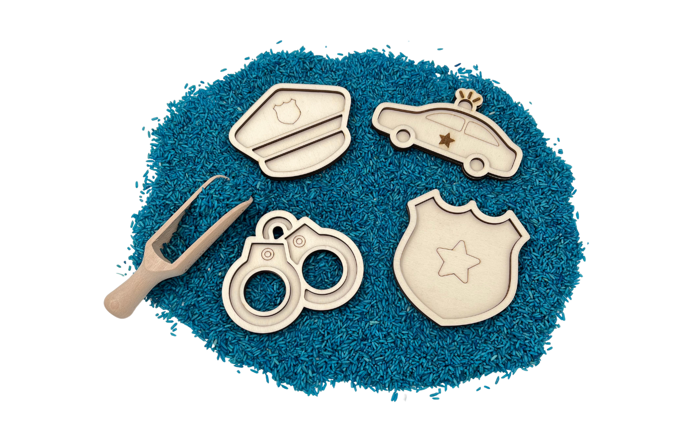 Filling shapes or play trays in the theme 'police'. A cap, badge, handcuffs and a police car. Perfect to fill with dry materials such as play rice, chickpeas, fine sand, ... In a cute size.