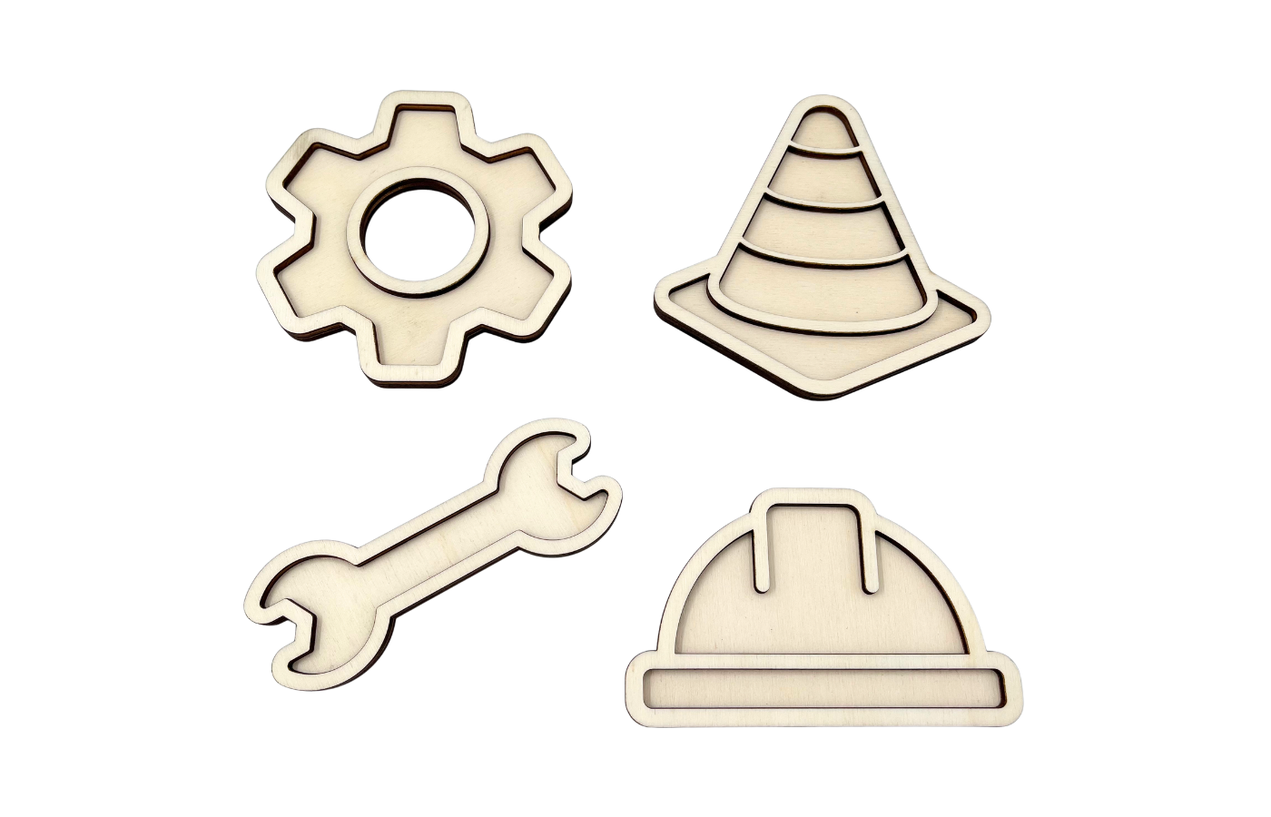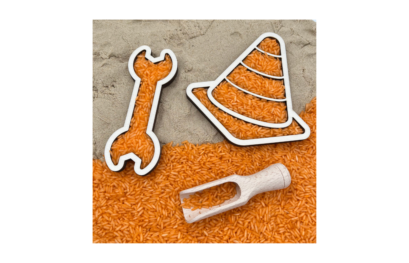 Filling molds or play trays based on the professions - technician. A helmet, a wrench, a cone, and a gear. Perfect for filling with dry materials like play rice, chickpeas, fine sand, etc. In a cute size.