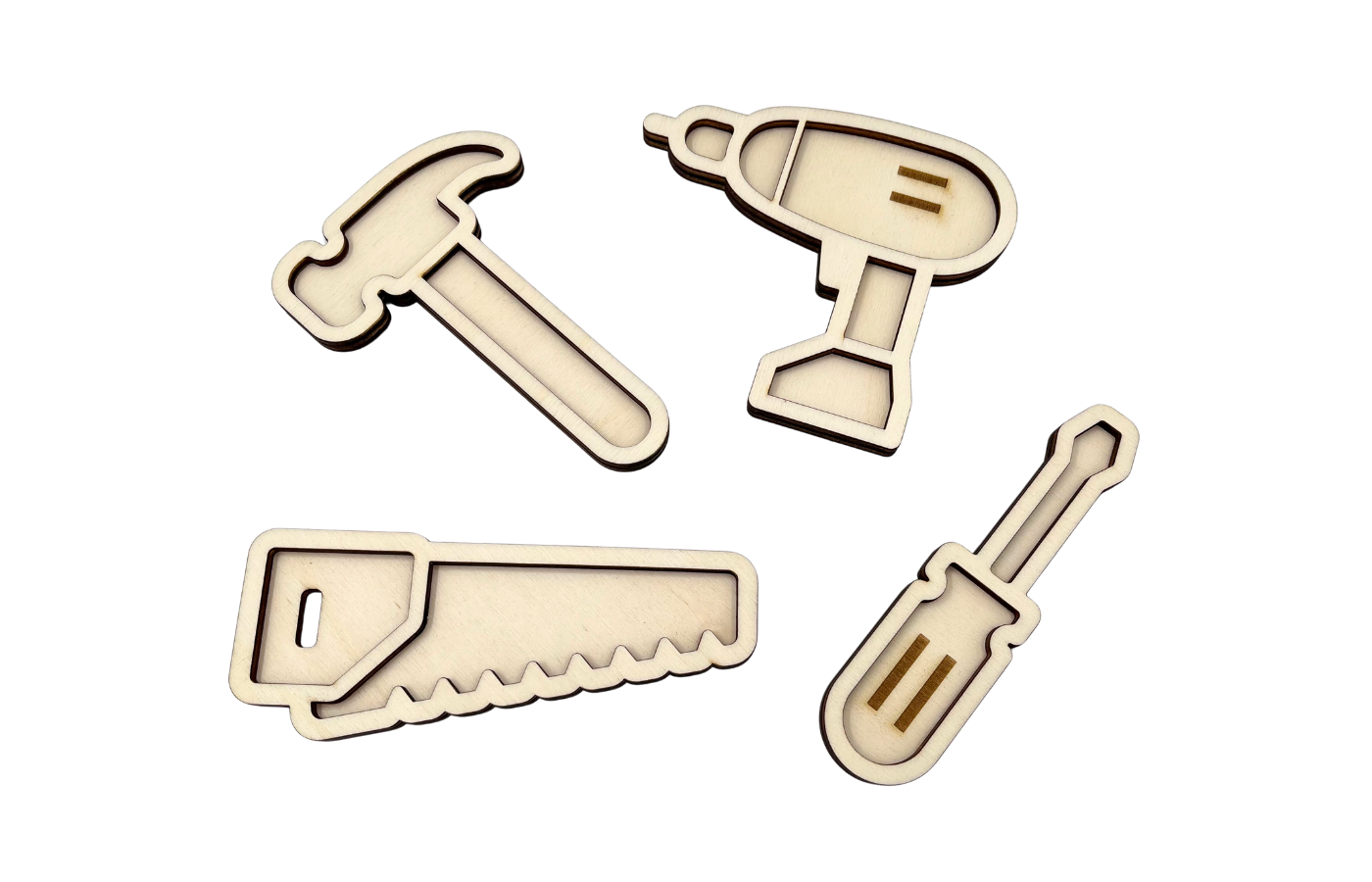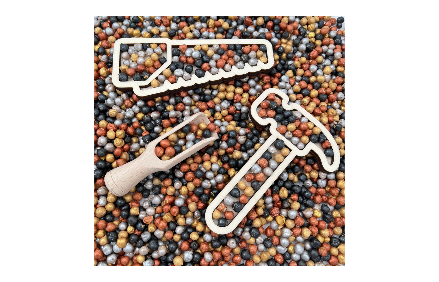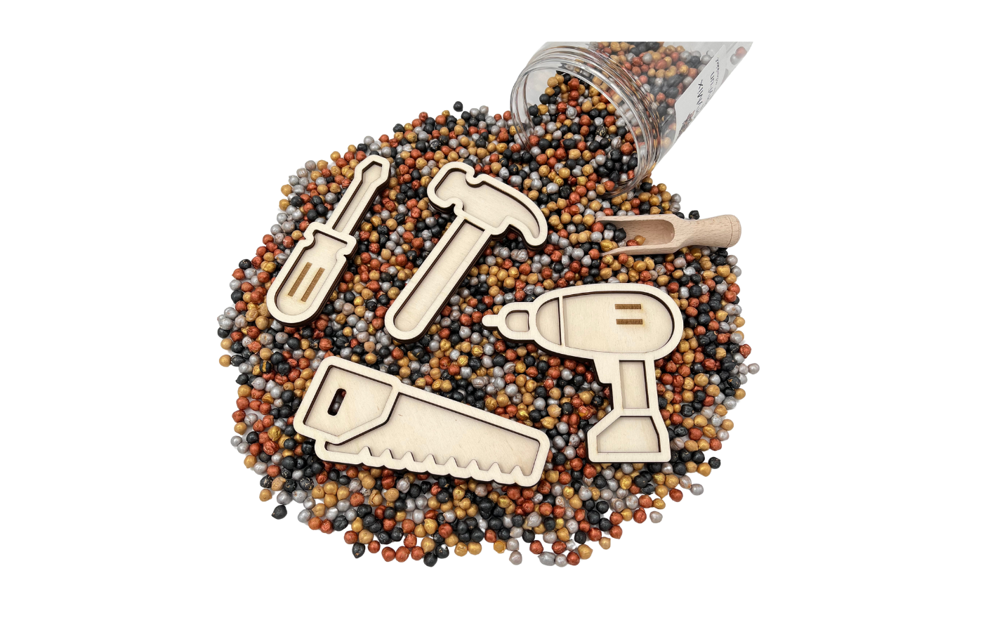 Filling trays or play trays based on the professions - carpenter. A saw, a hammer, a screwdriver, and a drill. Perfect for filling with dry materials like play rice, chickpeas, fine sand, etc. In a cute size.