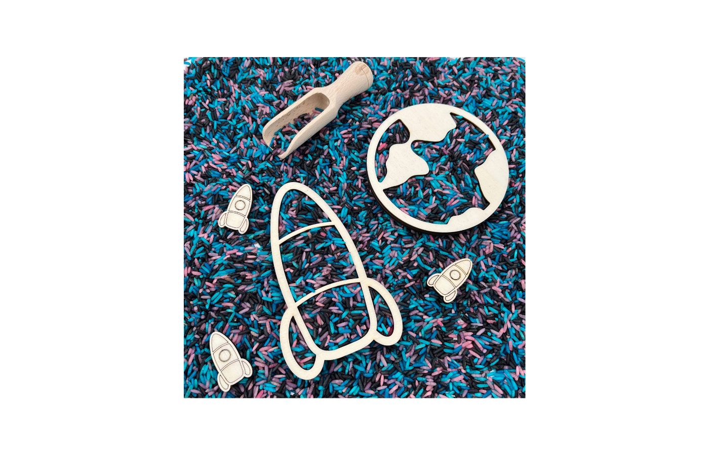 Space-themed play trays or play trays. Four different shapes (the Earth, a rocket, Saturn, and an astronaut helmet) in a fun size. Perfect for filling with dry materials such as play rice, chickpeas, fine sand, etc.
