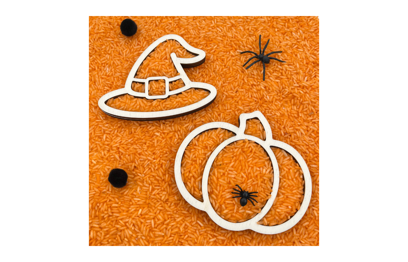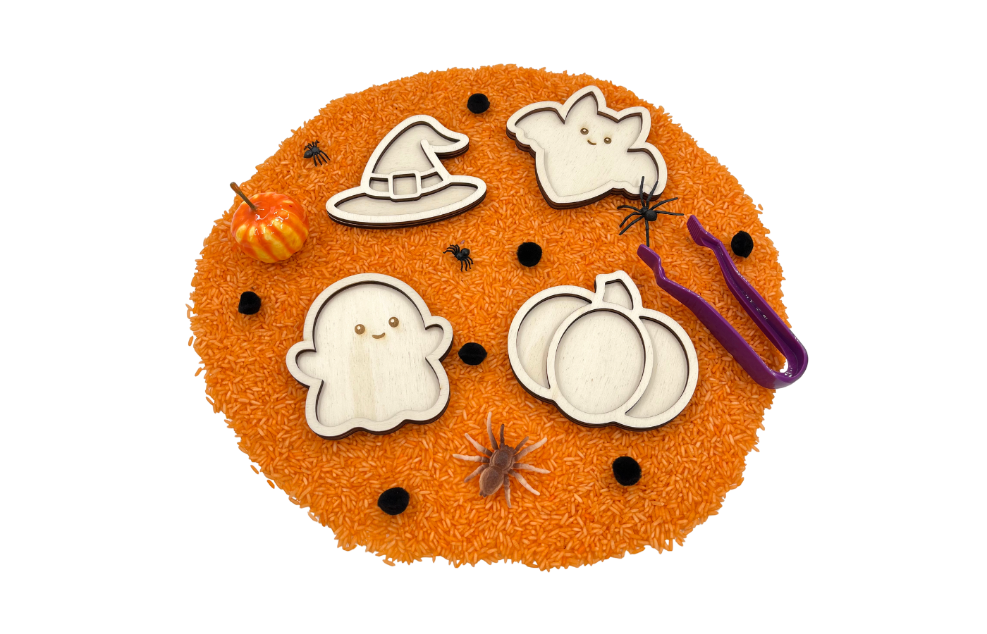 Halloween-themed play trays (ghost, pumpkin, witch's hat, and bat). Perfect for filling with dry materials like play rice, chickpeas, fine sand, and more. In a cute size.