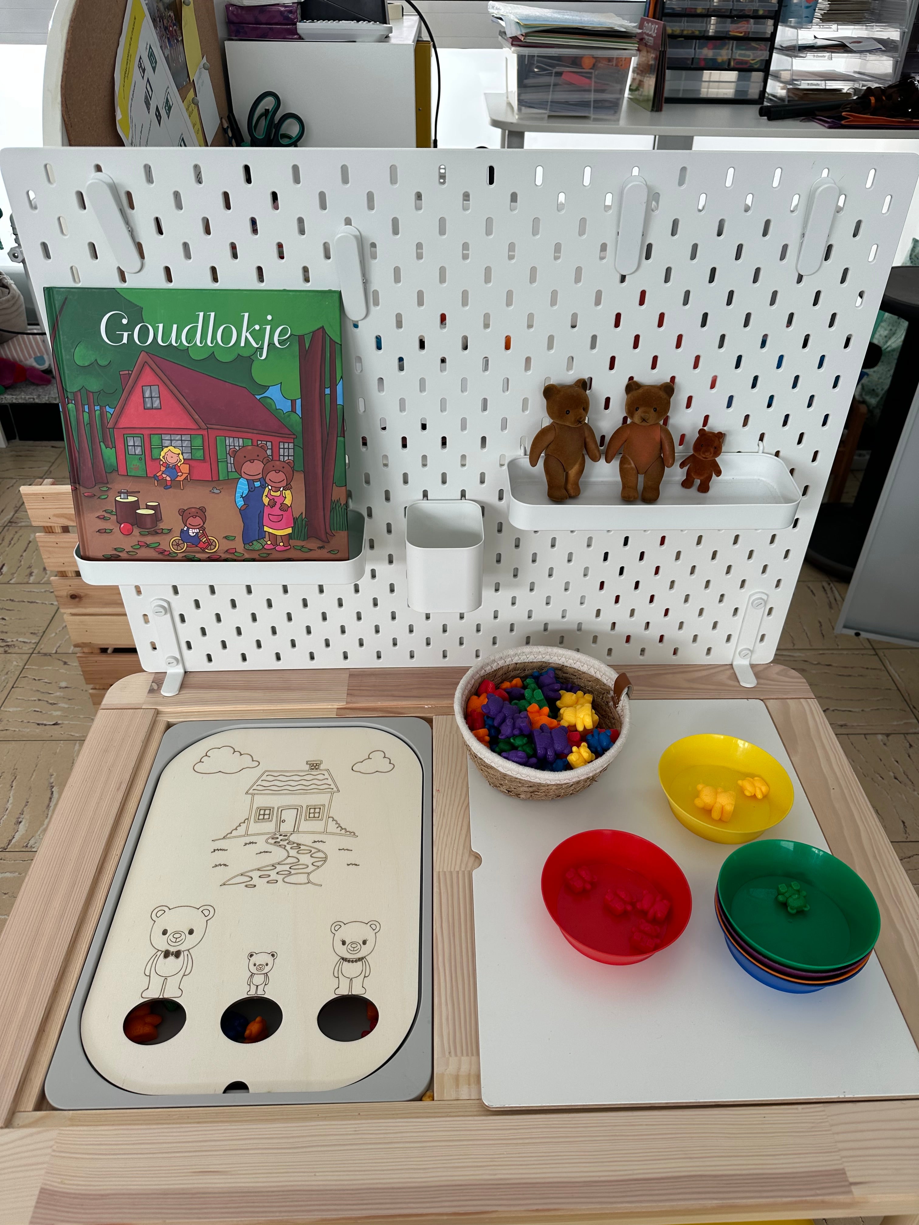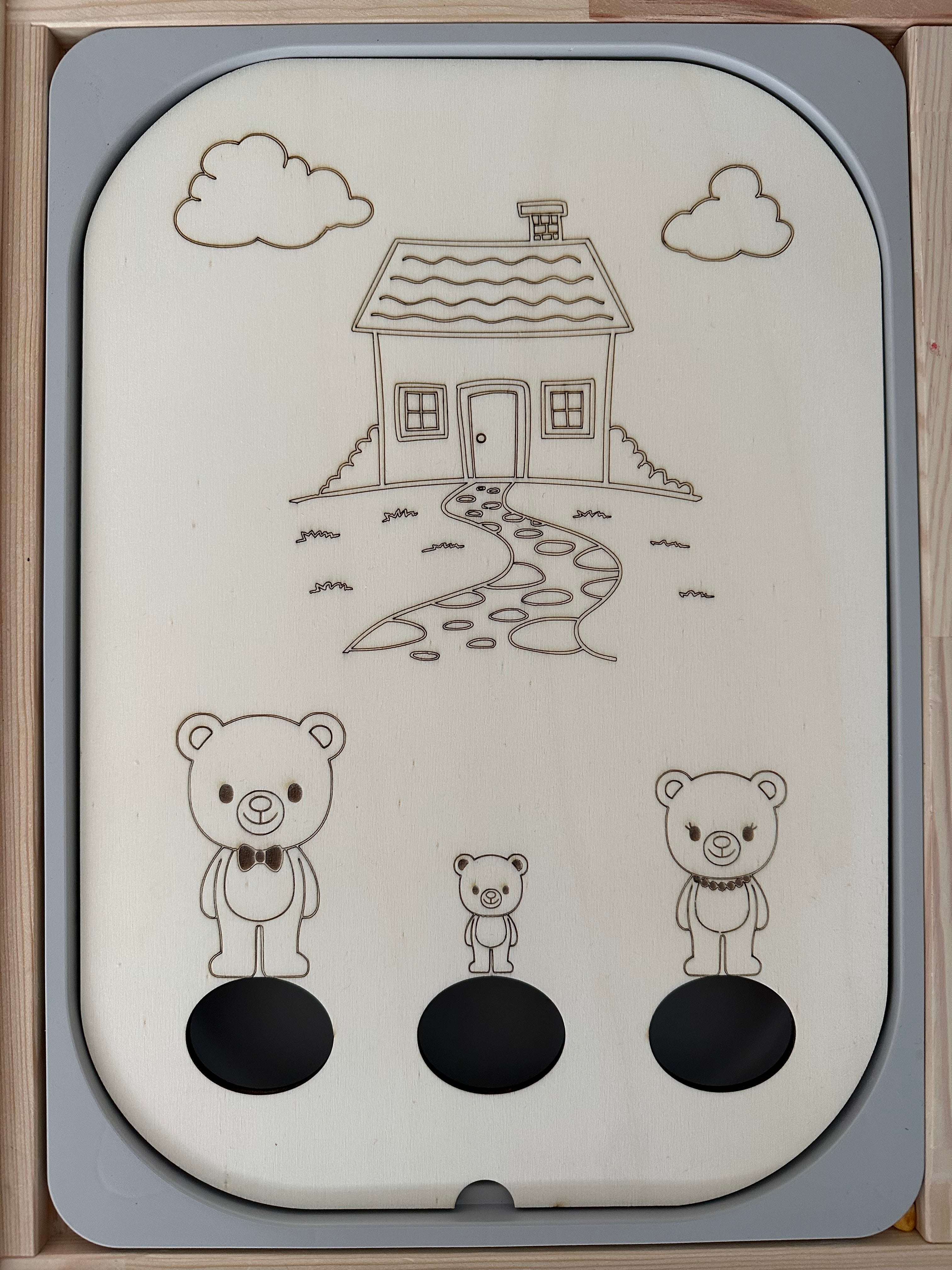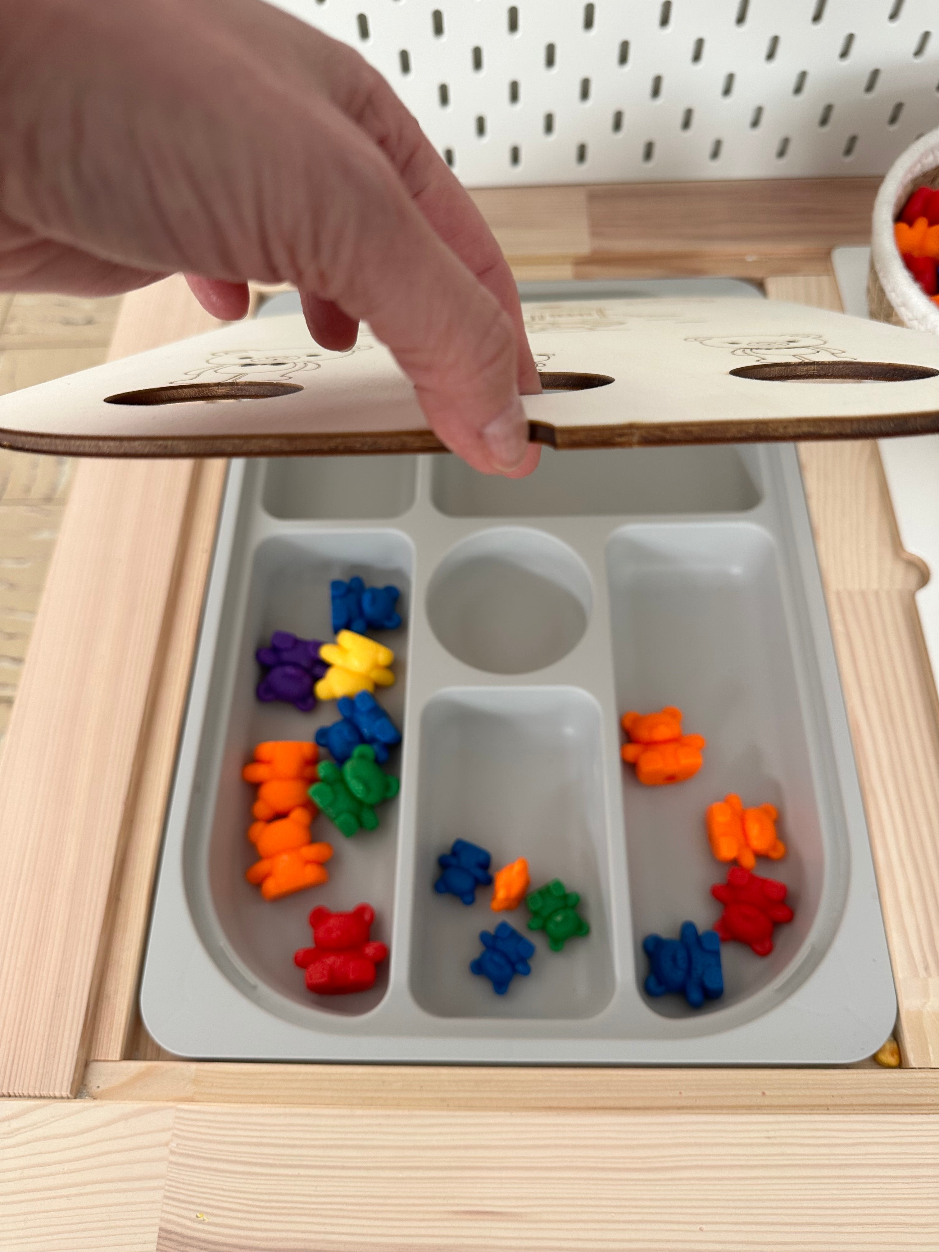 Theme lid (sorting bears) for use on the well-known Trofast containers from Ikea. Can also be combined with the Faithful storage. Stimulating fine motor skills through the sorting bears sort the holes according to size.