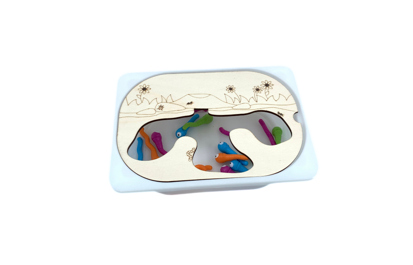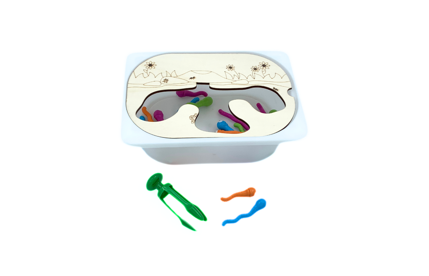 Theme lid (catching insects) to use on the well-known small Trofast bins from Ikea . To be combined with the measuring worms sorting set , wiggle worms activity setchenille wire , ... . Stimulating fine motor skills by catching the worms from the 'earth'.