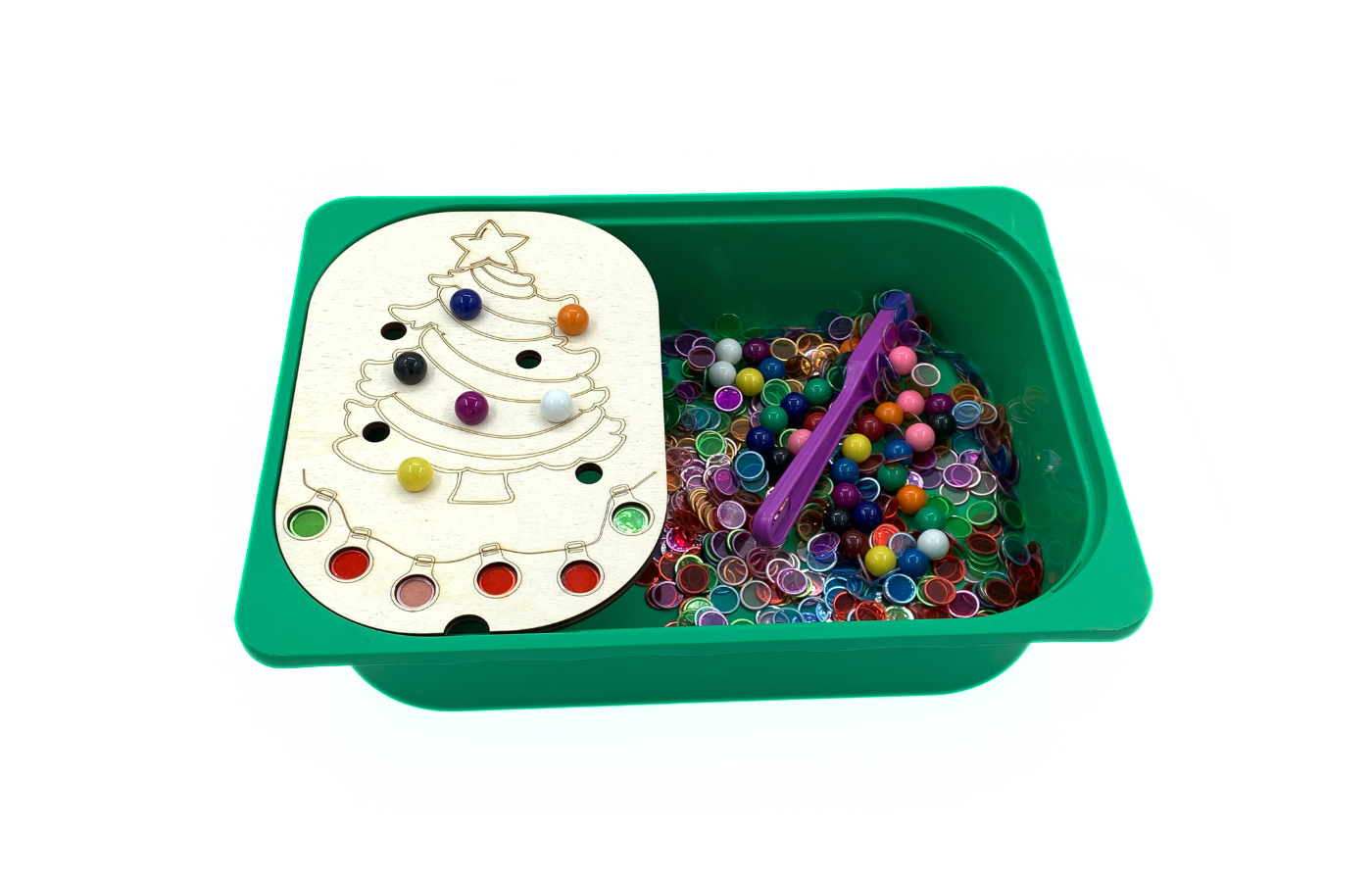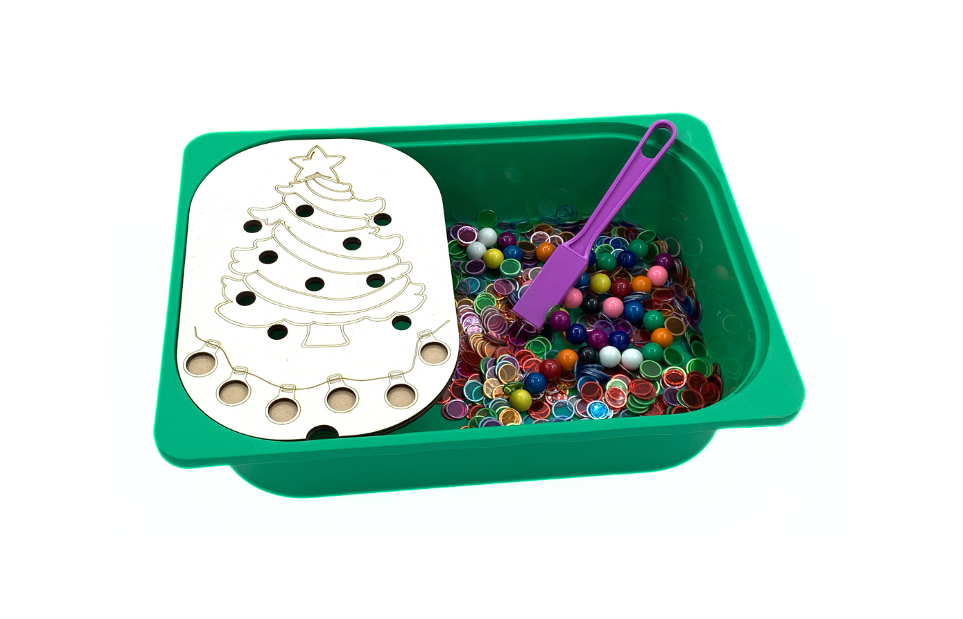 Theme cover (Christmas tree with garland) to be used on the well-known small Trofast boxes from Ikea. Can be combined with pompoms, magnetic bingo fiches in magnetic balls. Stimulate fine motor skills by giving the Christmas baubles a cheerful color.