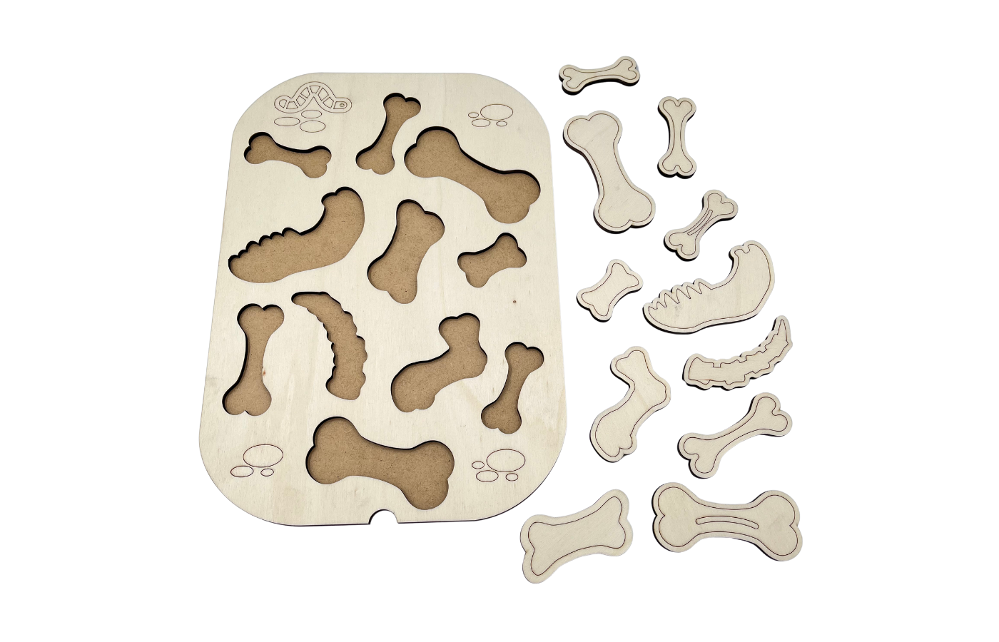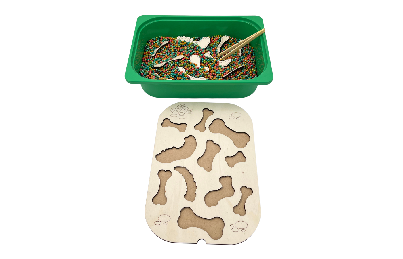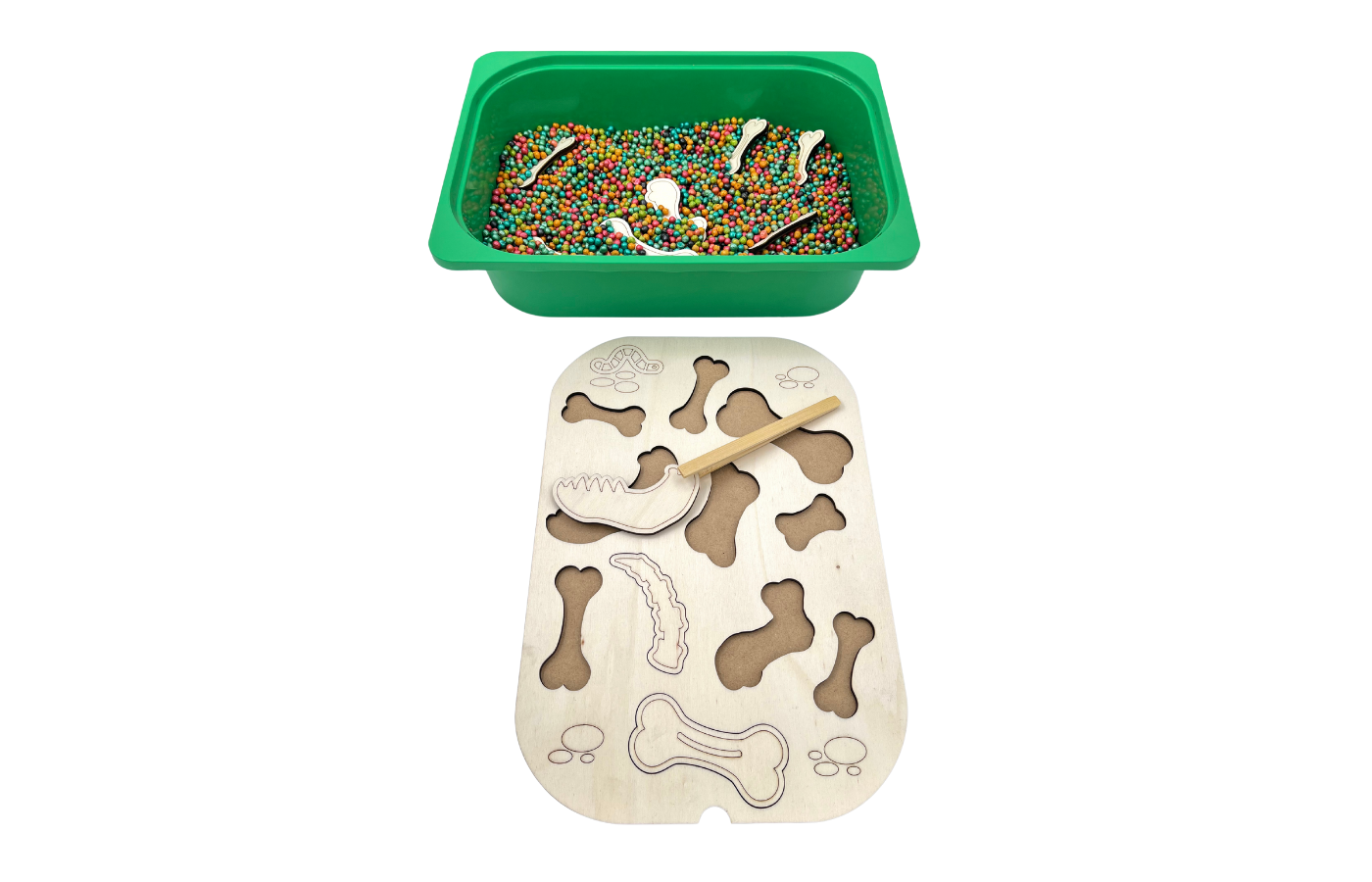 A fun, sturdy dinosaur-themed puzzle for little hands. Place the wooden inlay shapes (bones) in a discovery box and let children dig them up. Then, children place the bones in the correct position on the discovery board.