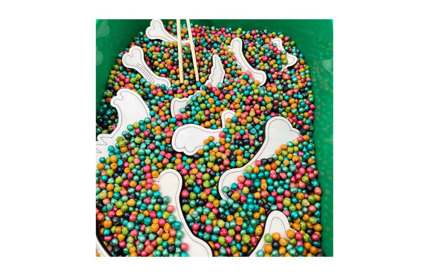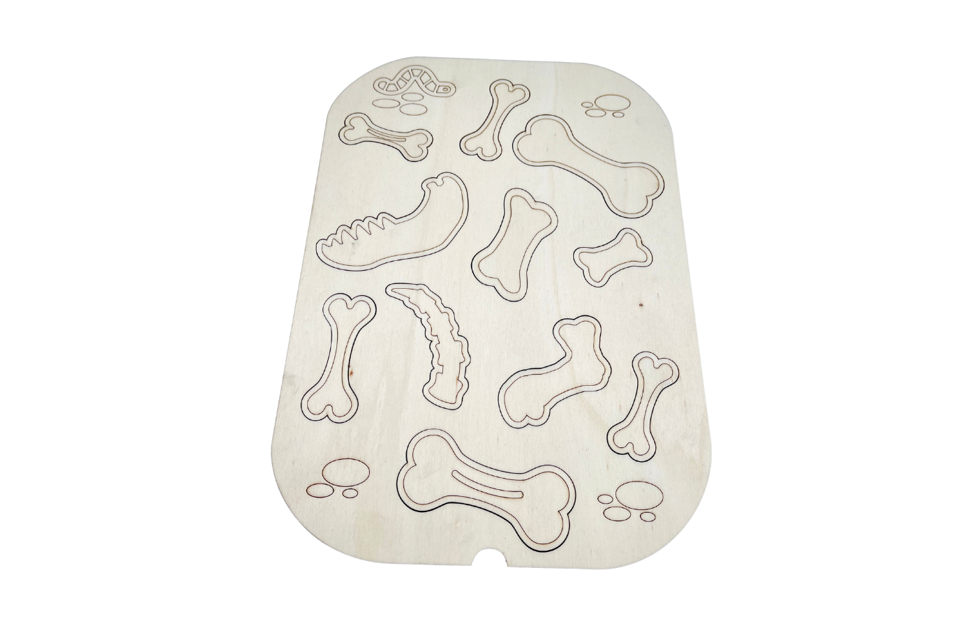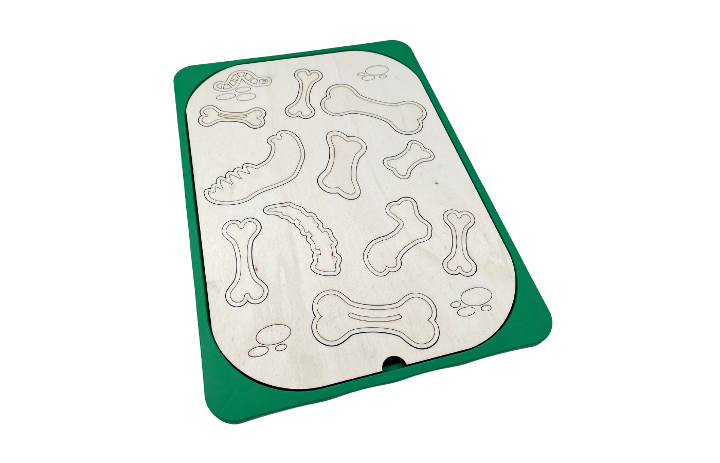 A fun, sturdy dinosaur-themed puzzle for little hands. Place the wooden inlay shapes (bones) in a discovery box and let children dig them up. Then, children place the bones in the correct position on the discovery board.