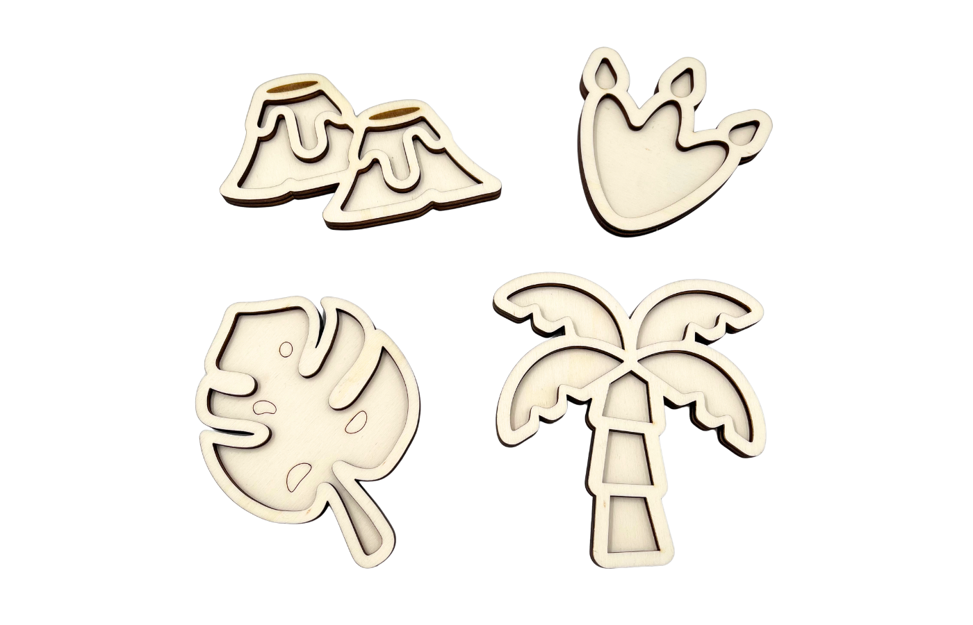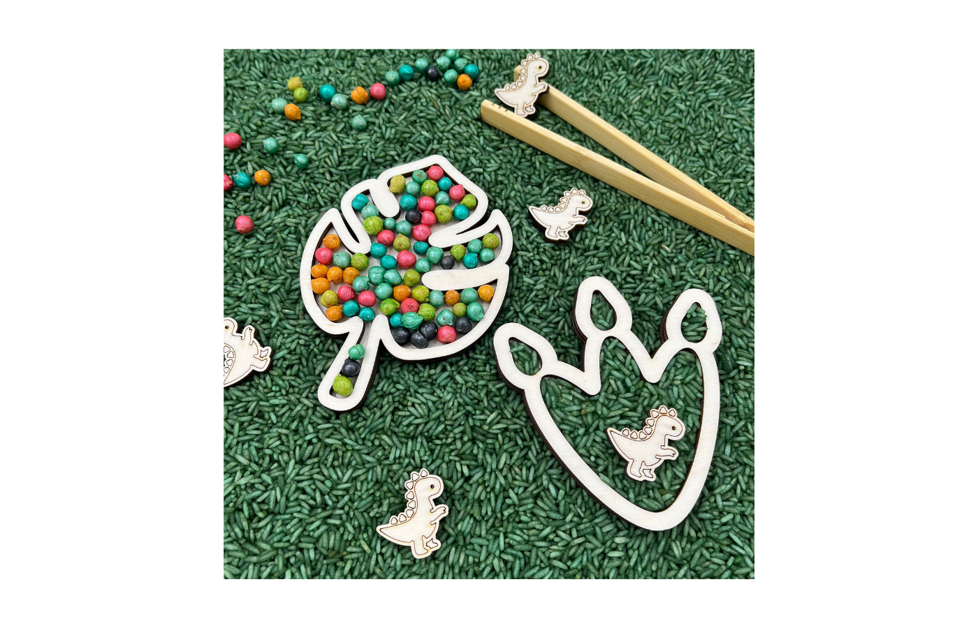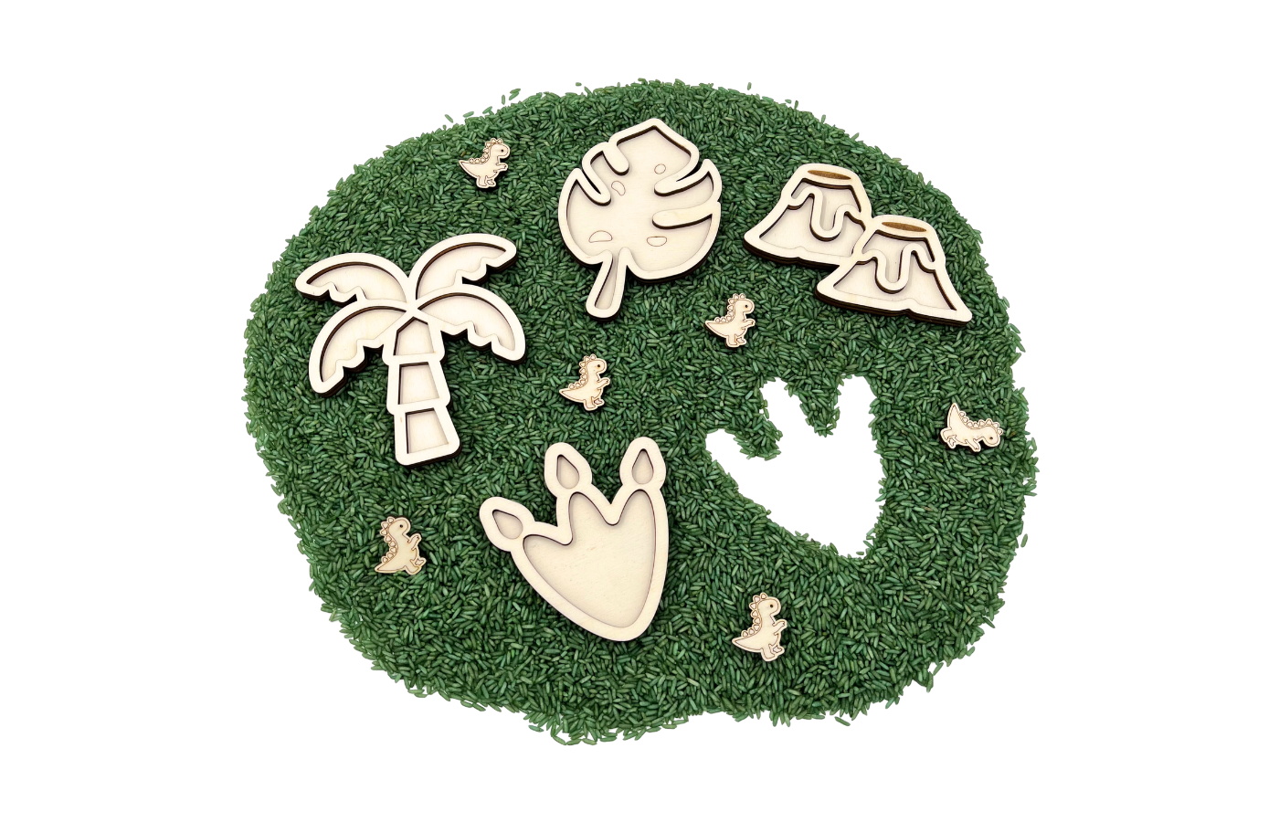 Dinosaur-themed play trays or play trays. Four different shapes (palm tree, leaf, volcano, and leg) in a fun size. Perfect for filling with dry materials like play rice, chickpeas, fine sand, etc.