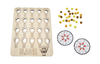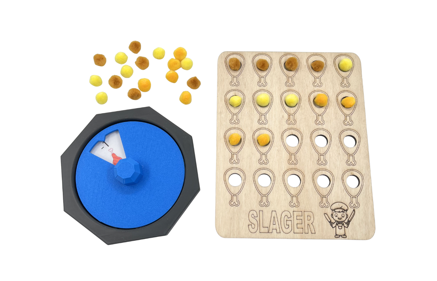 Kinderen draaien aan de spinner en vullen daarna het bord met de juiste hoeveelheid pompons. Dit spel kan ook met meerdere spelers of meerdere spelborden gespeeld worden.