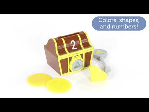 Unlock the 5 numbered treasure chests with the appropriate key and discover the treasure. The kids can discover a purple parrot, a green octopus, red binoculars, a yellow gemstone and a blue pirate hat. The set also includes coins that can aid in counting and sorting. The coins can be put into the treasure chest through the slot in the lid of the treasure chest.