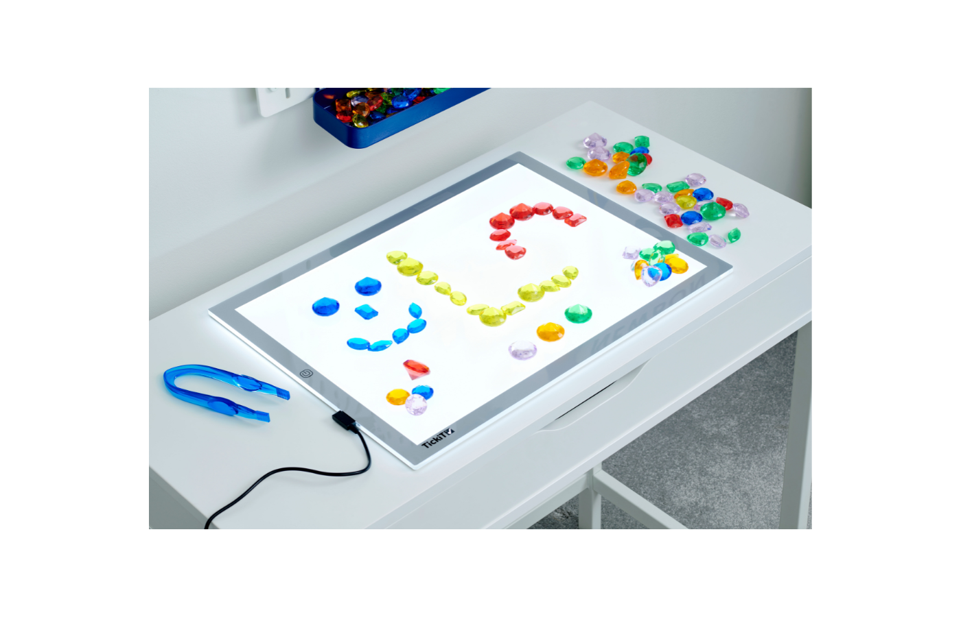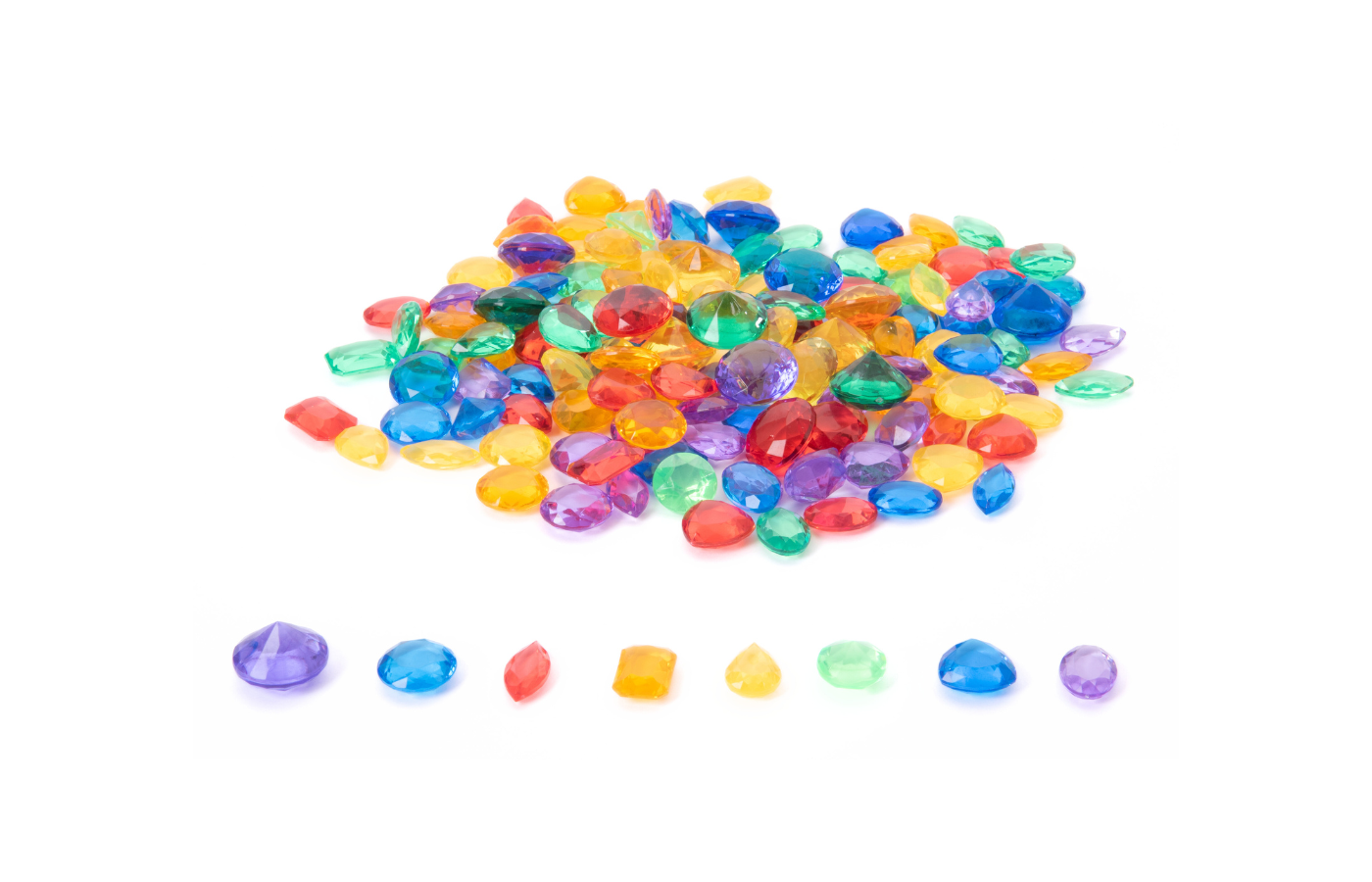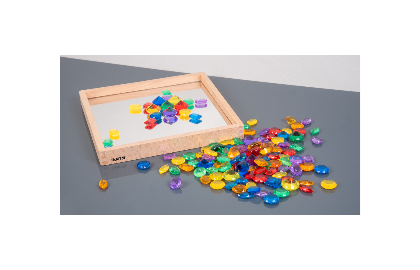 This set of 144 gemstones, 6 different colors and 8 different types, is great fun to use on the light table or to learn to sort. You can sort by color, size or type of structure. You can place them on top of each other on the light table to mix the colors.