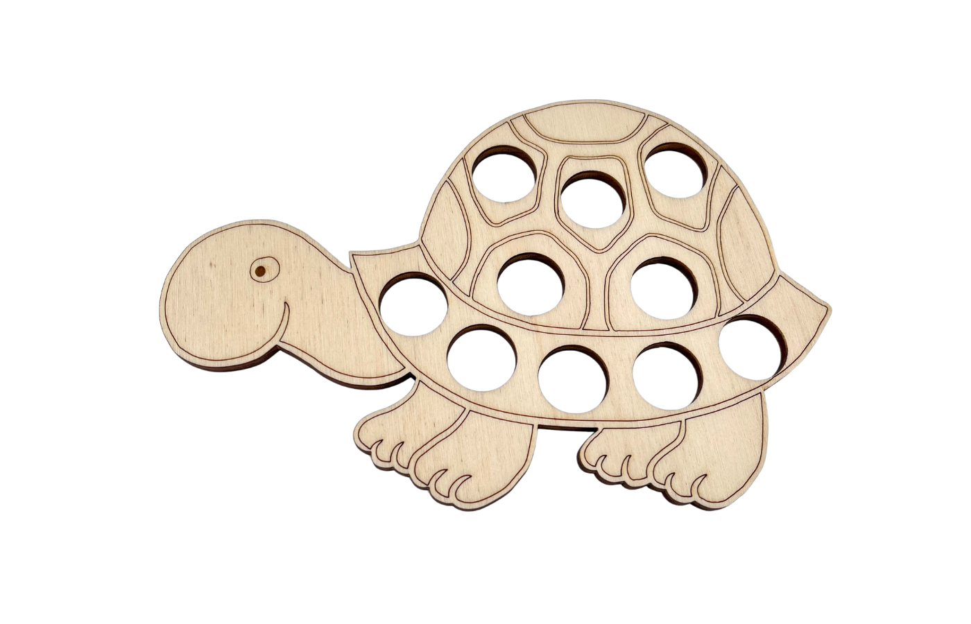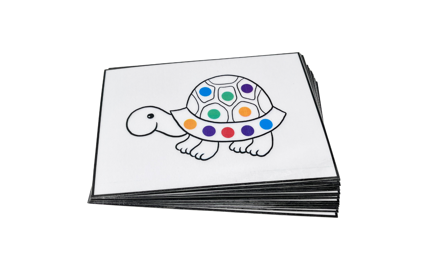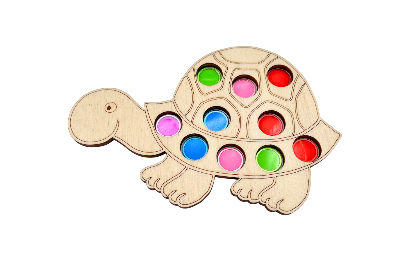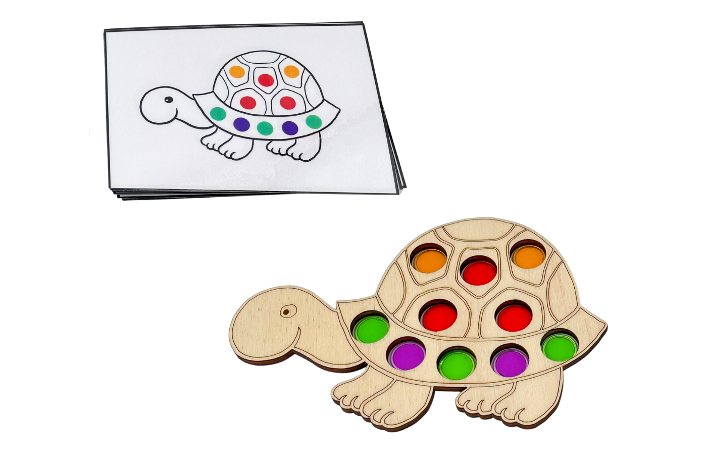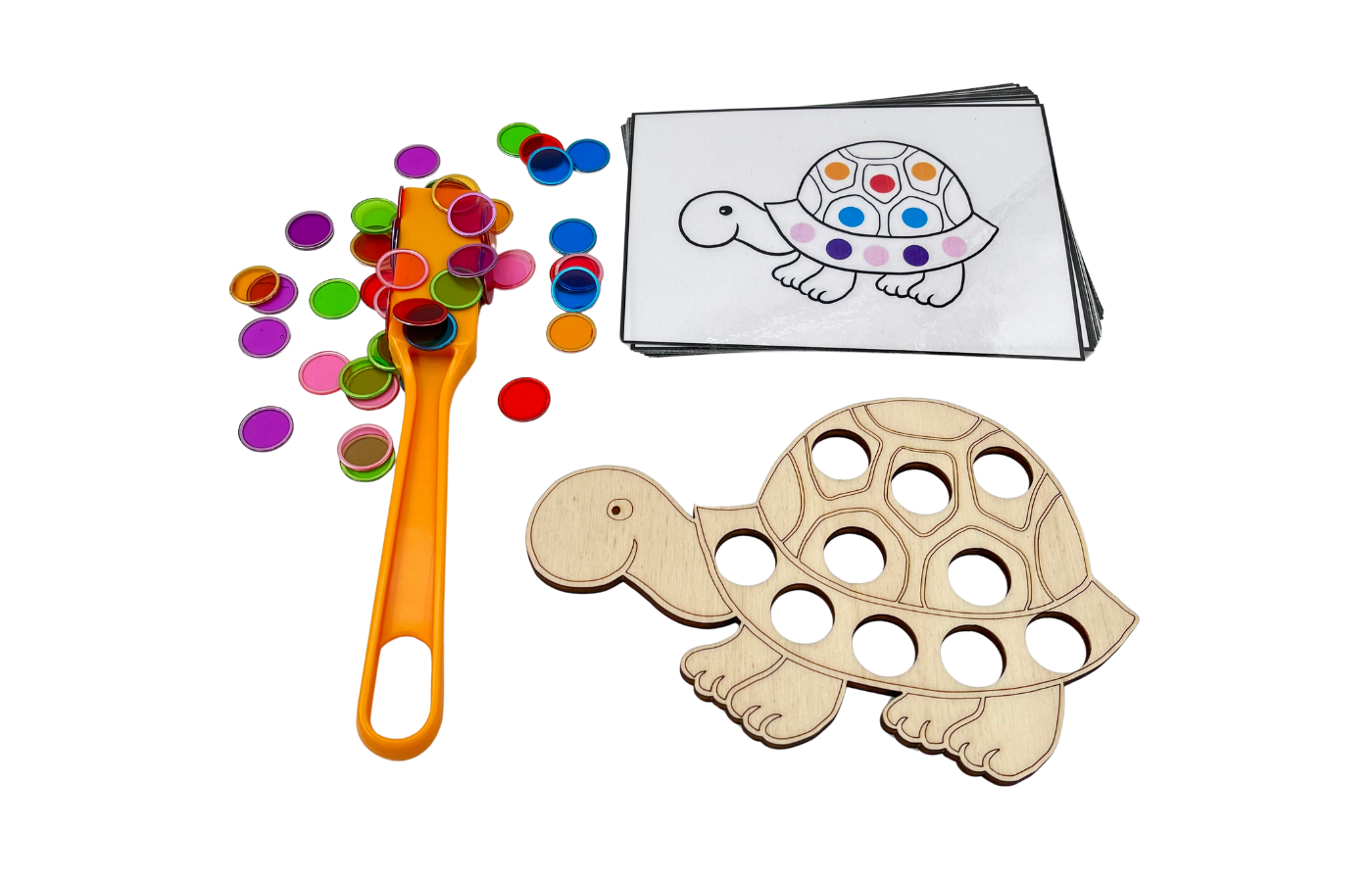 Fine motor play related to spatial orientation. Children place magnetic tokens in the holes of the turtle, following a task card. Using the magnetic stick, children can funnily remove the tokens from the game board.