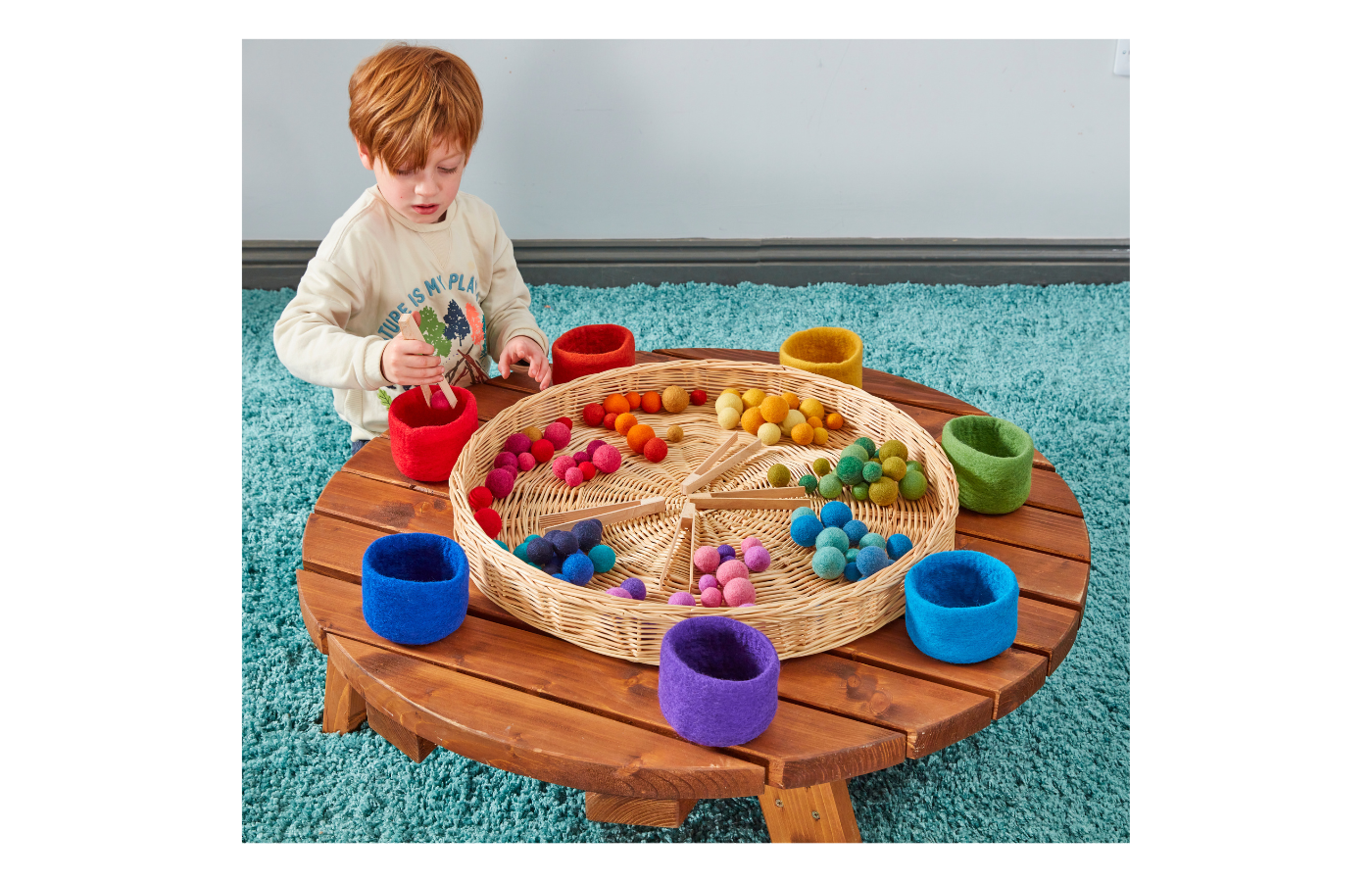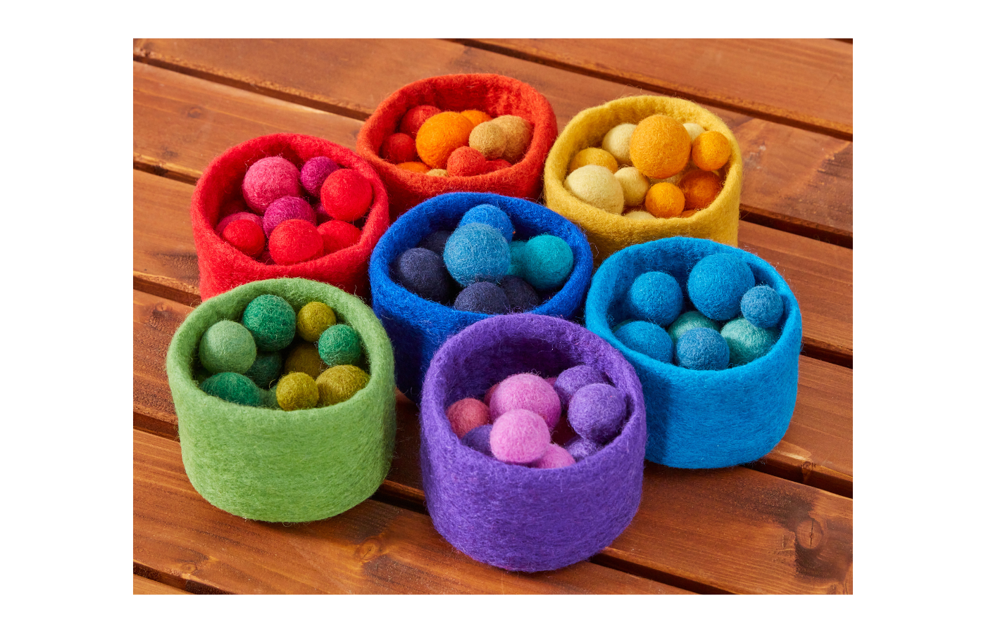 Onze vilten regenboog set brengt kleur, fantasie en leerplezier samen met 7 handgemaakte vilten kommetjes en maar liefst 100 zachte vilten balletjes.