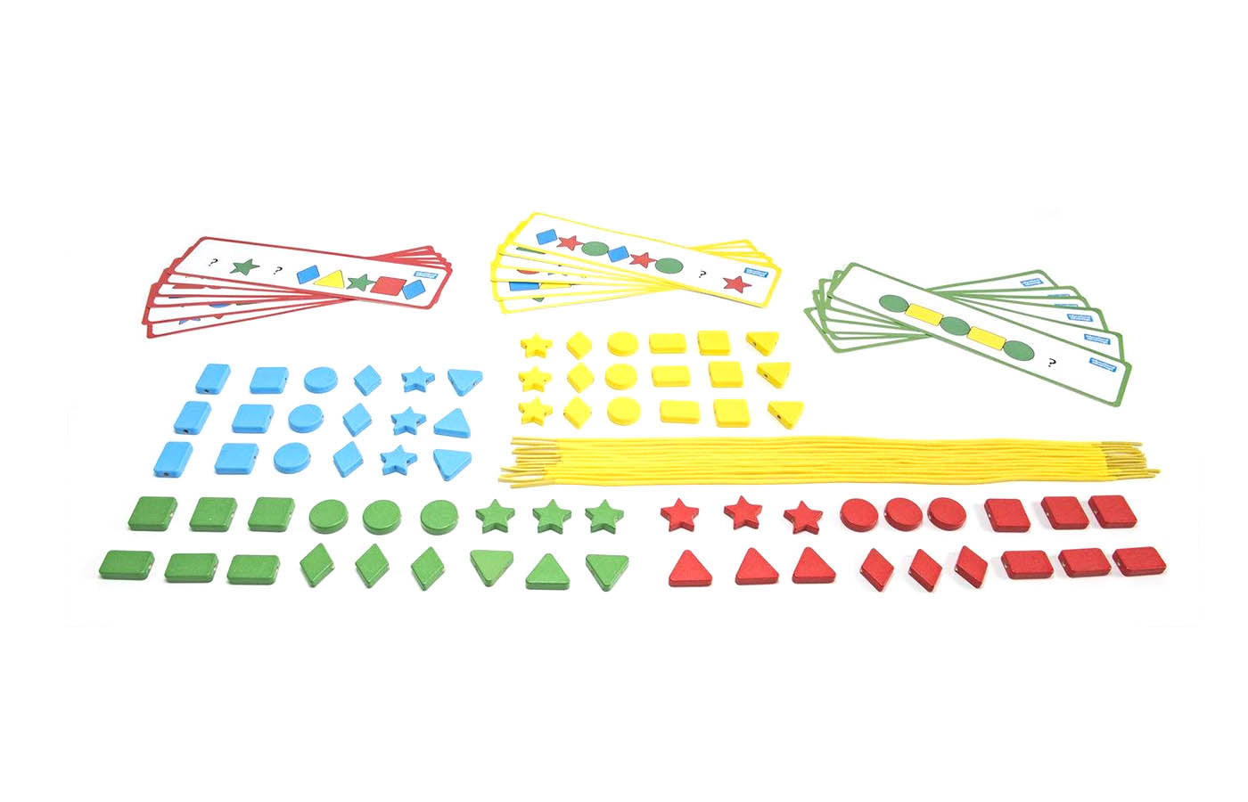 Game related to spatial orientation and fine motor skills. The children string the geometric shapes onto the rope based on assignment cards. With this game you can work on pattern recognition. A color code has been added to the assignment cards to show the gradation. Includes 72 geometric wooden shapes, 12 shoelaces and 18 task cards.