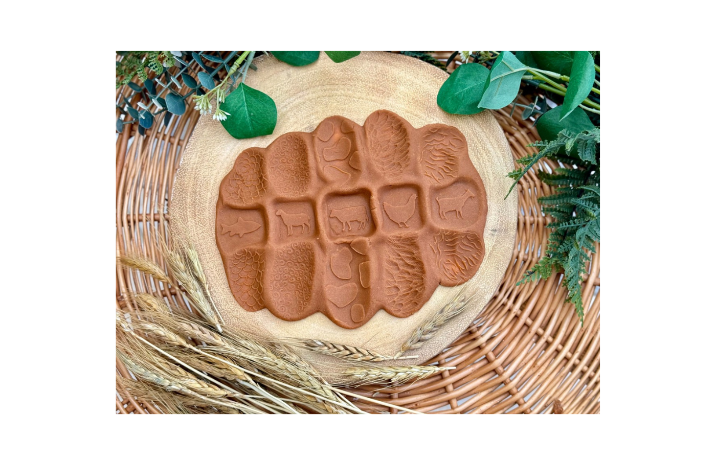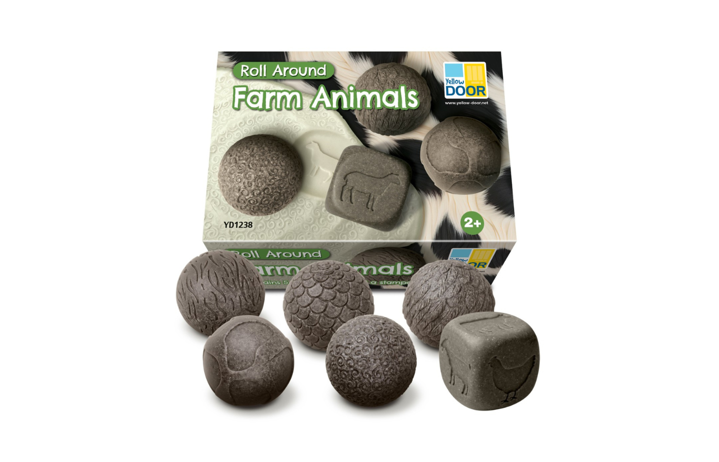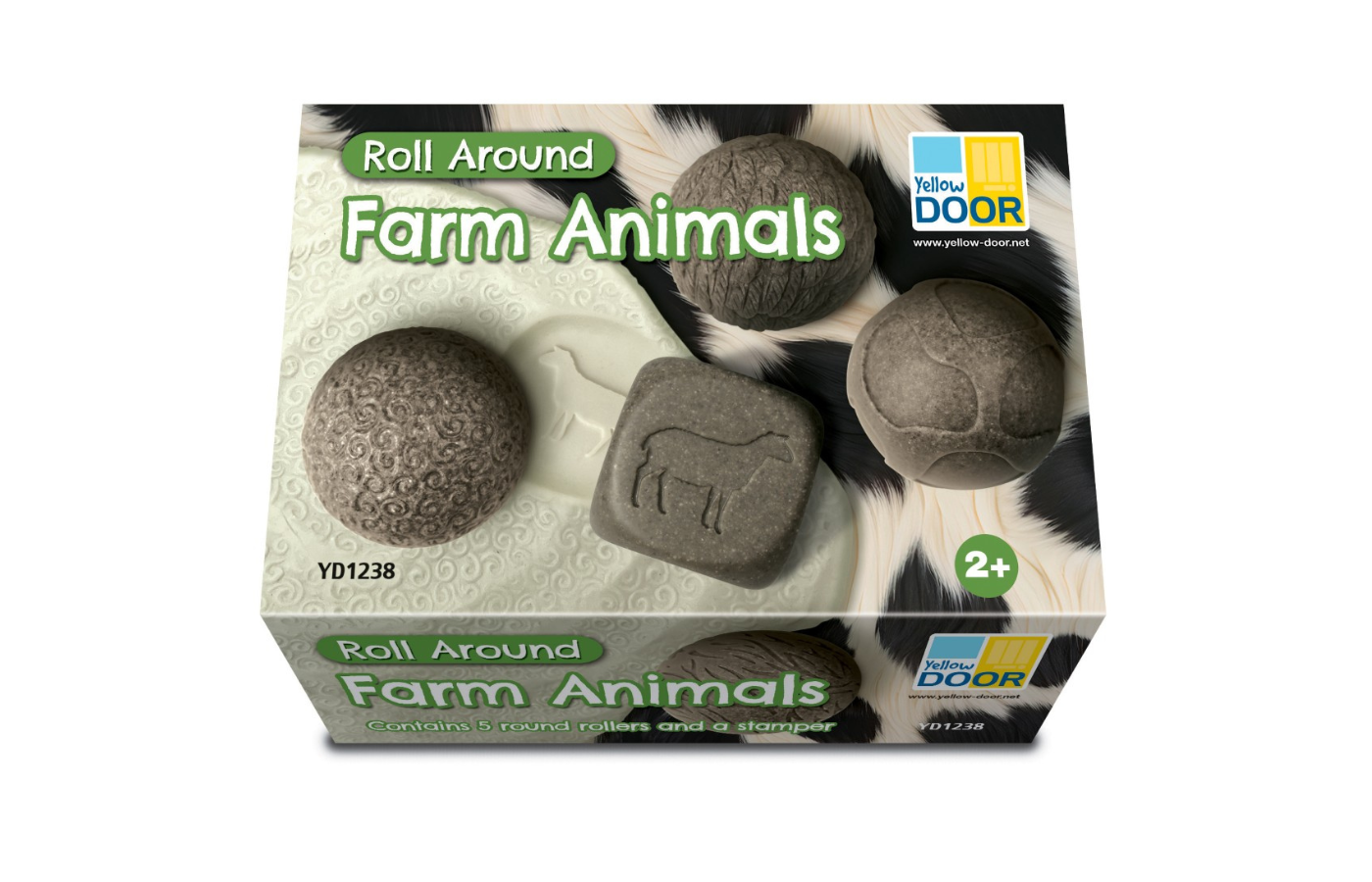 These engaging rollers depict familiar animals found around the farm and pond: cow, sheep, chicken, fish, and goat. Designed to spark curiosity and develop fine motor skills, the set includes five textured rollers that reveal different animal patterns and a stamp to identify the animal.