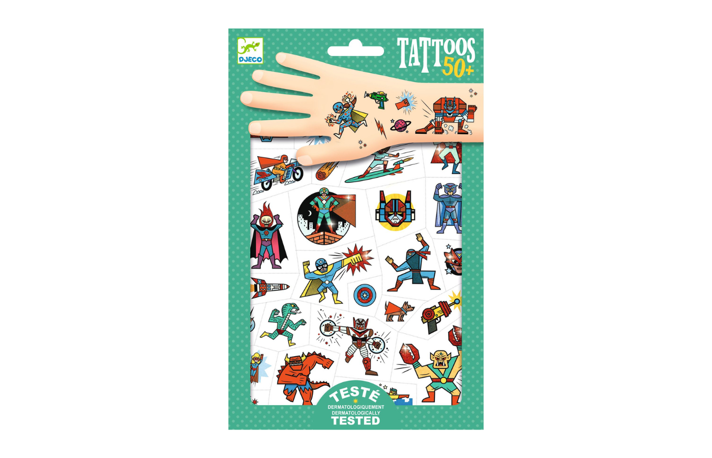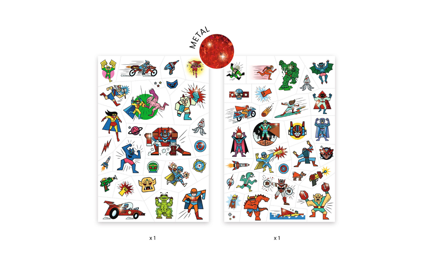 Two sticker sheets with tattoos to decorate the skin. Cut out your preferred superhero and apply it to your skin. The tattoos have been dermatologically tested.