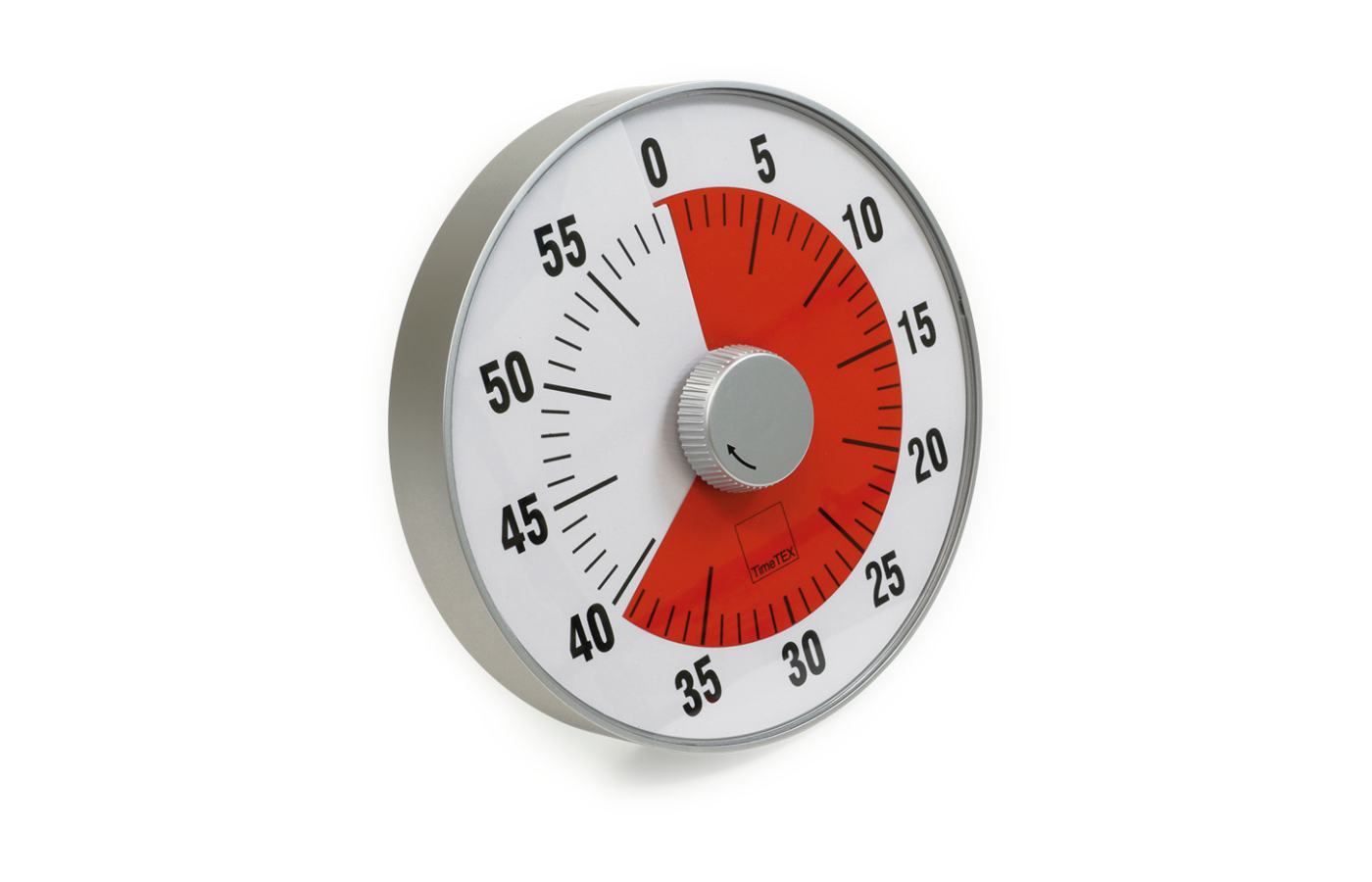 This running back clock shows students how much time is left to complete an assignment, down to the minute. What is special is that the time is displayed on a normal dial , which the children know from a regular clock, and the colored disk on it runs backwards.