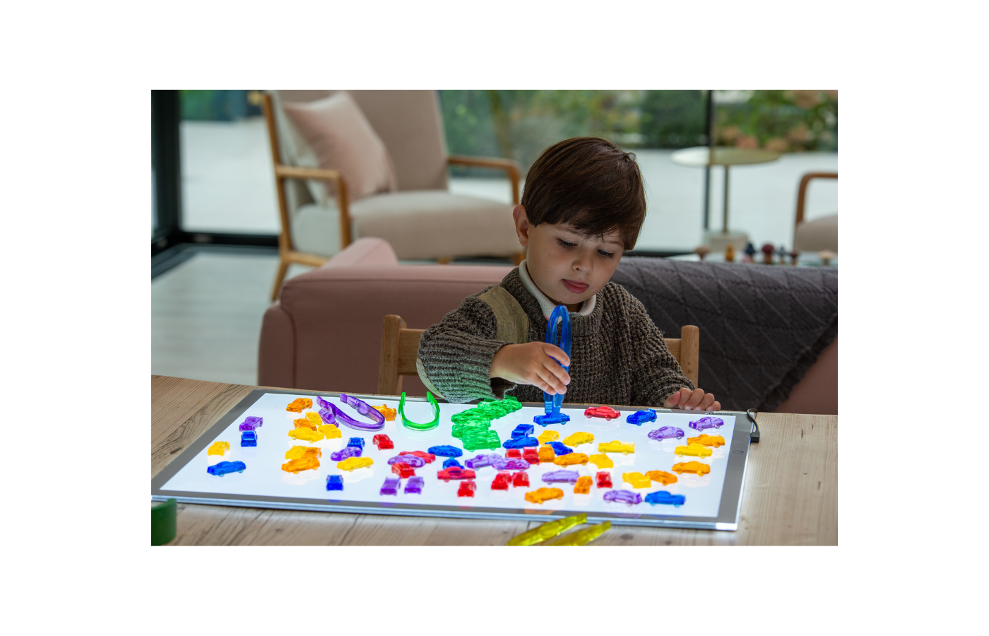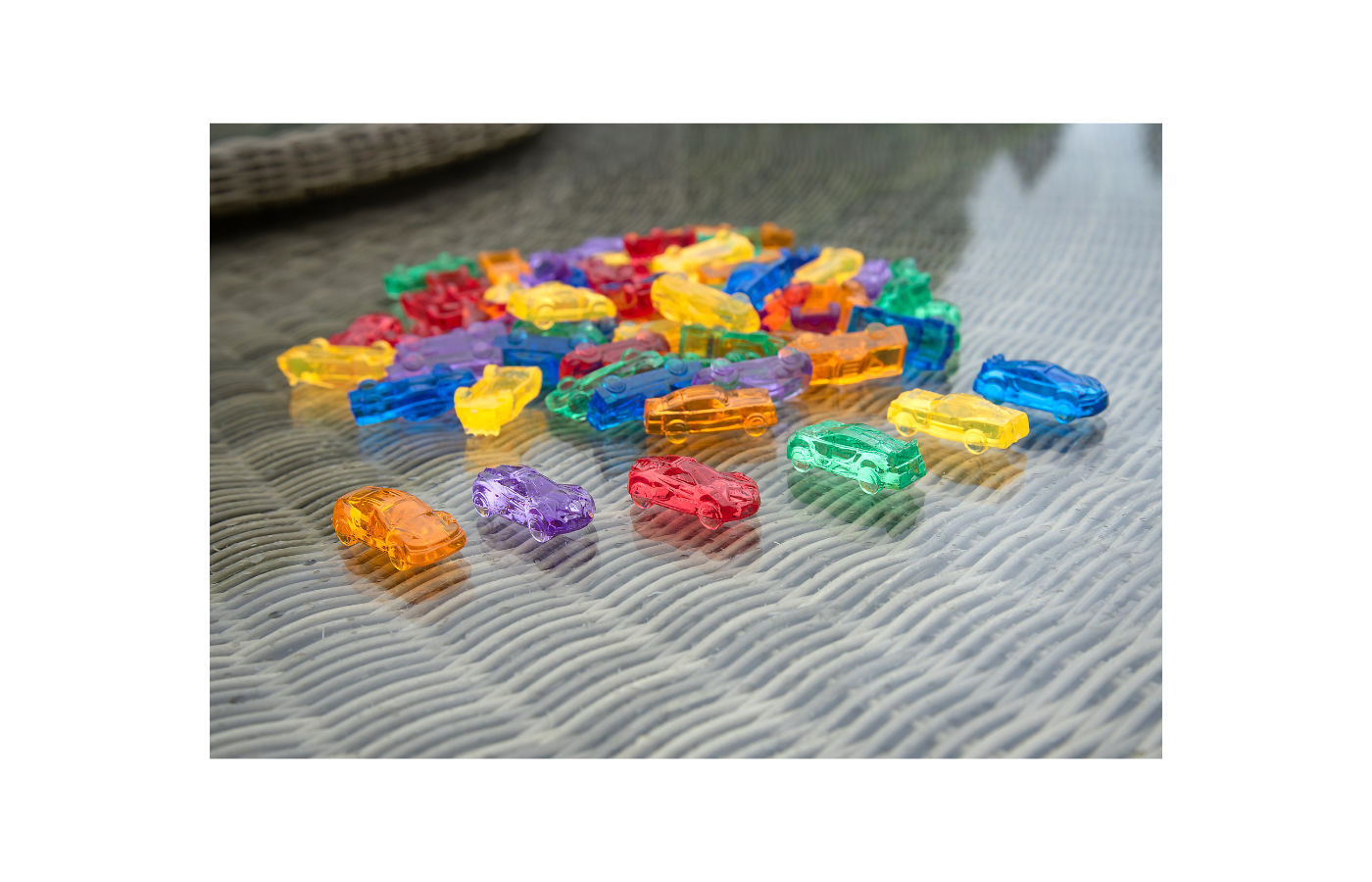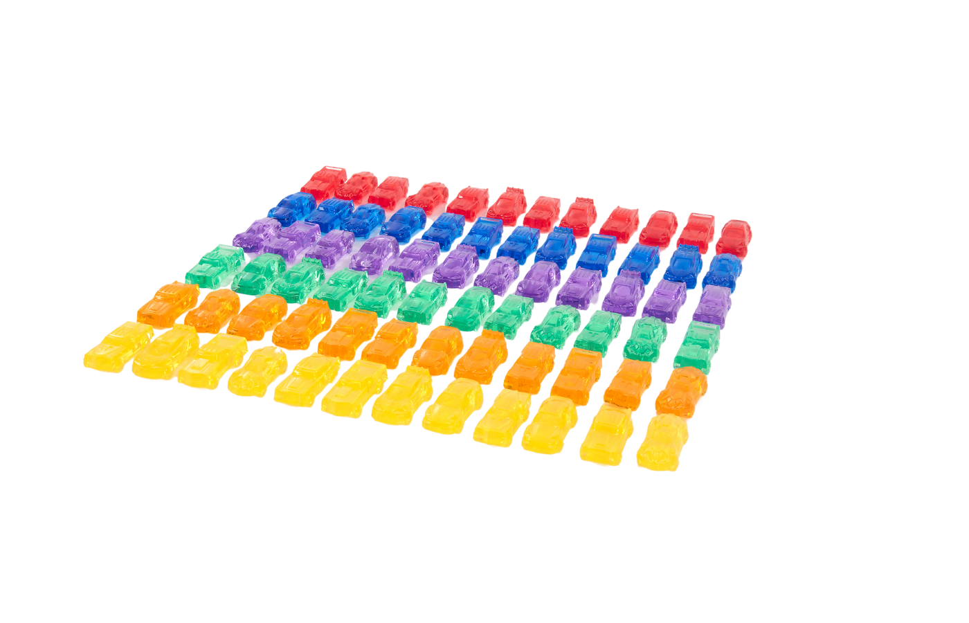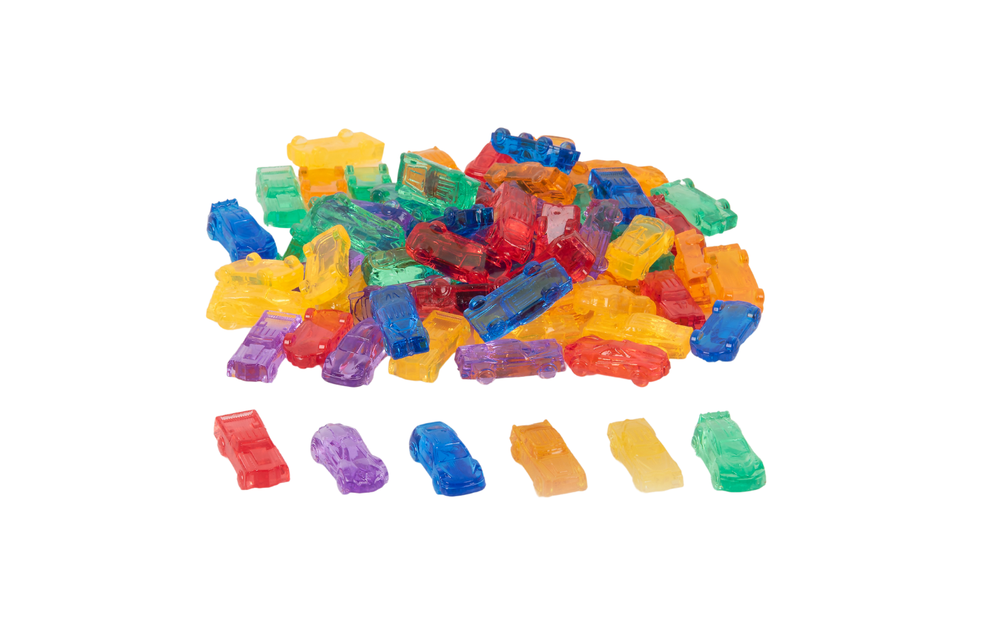 This set of 72 transparent cars, in 6 different colors and 6 different types, is great fun to use on the light table or for learning to sort. You can sort by color, size, or texture.