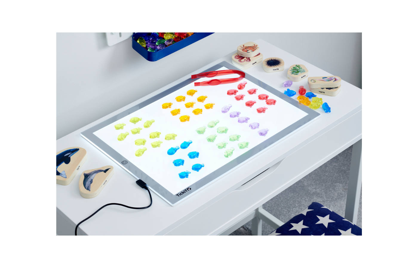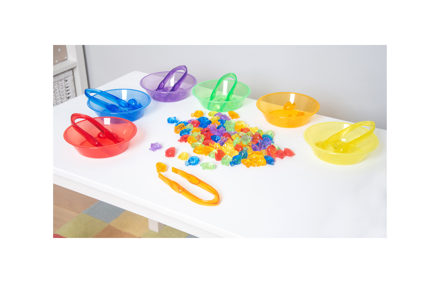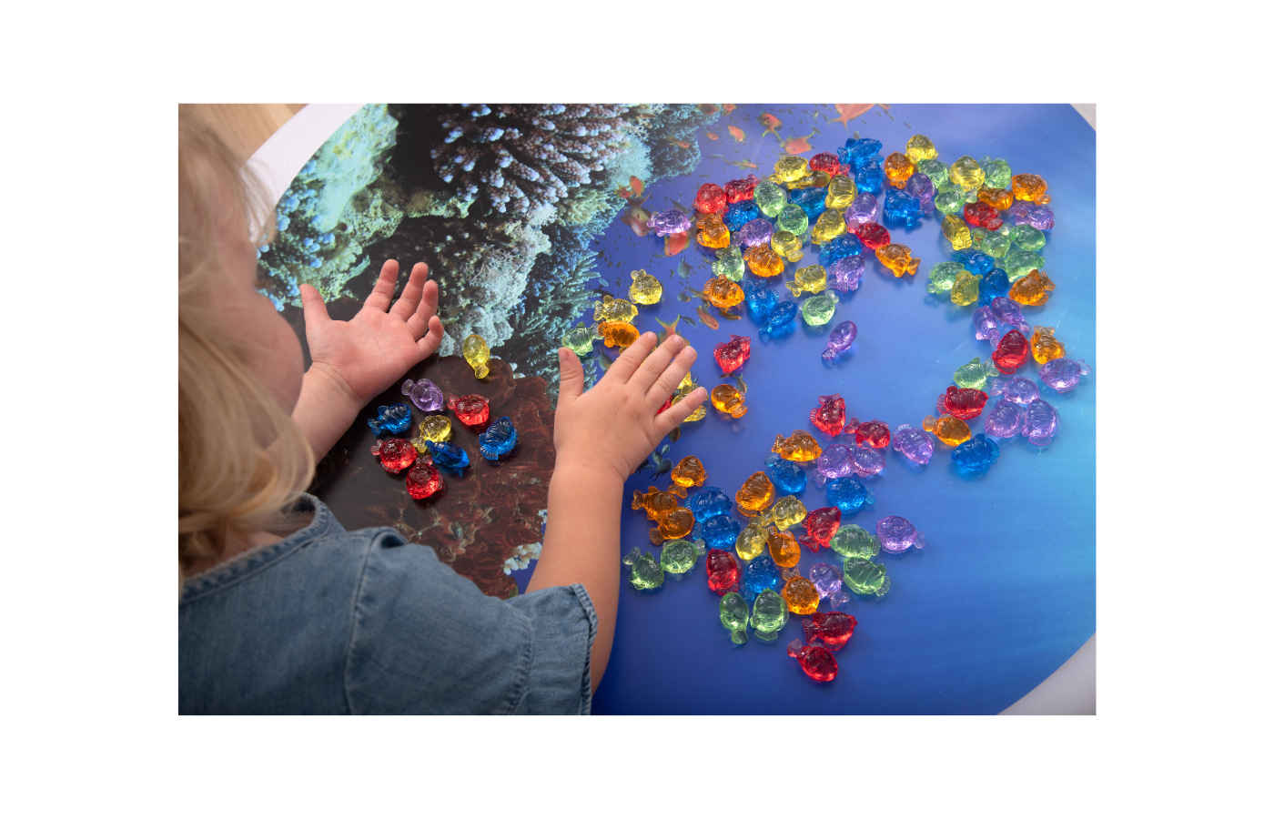 This set of 120 transparent fish, 6 different colors and 5 different species, is great fun to use on the light table or to learn to sort. You can sort by color, size or type of structure. You can place them on top of each other on the light table to mix the colors.
