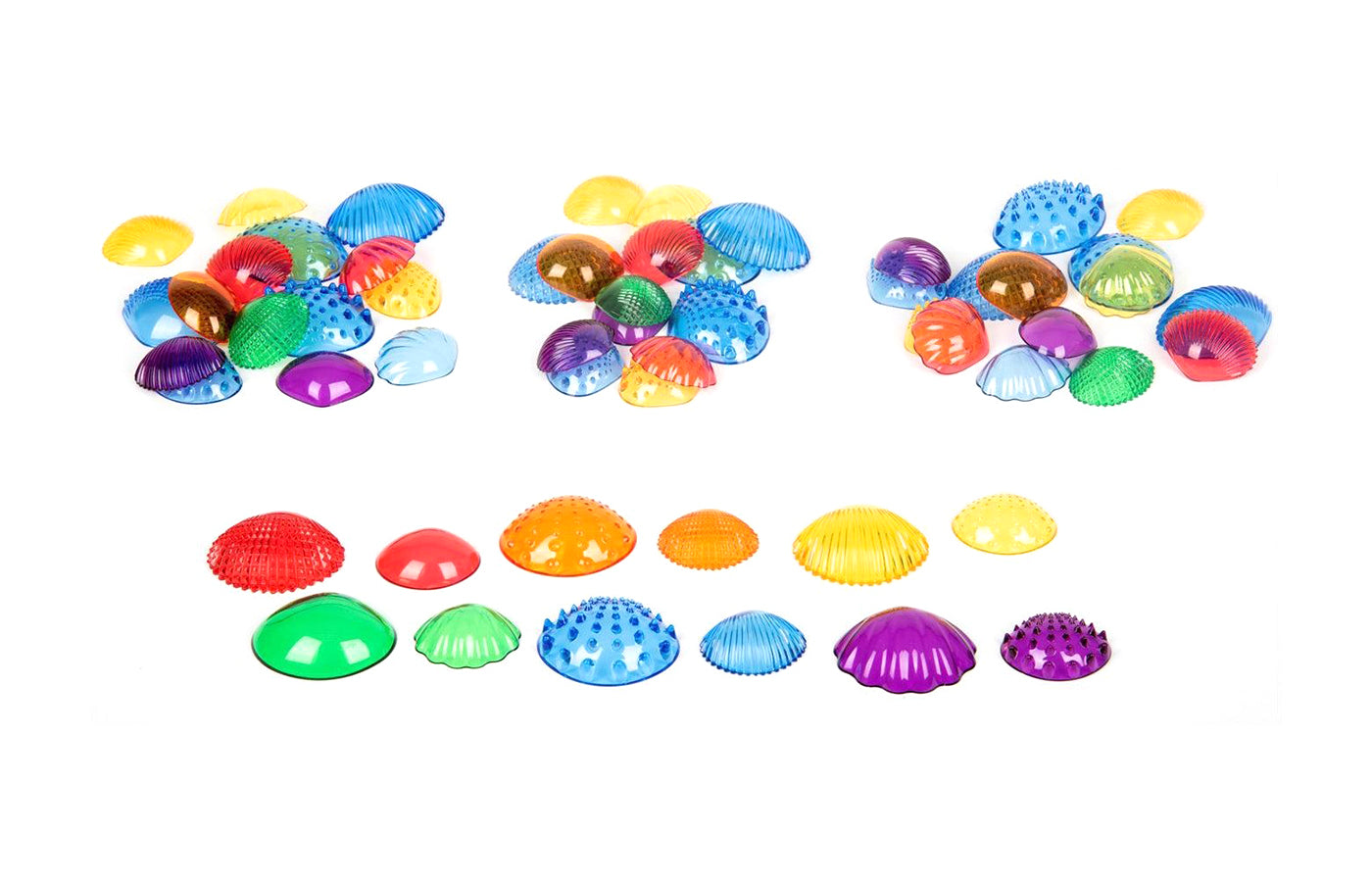 set of 108 tactile shells in 6 different colours, 2 different sizes and 6 different structures (smallest size 3.6 x 5.4 cm and largest size 4 x 7.2 cm)
