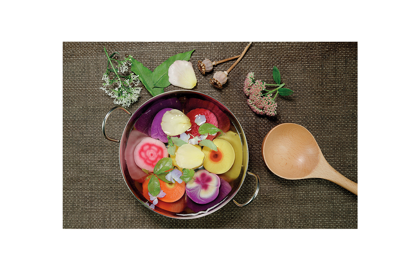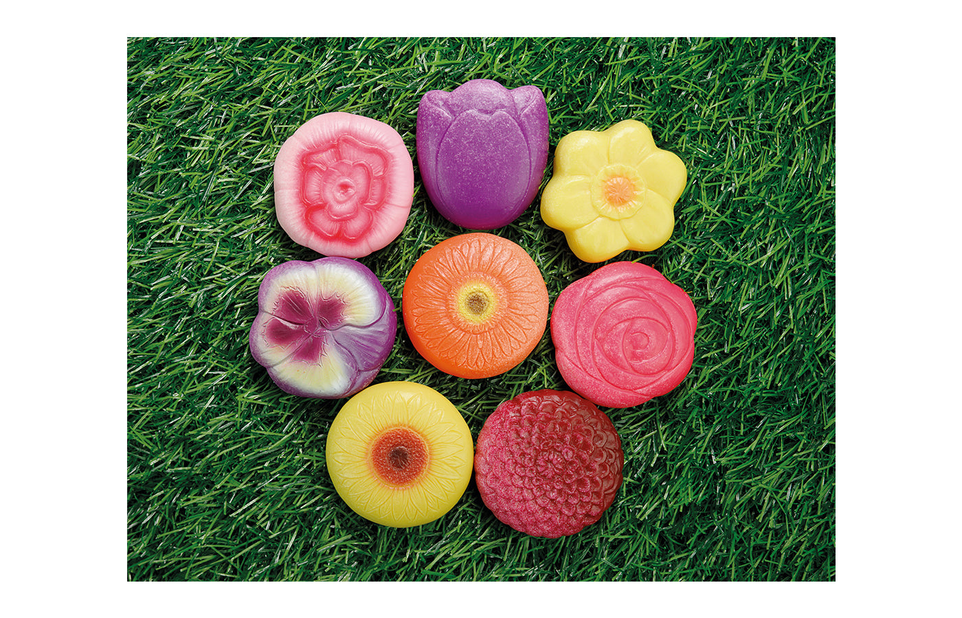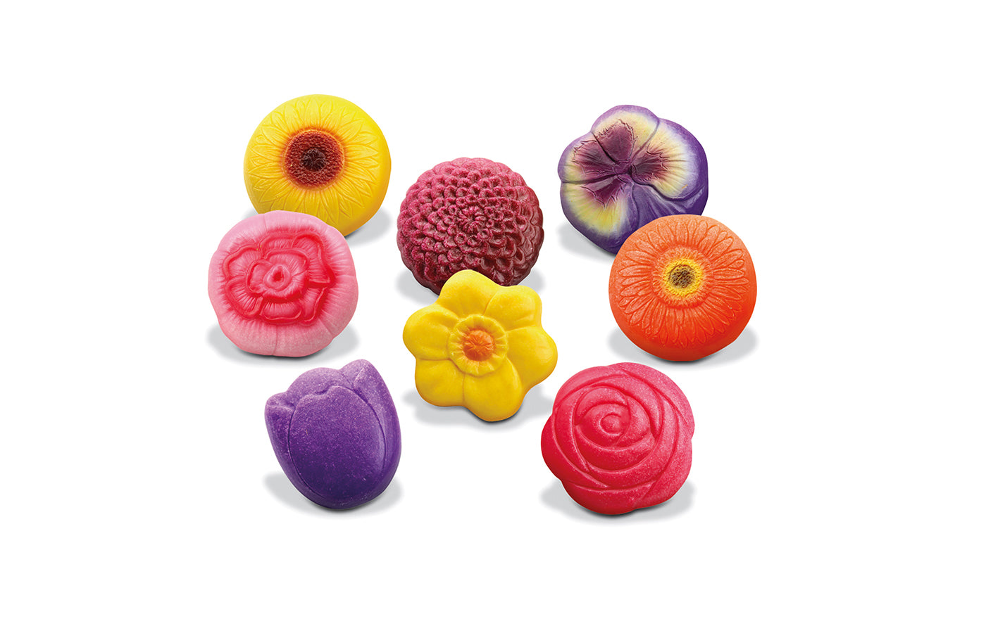 De set bevat acht stenen: anjer, narcis, dahlia, gerbera, viooltje, roos, zonnebloem en tulp.