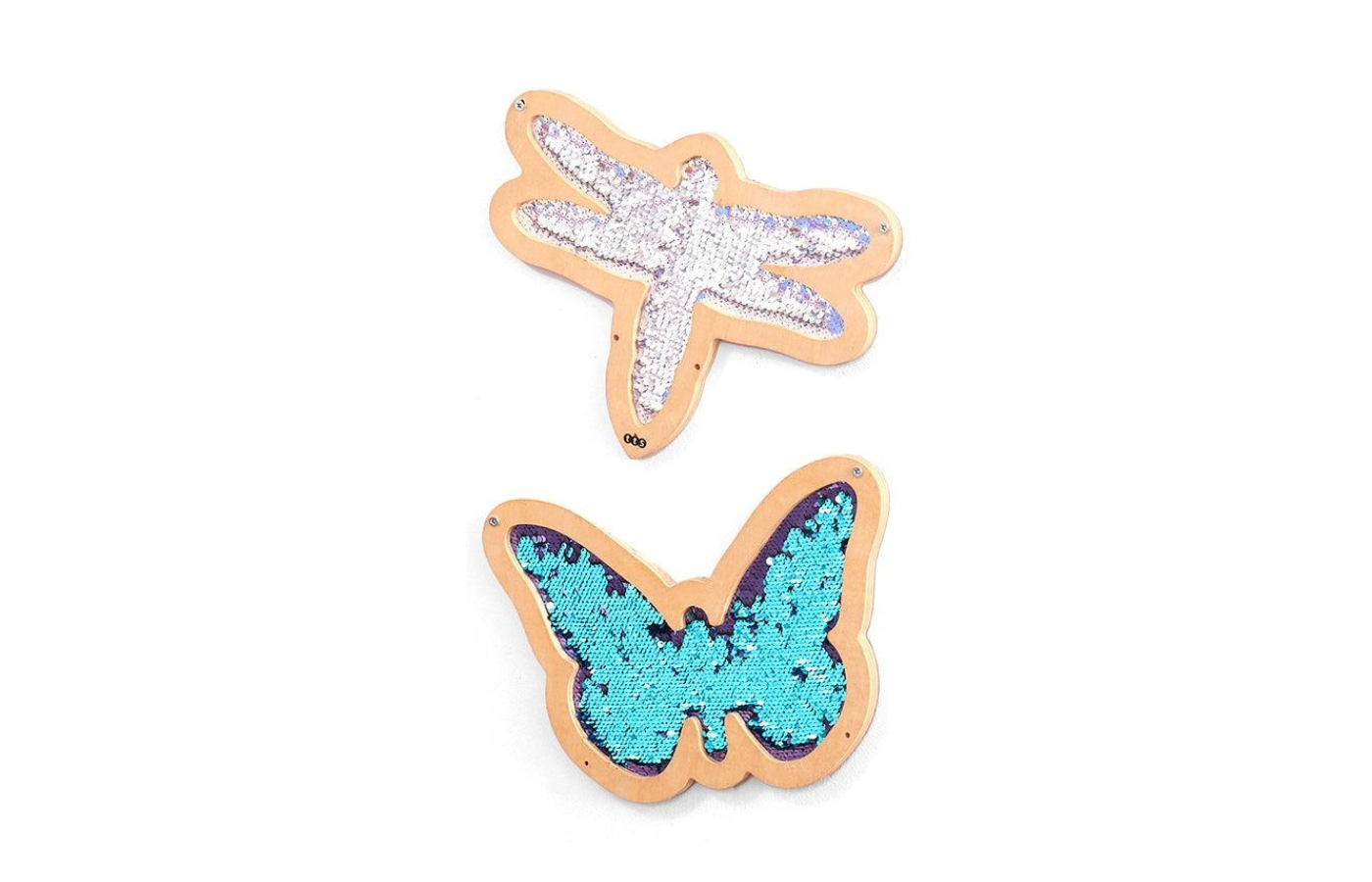 Set van 2 sensorische muurborden waarvan 1 vlinder en 1 libel. De dieren bestaan uit paillettenstof in een houten frame. De borden stimuleren de nieuwsgierigheid en ondersteunen de motoriek. Door de dieren te aaien, veranderen ze van kleur. Een mooie toevoeging aan muren, gangen, sensorische snoezelhoekjes en meer. De borden hebben een rustgevend, kalmerend effect op de kinderen door het voelen aan de fascinerende texturen en het glinsteren van de pailletten. Leuk in combinatie met de sensorische gras muurborden.