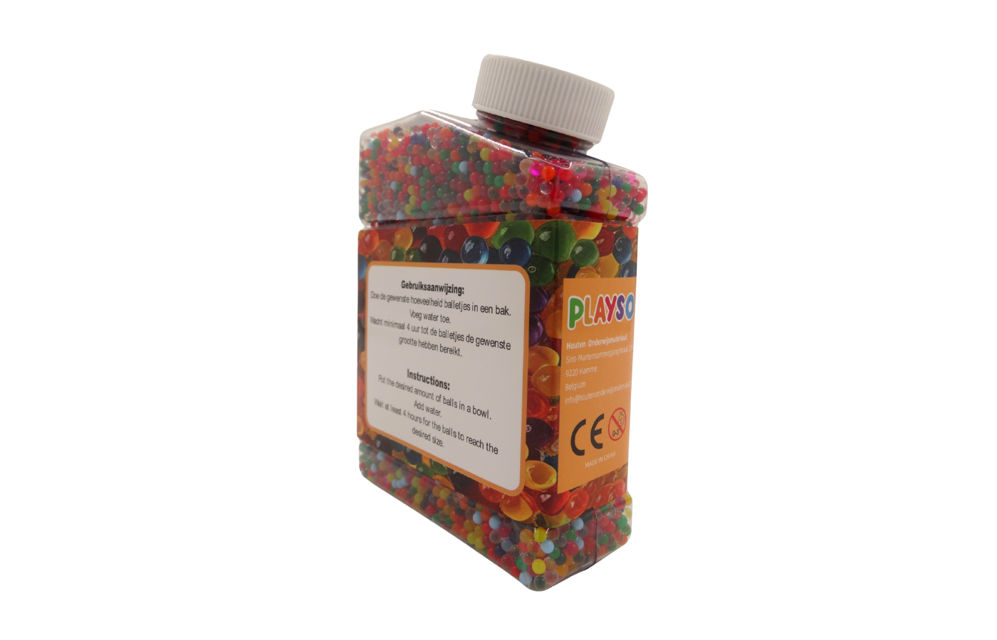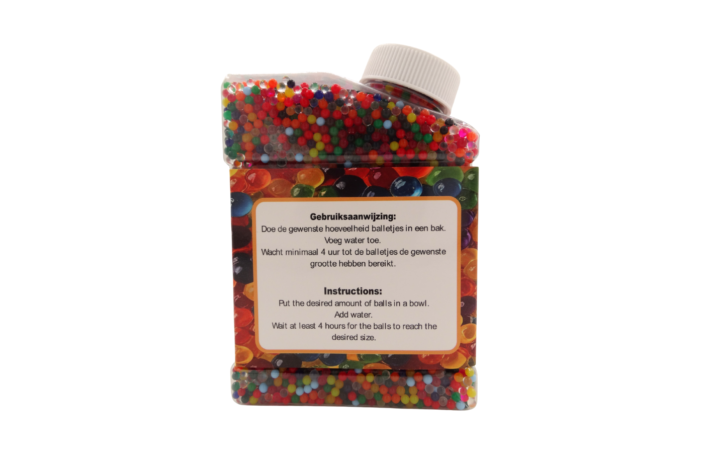 Het doosje bevat 250 gram waterparels. 20 gram van deze parels in combinatie met water geeft 1 liter waterparels.