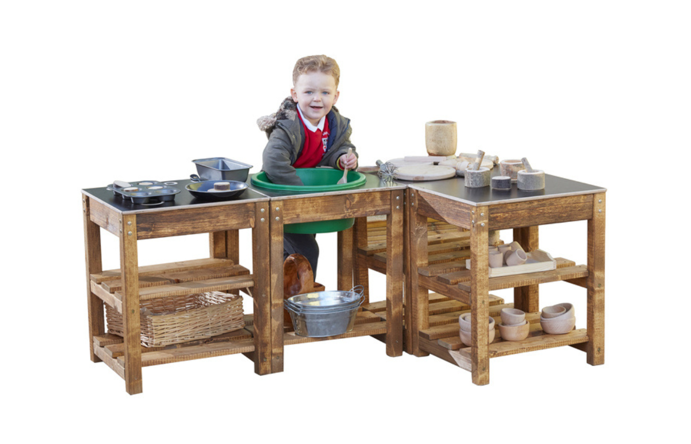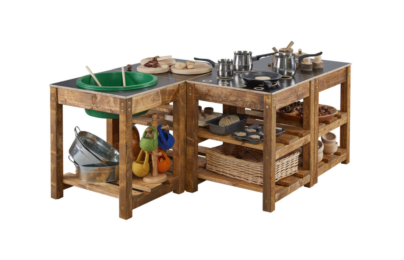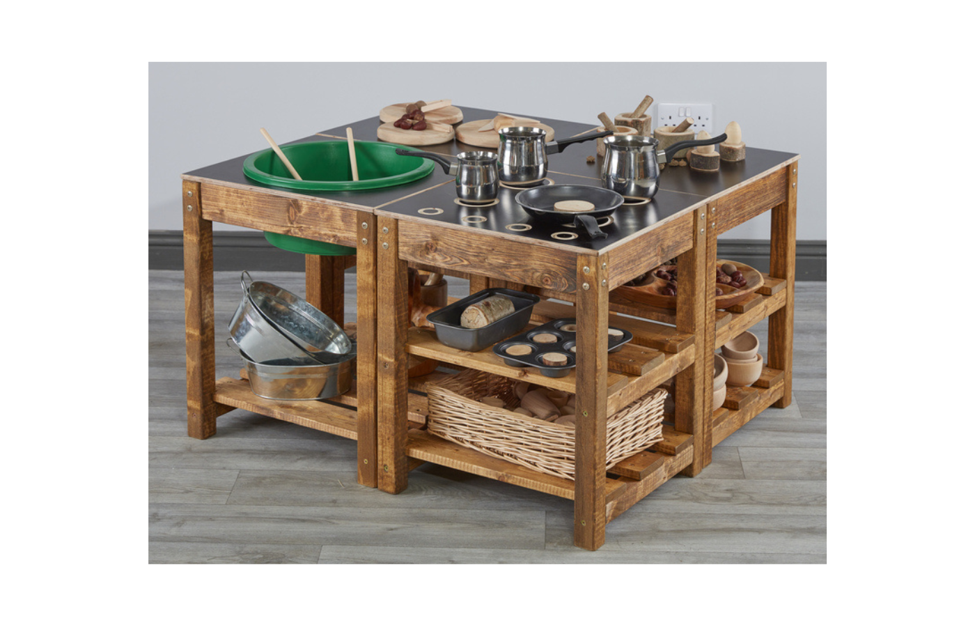 Deze set van vier keukenblokken is perfect voor peuters en kleuters en stimuleert fantasierijk spel en transformeert elke hoek van je klaslokaal of buitenruimte in een bruisende keuken.