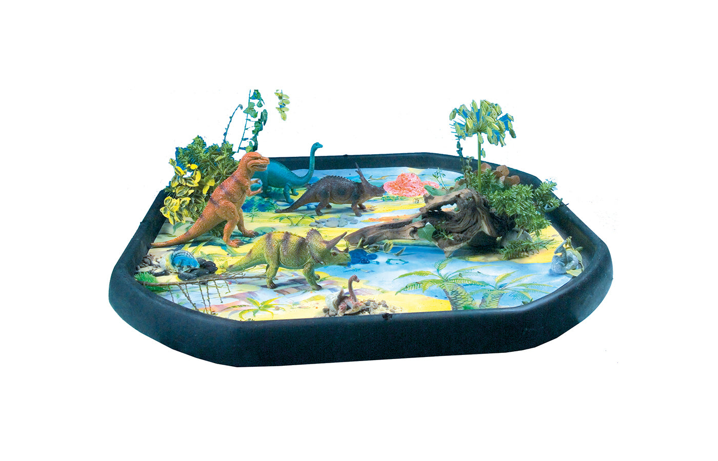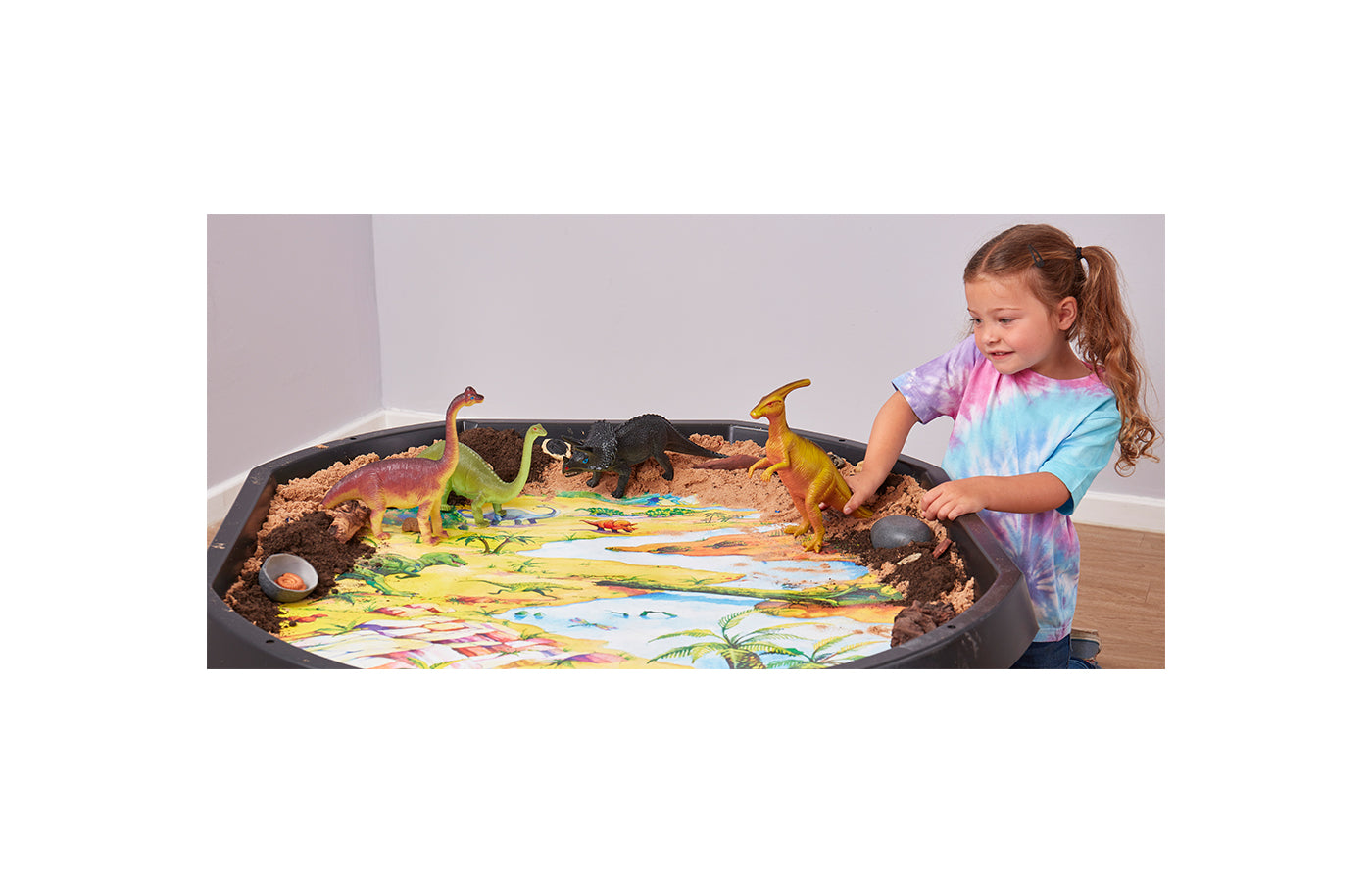 Beleef de spannendste avonturen met deze speelmat in het thema dinosaurussen. Te gebruiken in combinatie met de ontdektafel (Tuff Tray). De speelmat kan gebruikt worden met zowel natte als droge materialen.
